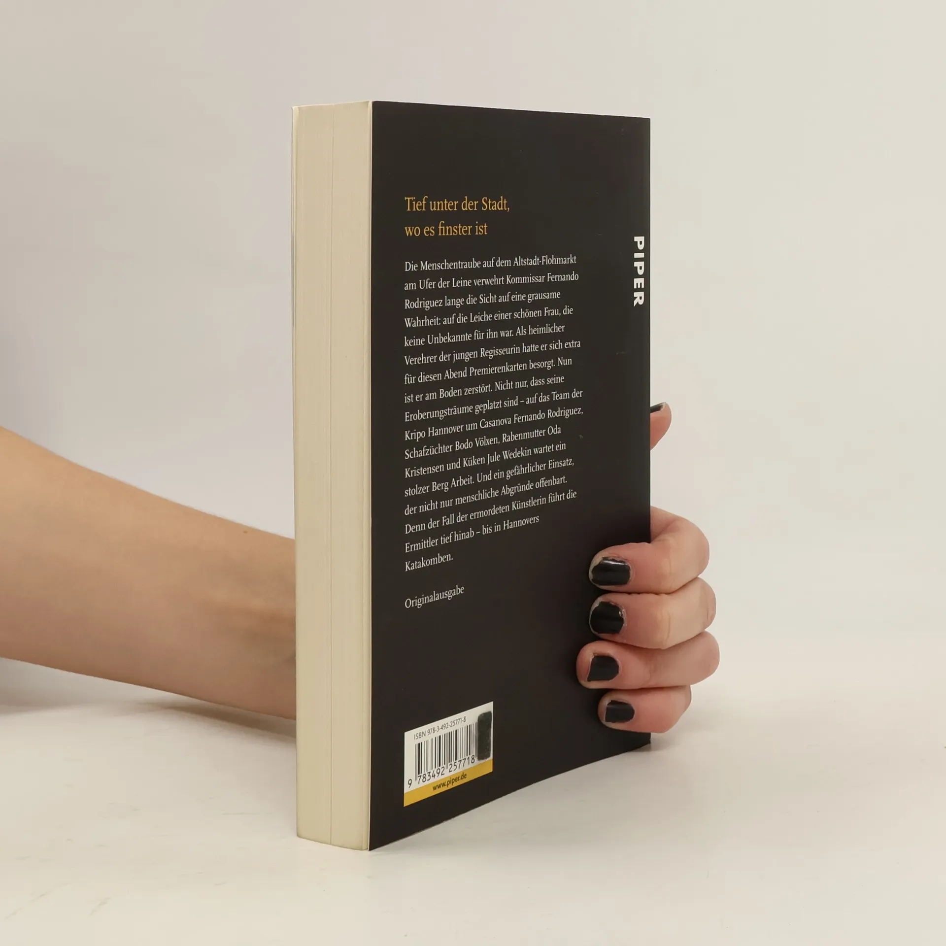 Die Menschentraube auf dem Altstadt-Flohmarkt am Ufer der Leine verwehrt Kommissar Fernando Rodriguez lange die Sicht auf eine grausame Wahrheit: auf die Leiche einer schönen Frau, die keine Unbekannte für ihn war. Als heimlicher Verehrer der jungen Regisseurin hatte er sich extra für diesen Abend Premierenkarten besorgt. Nun ist er am Boden zerstört. Nicht nur, dass seine Eroberungsträume geplatzt sind – auf das Team der Kripo Hannover um Casanova Rodriguez, Schafzüchter Bodo Völxen, Rabenmutter Oda Kristensen und Küken Jule Wedekin wartet ein stolzer Berg Arbeit. Und ein gefährlicher Einsatz, der nicht nur menschliche Abgründe offenbart. Denn der Fall der ermordeten Künstlerin führt die Ermittler tief hinab – bis in Hannovers Katakomben.