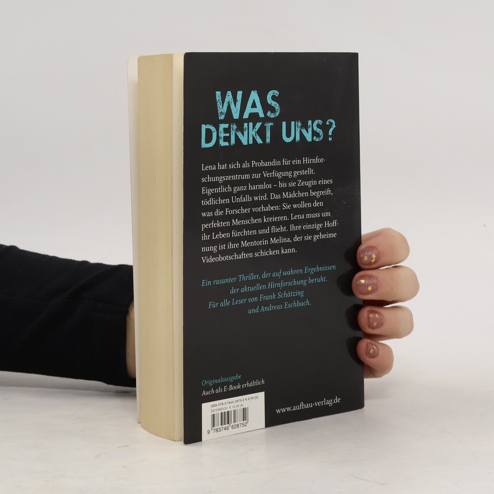 Was denkt uns? Lena, 14, ist Probandin am Hirn-Forschungsinstitut Zucker in Berlin. Als sie nicht zum Termin erscheint und ihre Betreuerin Melina eine kryptische Videobotschaft mit schockierenden Bildern erhält, wird klar: Sie ist auf der Flucht. Lenas Spur führt in die Bergwelt Graubündens, wo für bewährte Probanden nervenkitzelnde Trekkingtouren organisiert werden. Melina gerät in Konflikt mit Lenas faszinierend exzentrischem Vater, der die Gefahr herunterspielt, zugleich aber Schlüssel dafür ist, das Mädchen zu retten. Im Nebel der Alpenwelt blitzen widersprüchliche Bilder auf: Geht Lena auf ihrer Flucht über Leichen? Sucht das Institut ganz gezielt Jugendliche als „frisches Forschungsmaterial“? Ein junges Mädchen hat etwas gesehen, das es nie hätte sehen dürfen: Nach einem perfiden Plan soll der perfekte Mensch entstehen – Grund genug, nicht nur um ihr Leben zu fürchten. Ein rasanter Thriller, der auf wahren Ergebnissen der aktuellen Hirnforschung beruht. Für alle Leser von Frank Schätzing und Andreas Eschbach.