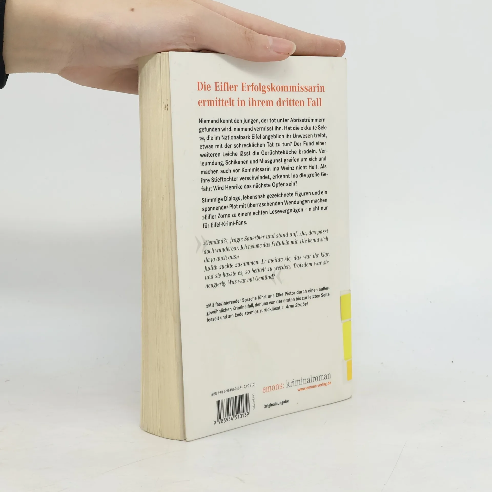 Niemand kennt den Jungen, der tot unter Abrisstrümmern gefunden wird, niemand vermisst ihn. Hat die okkulte Sekte, die im Nationalpark Eifel angeblich ihr Unwesen treibt, etwas mit der schrecklichen Tat zu tun? Der Fund einer weiteren Leiche lässt die Gerüchteküche brodeln. Verleumdung, Schikanen und Missgunst greifen um sich und machen auch vor Kommissarin Ina Weinz nicht Halt. Als ihre Stieftochter verschwindet, erkennt Ina die große Gefahr: Wird Henrike das nächste Opfer sein? Stimmige Dialoge, lebensnah gezeichnete Figuren und ein spannender Plot mit überraschenden Wendungen machen „Eifler Zorn“ zu einem echten Lesevergnügen - nicht nur für Eifel-Krimi-Fans.