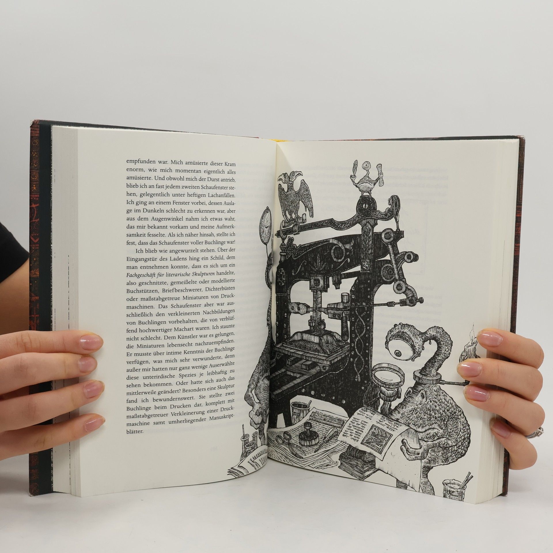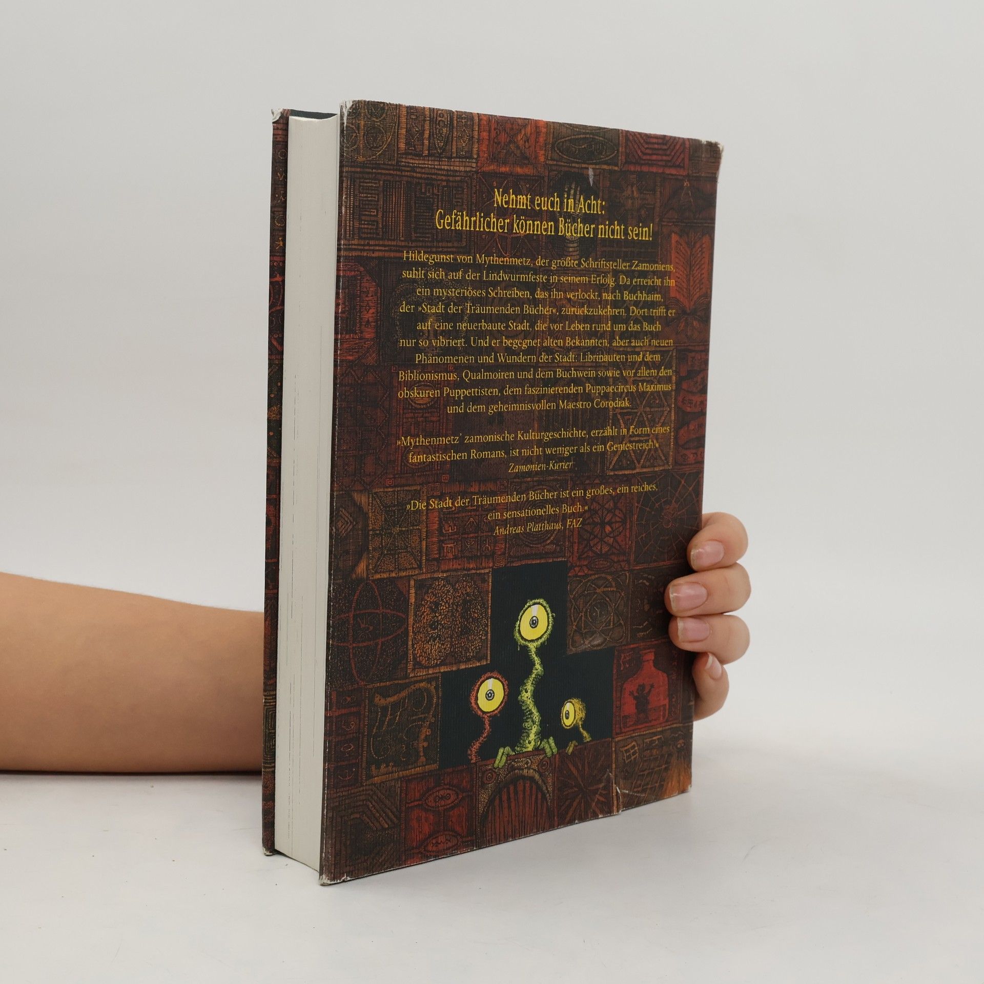 Hildegunst von Mythenmetz kehrt nach über zweihundert Jahren in die Stadt der Träumenden Bücher zurück, die einst von einem verheerenden Feuersturm zerstört wurde. Als größter Schriftsteller Zamoniens genießt er seinen Ruhm auf der Lindwurmfeste, bis ihn eine verstörende Nachricht erreicht, die ihm neuen Lebenssinn gibt. Ein rätselhafter Brief zieht ihn zurück nach Buchhaim, wo die Stadt prächtig wiederaufgebaut und zu einer pulsierenden Metropole der Literatur geworden ist, voller Buchverrückter. Kaum angekommen, wird Mythenmetz von den Abenteuern der Stadt mitgerissen. Er trifft alte Bekannte wie Inazea Anazazi und Ojahnn Golgo van Fontheweg sowie neue Bewohner und Phänomene, darunter die mysteriösen Biblionauten und das »Unsichtbare Theater«. Während er dem Rätsel auf der Spur ist, verirrt er sich immer tiefer im »Labyrinth der Träumenden Bücher«, das die Geschicke Buchhaims geheimnisvoll lenkt. Schließlich gerät er in einen Strudel von Ereignissen, der alle bisherigen Abenteuer übertrifft. Die Ausstattung umfasst über 100 Illustrationen.