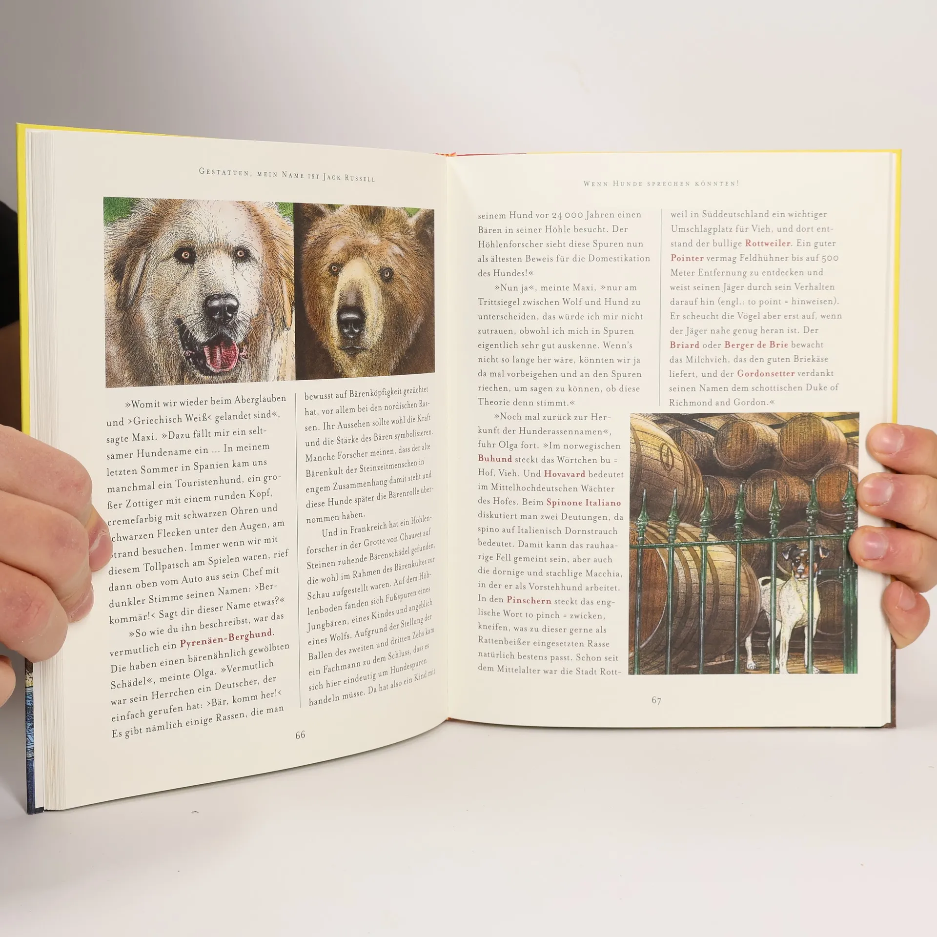 Die erfahrene Bernhardinerhündin Olga und der junge Pharaonenhund Maxi liegen vor dem Kamin. Maxi stellt Fragen, wie Kinder sie stellen, Olga antwortet. In 18 Kapiteln lässt der ehemalige Zoodirektor Henning Wiesner die Hundedame Verblüffendes erzählen, zum Beispiel, warum Schlappohren vorteilhaft und Küsschen ungesund sein können. Der Leser erfährt aber auch ganz praktische Dinge. So kann er lernen, wie man einem Hund das Betteln bei Tisch abgewöhnt, und erfährt, wie Hunde wahre Schätze erschnuppern. Dieses ungewöhnliche Hundebuch bietet erstaunliche Einblicke in die Evolution des ältesten aller Haustiere. Mit zahlreichen stimmungsvollen Illustrationen von Günter Mattei.