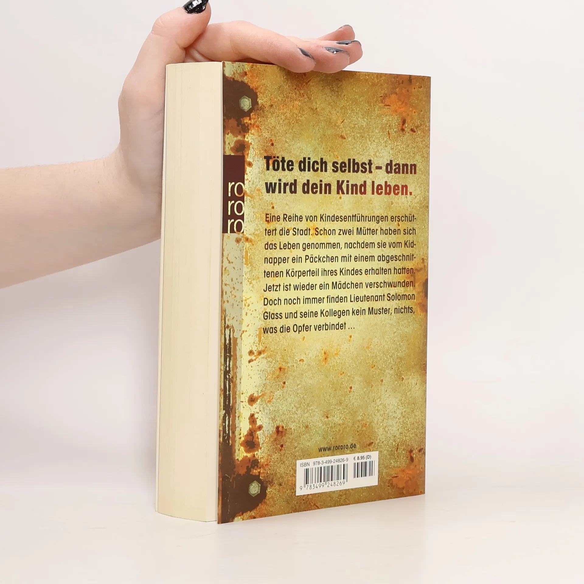 Töte dich selbst – dann wird dein Kind leben. Eine Reihe von Kindesentführungen erschüttert die Stadt. Schon zwei Mütter haben sich das Leben genommen, nachdem sie vom Kidnapper ein Päckchen mit einem abgeschnittenen Körperteil ihres Kindes erhalten hatten. Jetzt ist wieder ein Mädchen verschwunden. Doch noch immer finden Lieutenant Solomon Glass und seine Kollegen kein Muster, nichts, was die Opfer verbindet ...