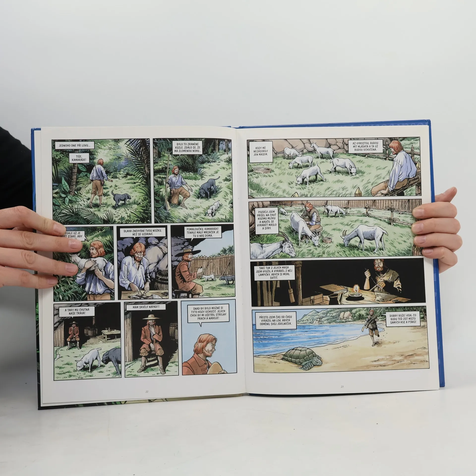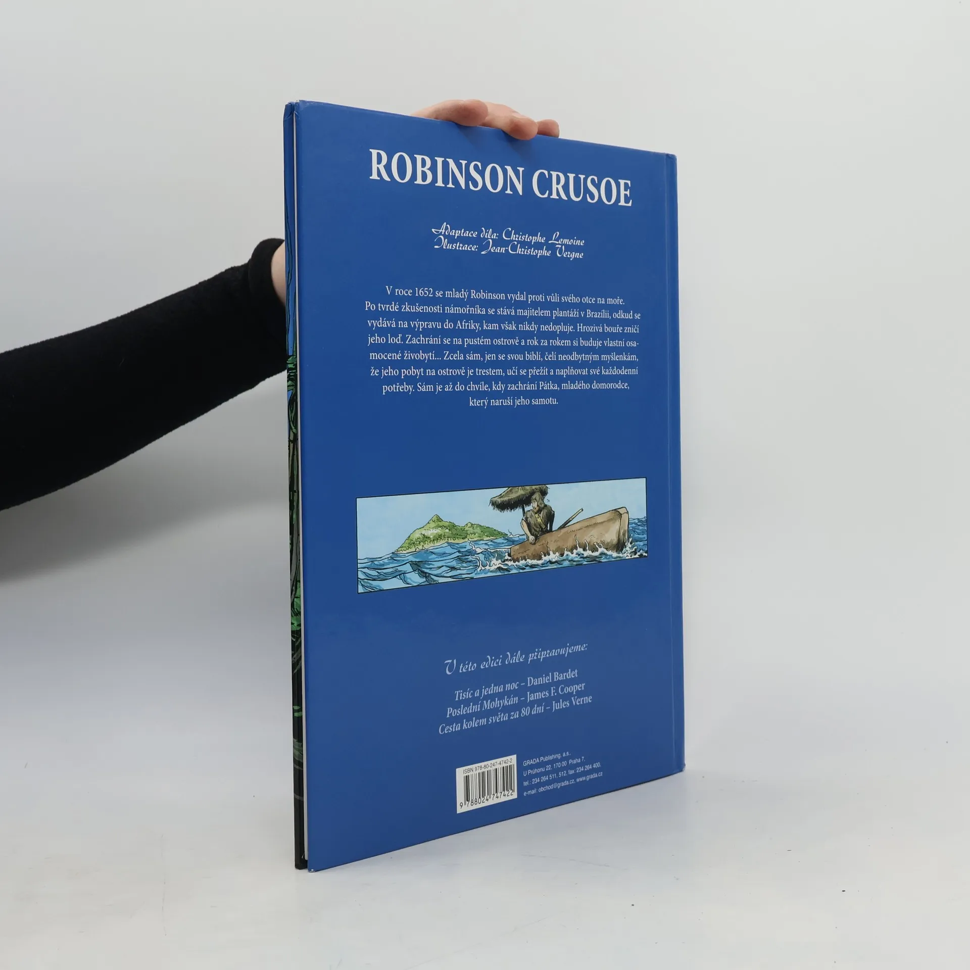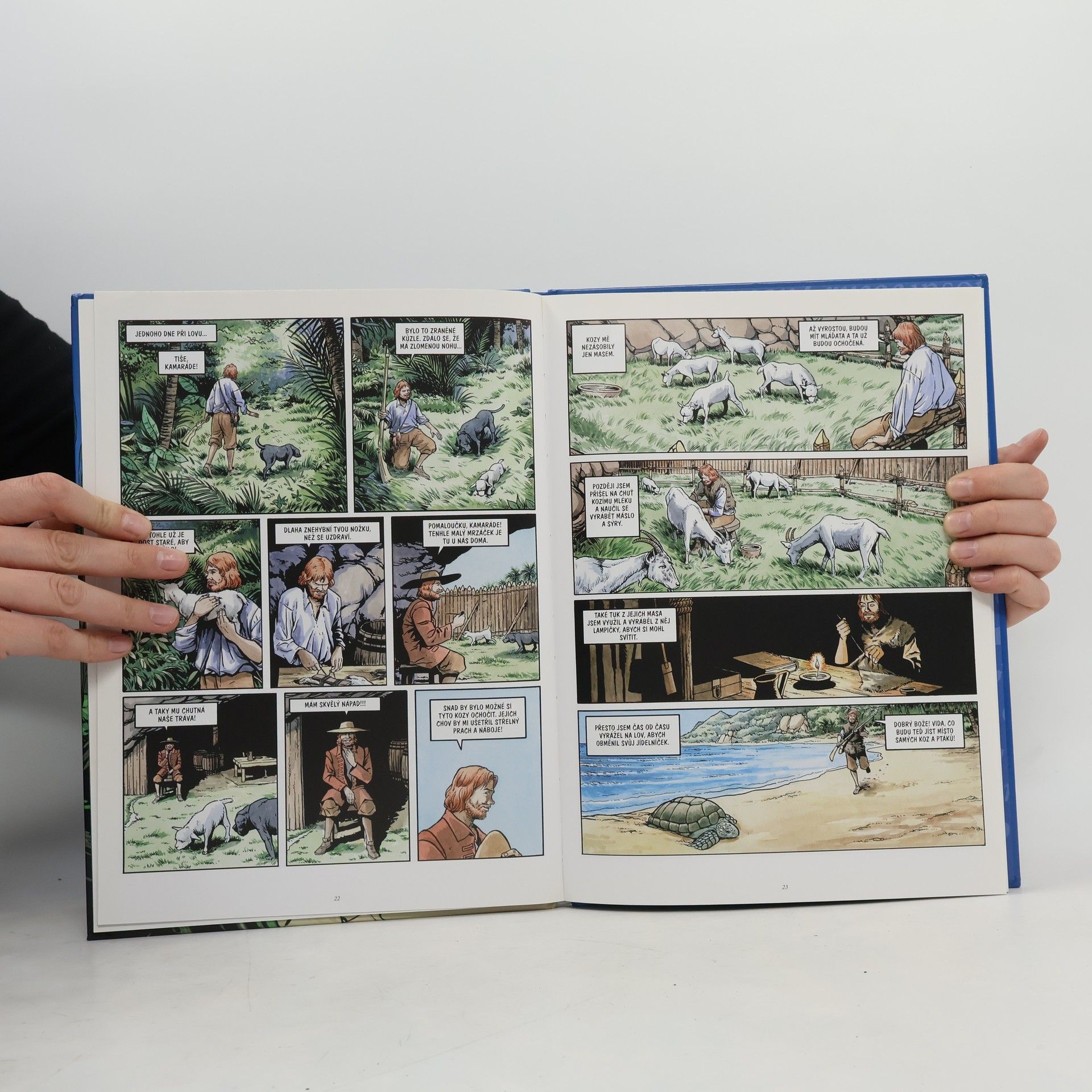 Nový komiks velkého formátu! Známý a velmi oblíbený příběh anglického námořníka, který se zachrání po ztroskotání lodi na pustém ostrově a musí se naučit se o sebe postarat. Poznává svůj ostrov, snaží se ochočit zvířata, pěstovat banány a další jedné plodiny, hledá pitnou vodu a staví si přístřeší. Robinsonovi se podaří zachránit jednoho z domorodců, kteří občas na ostrov přijíždějí na svých lodích. Spřátelí se a Pátek, jak jej pojemnovat mu dělá společnost a pomáhá. Po mnoha letech života na neobydleném ostrově se přece jen objeví loď, která Robinsona i Pátka zachrání a doveze je zpět do Anglie. V závěru knihy je informativní text o autorovi a historie celého příběhu.