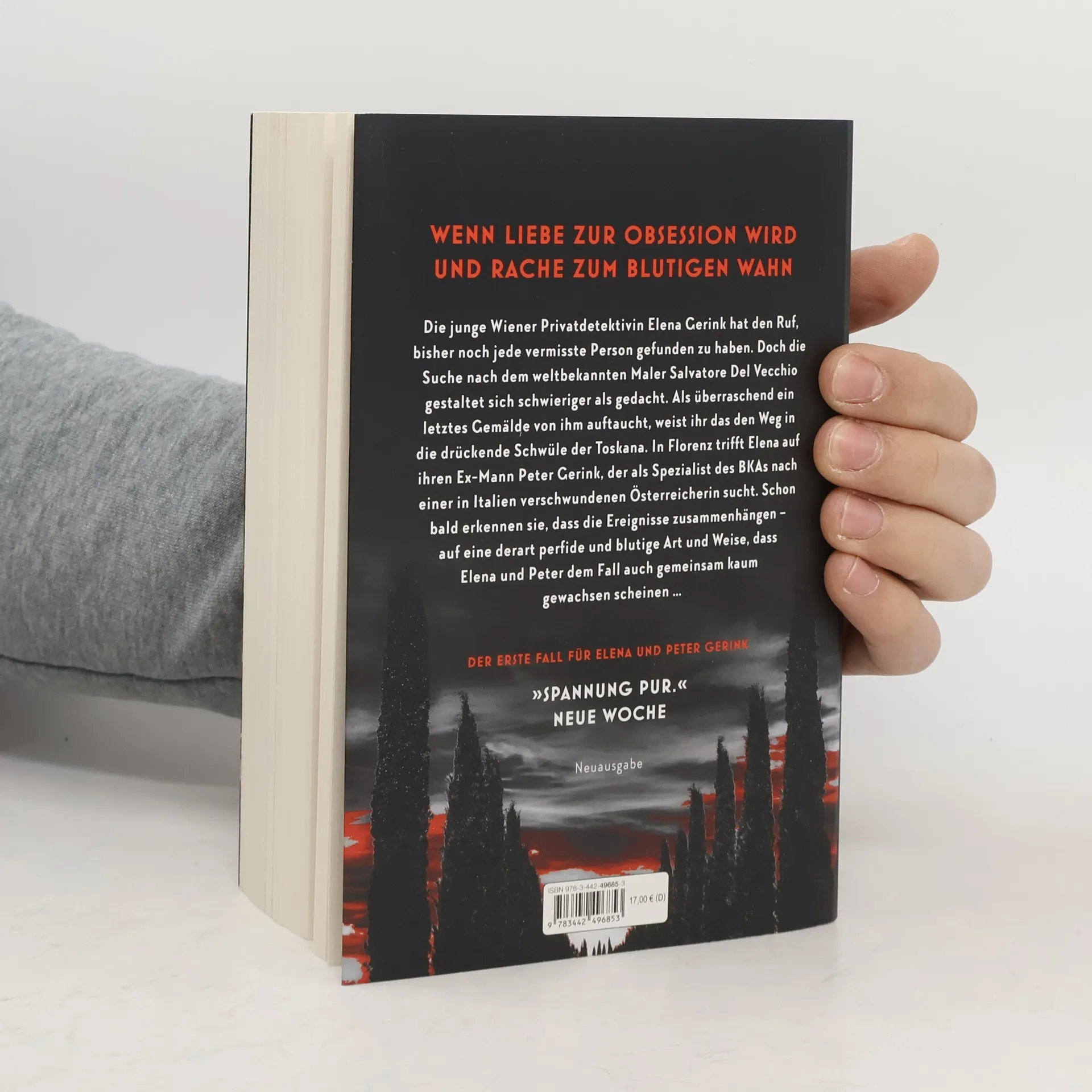 Wenn Liebe zur Obsession wird und Rache zum blutigen Wahn ... Die junge Wiener Privatdetektivin Elena Gerink hat den Ruf, bisher noch jede vermisste Person gefunden zu haben. Doch die Suche nach dem verschwundenen weltbekannten Maler Salvatore Del Vecchio gestaltet sich schwieriger als gedacht. Als überraschend ein letztes Gemälde von ihm auftaucht, weist ihr das den Weg in die drückende Schwüle der Toskana. In Florenz trifft Elena auf ihren Ex-Mann Peter Gerink, der als Spezialist des Bundeskriminalamts nach einer in Italien verschwundenen Österreicherin sucht. Schon bald erkennen sie, dass die Ereignisse zusammenhängen – auf eine derart perfide und blutige Art und Weise, dass Elena und Peter dem Fall auch gemeinsam kaum gewachsen scheinen ...