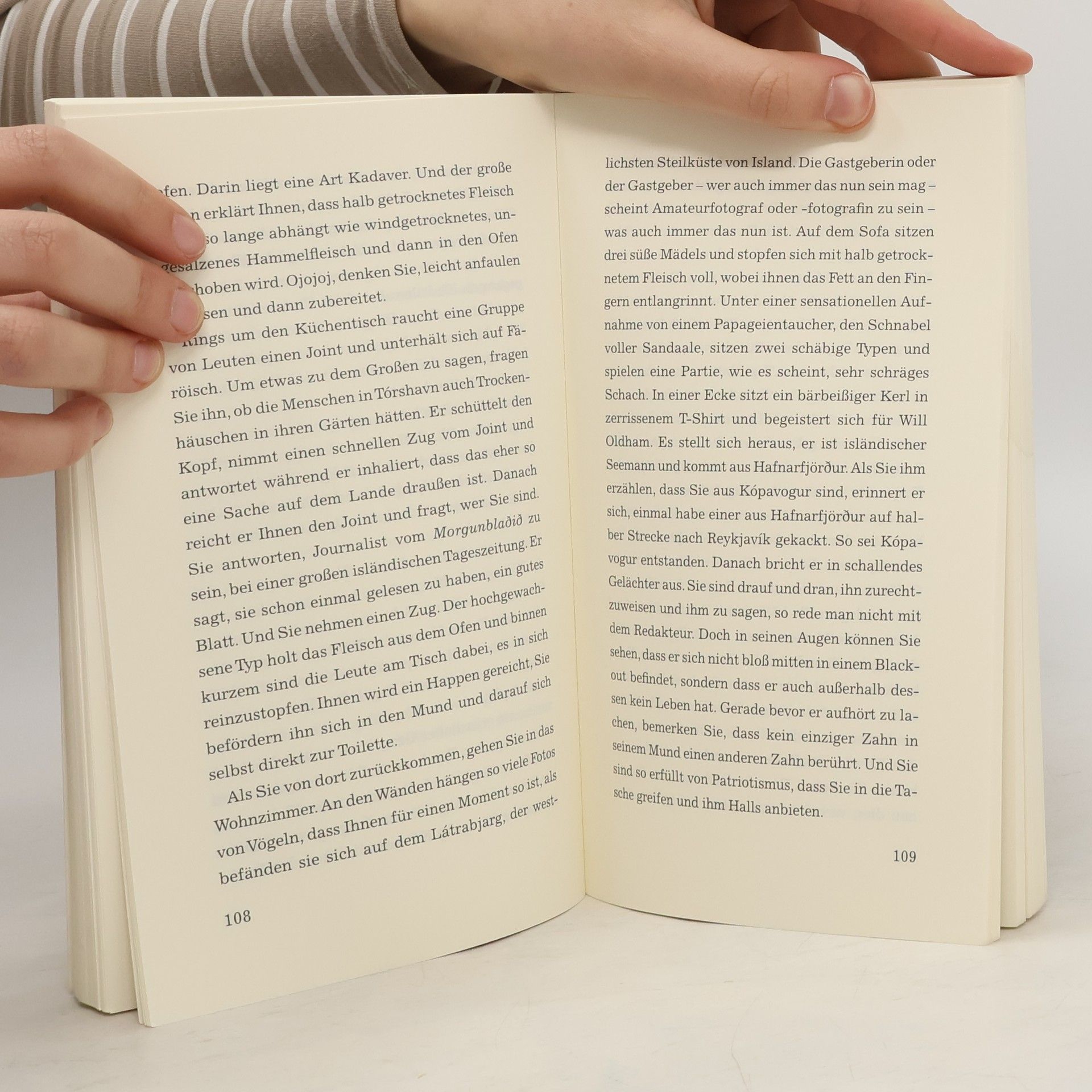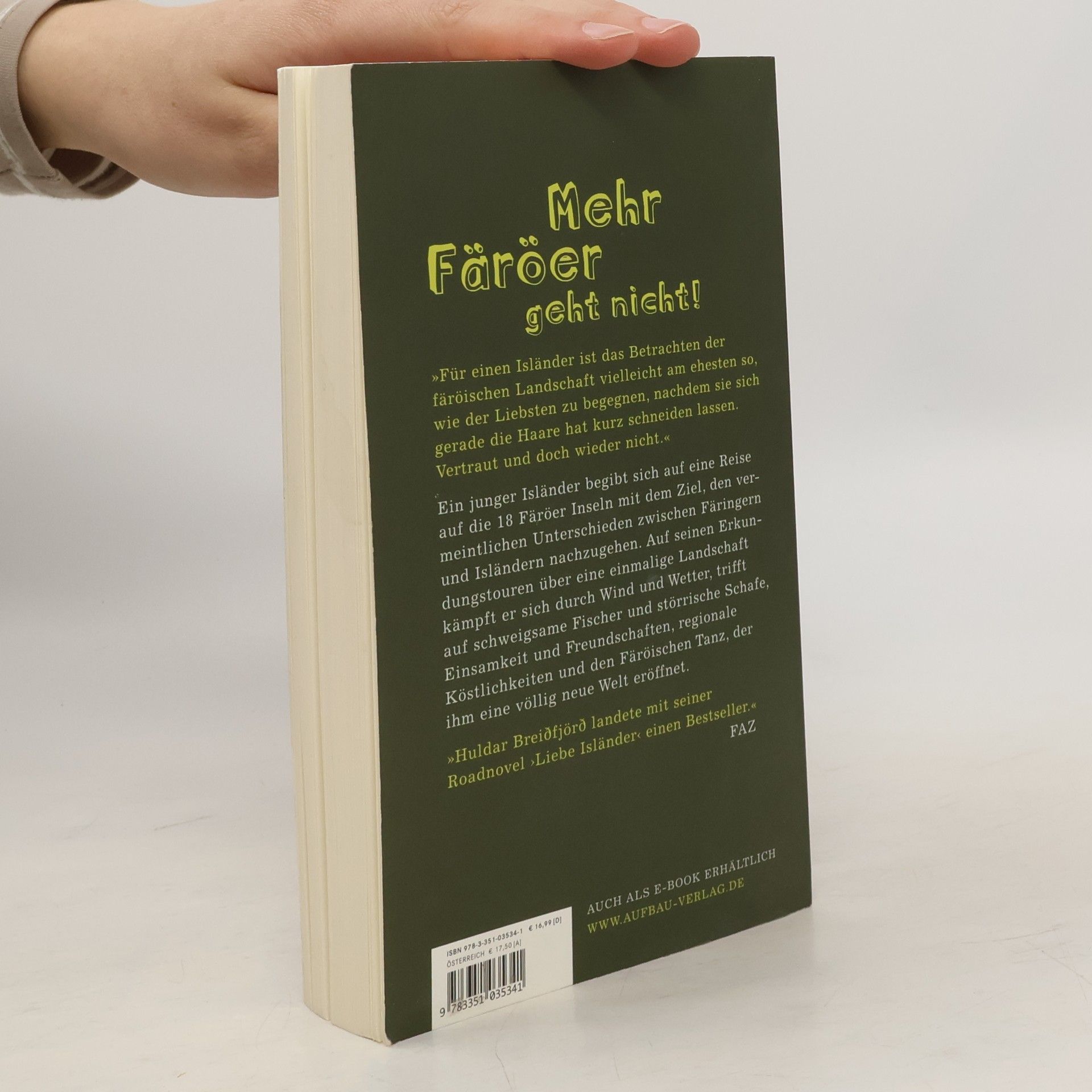 Mehr Färöer geht nicht! »Für einen Isländer ist das Betrachten der färöischen Landschaft vielleicht am ehesten so wie der Liebsten zu begegnen, nachdem sie sich gerade die Haare hat kurz schneiden lassen. Vertraut und doch wieder nicht.« Ein junger Isländer begibt sich auf eine Reise auf die 18 Färöer mit dem Ziel, den vermeintlichen Unterschieden zwischen Färingern und Isländern nachzugehen. Auf seinen Erkundungstouren über eine einmalige Landschaft kämpft er sich durch Wind und Wetter, trifft auf schweigsame Fischer und störrische Schafe, Einsamkeit und Freundschaften, regionale Köstlichkeiten und den Färöischen Tanz, der ihm eine völlig neue Welt eröffnet. »Huldar Breiðfjörð landete mit seiner Roadnovel „Liebe Isländer“ einen Bestseller.« Frankfurter Allgemeine