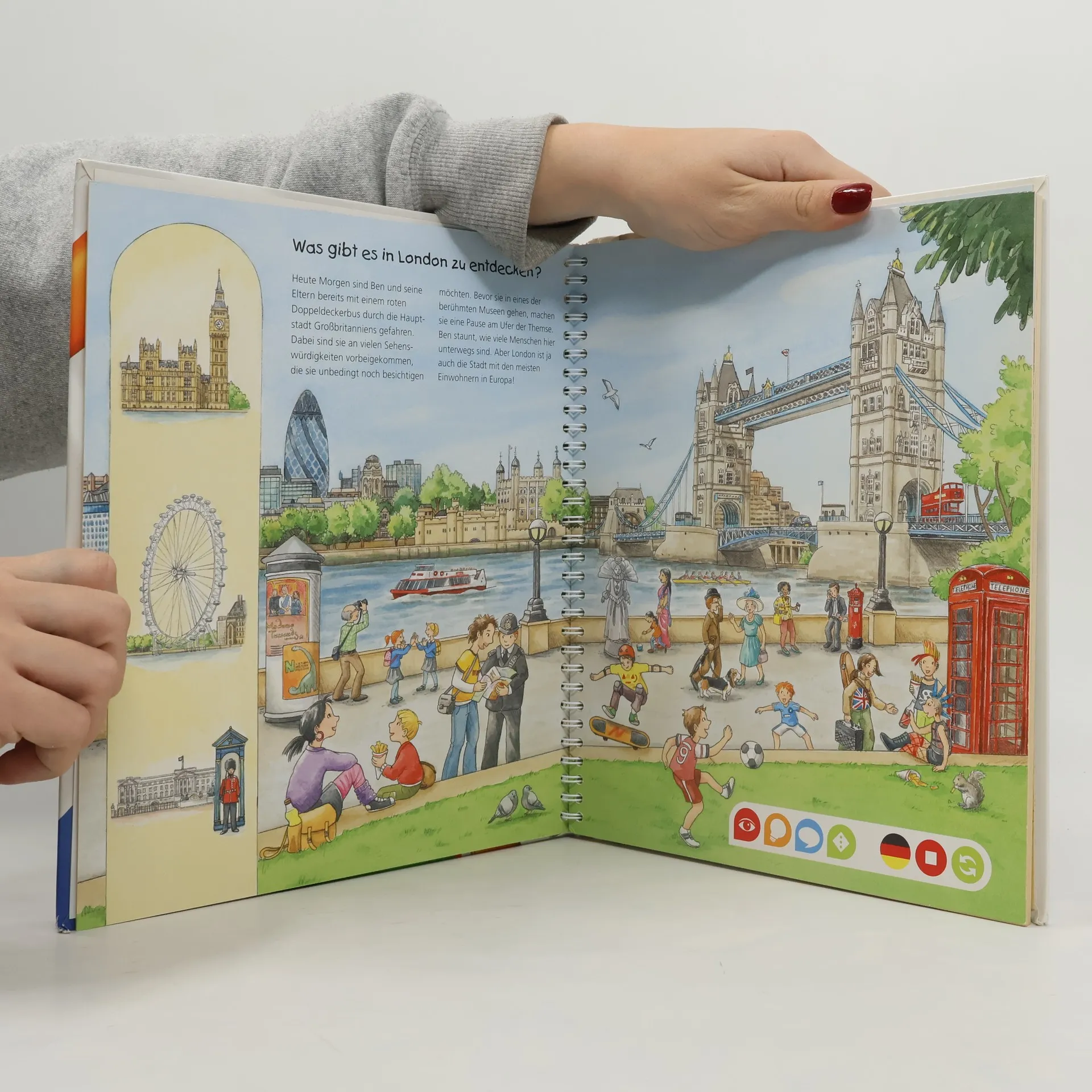 Bereits Kindergartenkinder interessieren sich für das Thema „Reisen“ und die Länder, in denen sie mit ihrer Familie Urlaub machen. In diesem Buch können Kinder, begleitet von authentischen Sound-Kulissen, verschiedene europäische Länder und Städte mitsamt ihren berühmtesten Sehenswürdigkeiten kennenlernen. Durch kurze Sätze und kleine Dialoge werden sie spielerisch an die jeweilige Landessprache herangeführt und können so typische Situationen in fremden Ländern schon ganz alleine meistern.