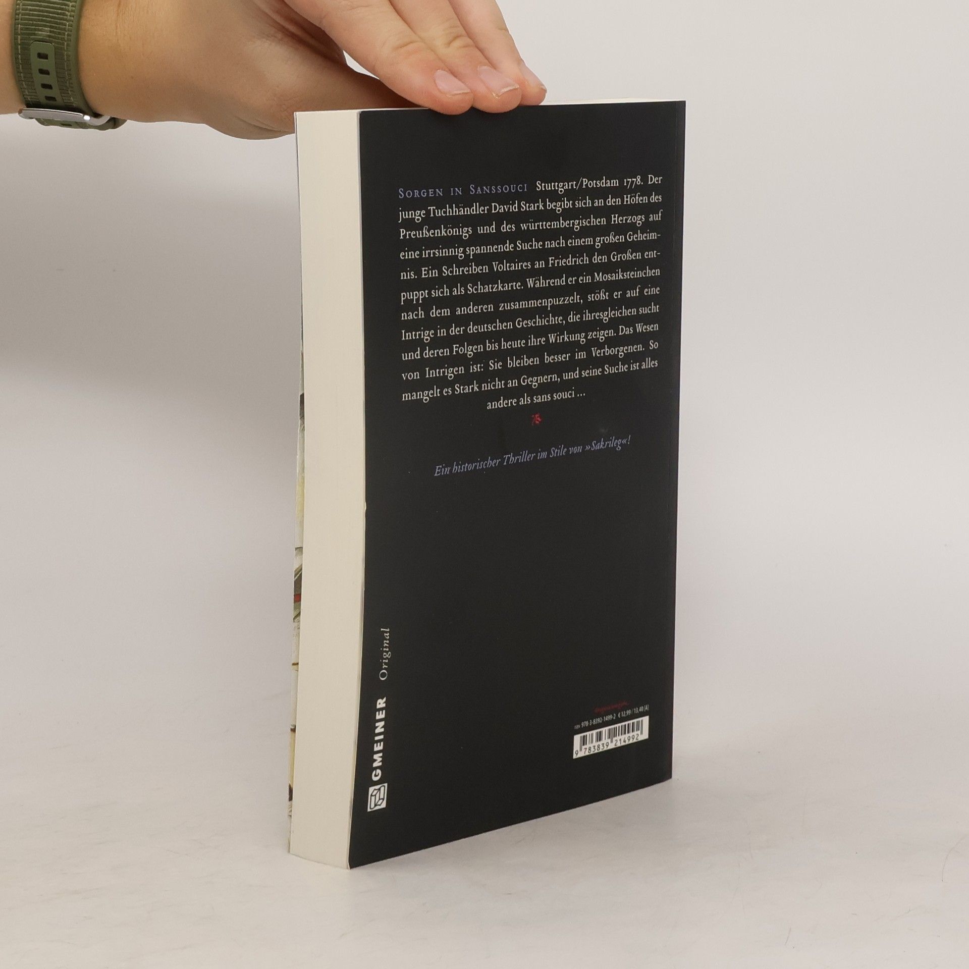 Stuttgart/Potsdam 1778. Der junge Tuchhändler David Stark begibt sich an den Höfen des Preußenkönigs und des württembergischen Herzogs auf eine irrsinnig spannende Suche nach einem großen Geheimnis. Ein Schreiben Voltaires an Friedrich den Großen entpuppt sich als Schatzkarte. Während er ein Mosaiksteinchen nach dem anderen zusammenpuzzelt, stößt er auf eine Intrige in der deutschen Geschichte, die ihresgleichen sucht und deren Folgen bis heute ihre Wirkung zeigen. Das Wesen von Intrigen ist: Sie bleiben besser im Verborgenen. So mangelt es Stark nicht an Gegnern, und seine Suche ist alles andere als sans souci …