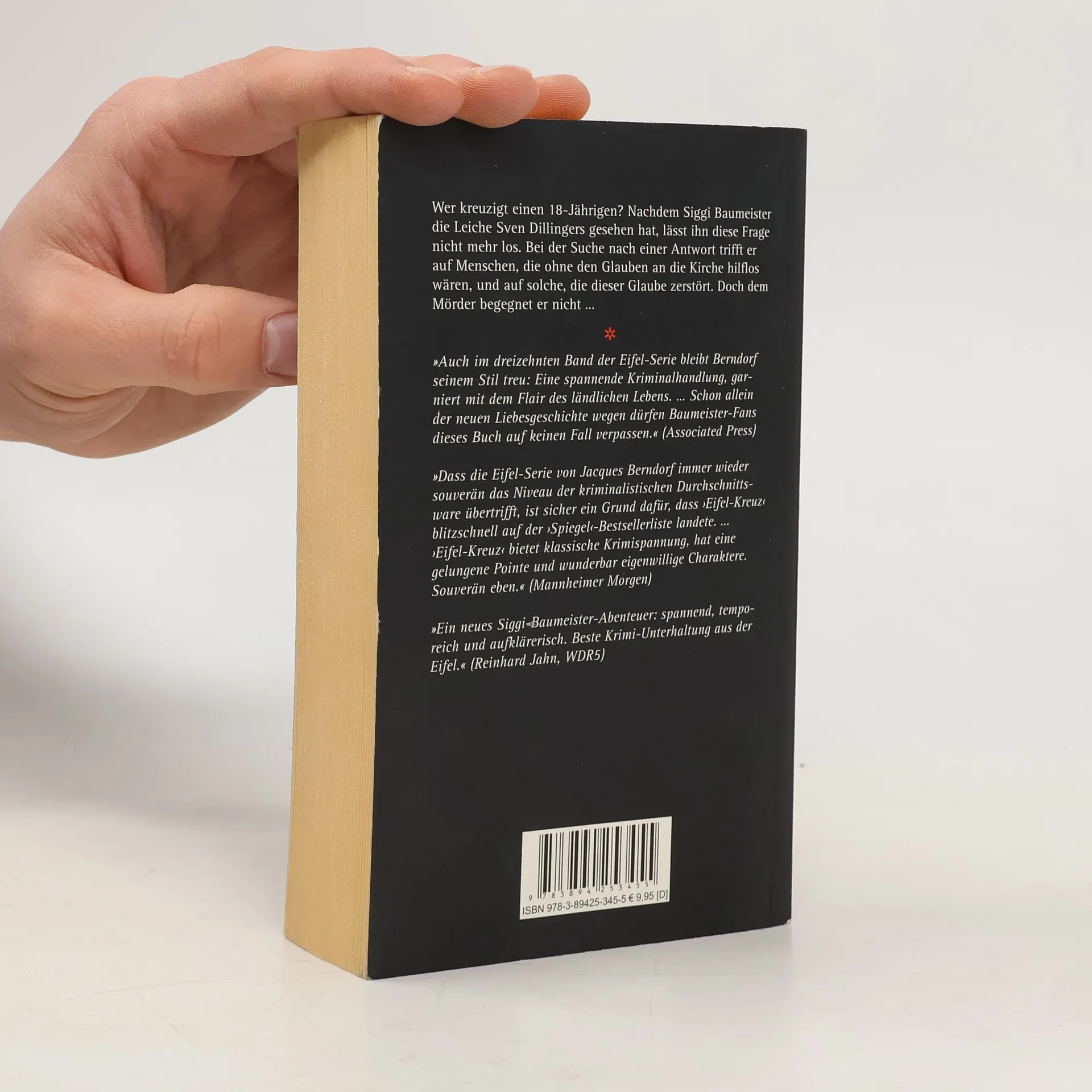 So eine Leiche haben selbst Siggi Baumeister und seine Freunde Rodenstock und Emma in der Realität noch nicht gesehen: Der 18-jährige Sven Dillinger wurde gekreuzigt. Zeitgleich wird noch eine Tote gefunden, die 23-jährige Gabriele Sikorski, abgelegt auf einem Waldweg. Bald ist klar, die beiden kannten sich. Doch warum mussten sie sterben, warum die Kreuzigung? Stecken religiöse Eiferer hinter der Tat? Baumeister taucht ein in eine Welt voller Glauben und Zweifel. Und er trifft auf Menschen, die an ihrem Glauben an diese Welt verzweifeln. Aber dem Mörder kommt der Journalist kein Stück näher - im Gegenteil: Als er im Wald eine schwer verletzte junge Frau findet, wird die Geschichte noch verworrener. Hat sie etwas mit Svens und Gabrieles Tod zu tun? Woher kommt sie und wie gelangte sie in die Eifel? Ausgerechnet eine Frankfurter Unterweltgröße hilft Baumeister, die Dinge ein wenig klarer zu sehen.