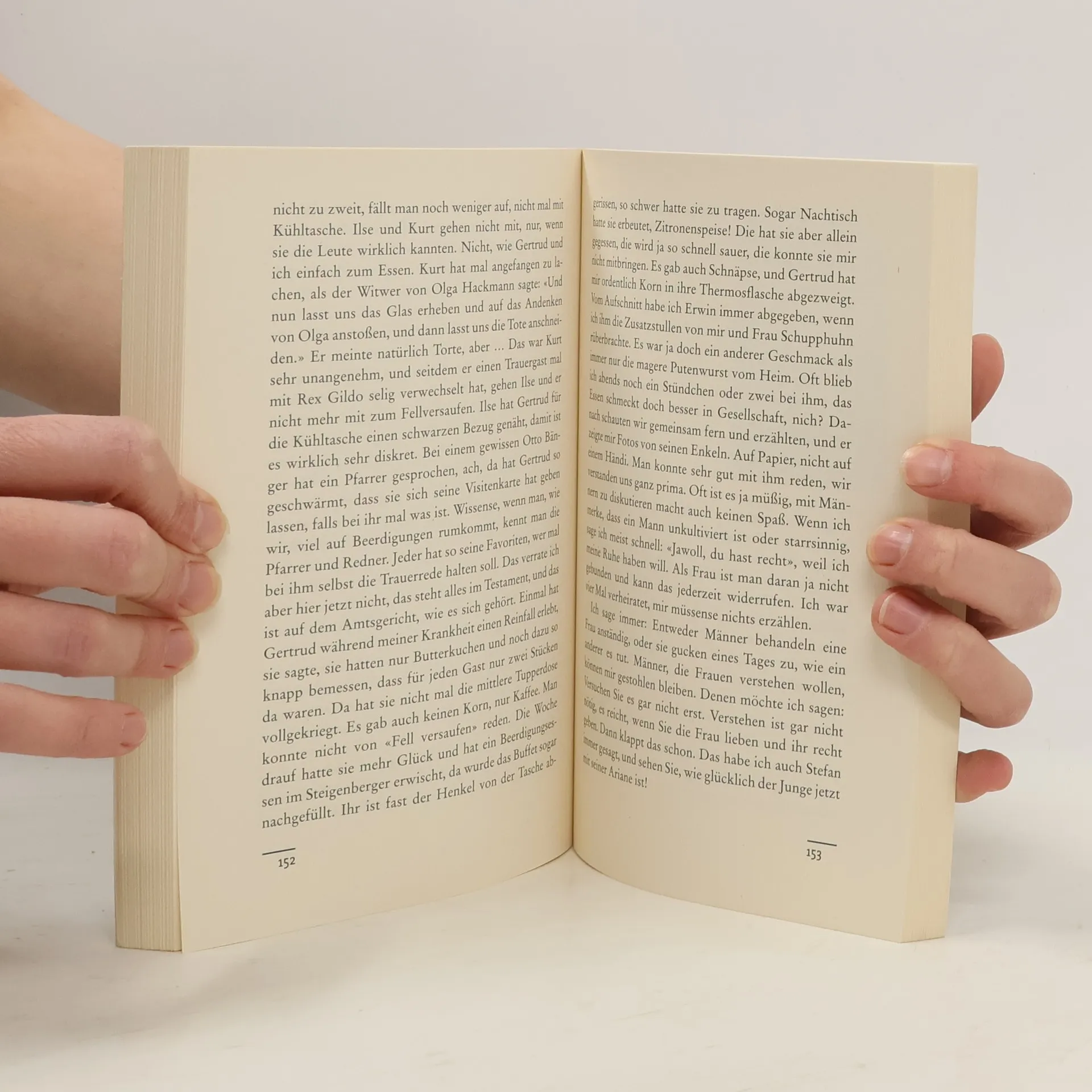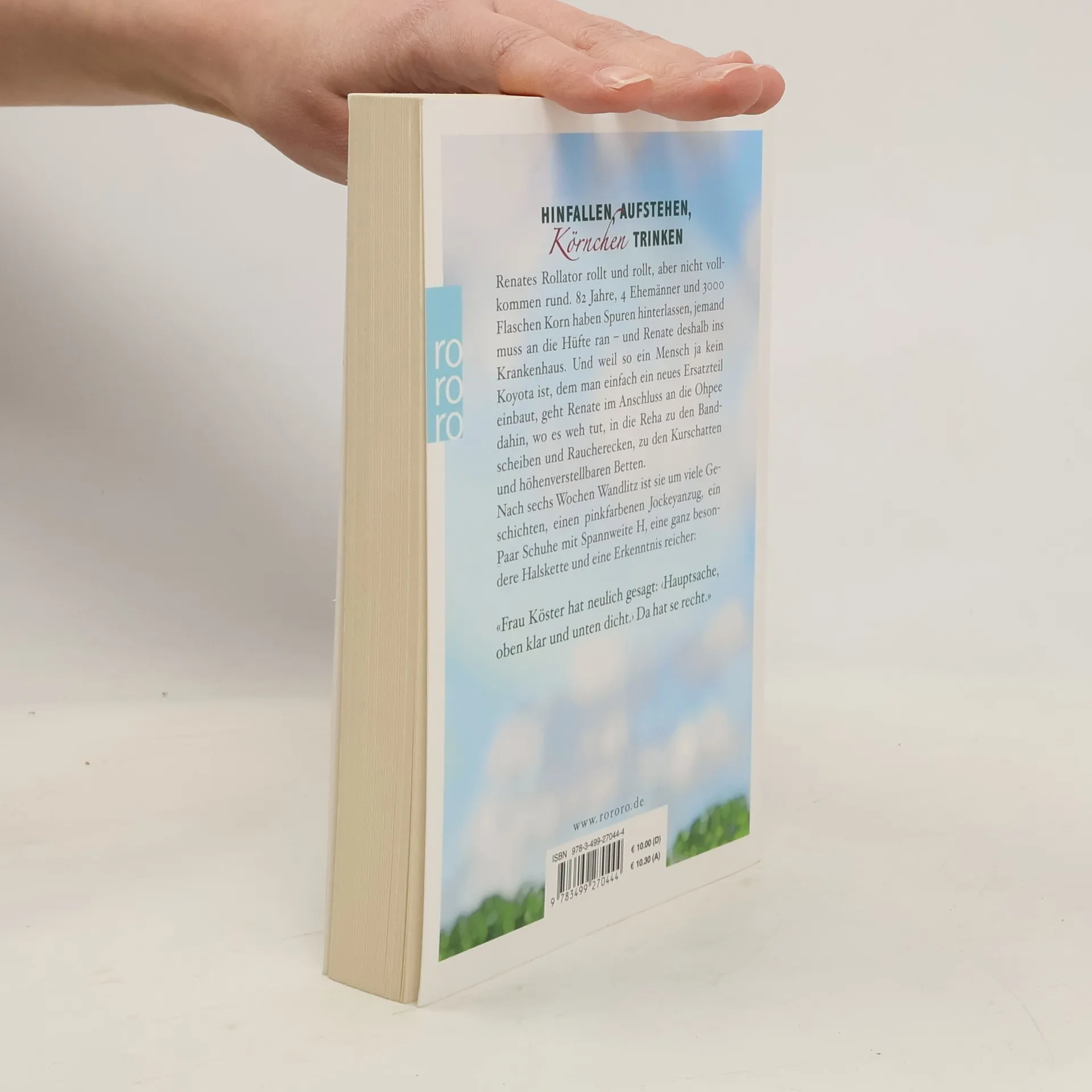 Hinfallen, Aufstehen, Körnchen trinken Renates Rollator rollt und rollt, aber nicht vollkommen rund: 82 Jahre, 4 Ehemänner und 3000 Flaschen Korn haben Spuren hinterlassen, jemand muss an die Hüfte ran – und Renate deshalb ins Krankenhaus. Und weil so ein Mensch ja kein Koyota ist, dem man einfach ein neues Ersatzteil einbaut, geht Renate im Anschluss an die Ohpee dahin, wo es wehtut, zu den Bandscheiben und Raucherecken, zu den Kurschatten und höhenverstellbaren Betten: In die Reha, die sie kurzerhand zur Kur erklärt und rockt. Nach sechs Wochen Wandlitz ist sie um viele Geschichten, einen pinkfarbenen Jockeyanzug, ein paar Schuhe mit Spannweite H, eine ganz besondere Halskette und eine Erkenntnis reicher: «Frau Köster hat neulich gesagt 'Hauptsache, oben klar und unten dicht.'»Da hat se recht.