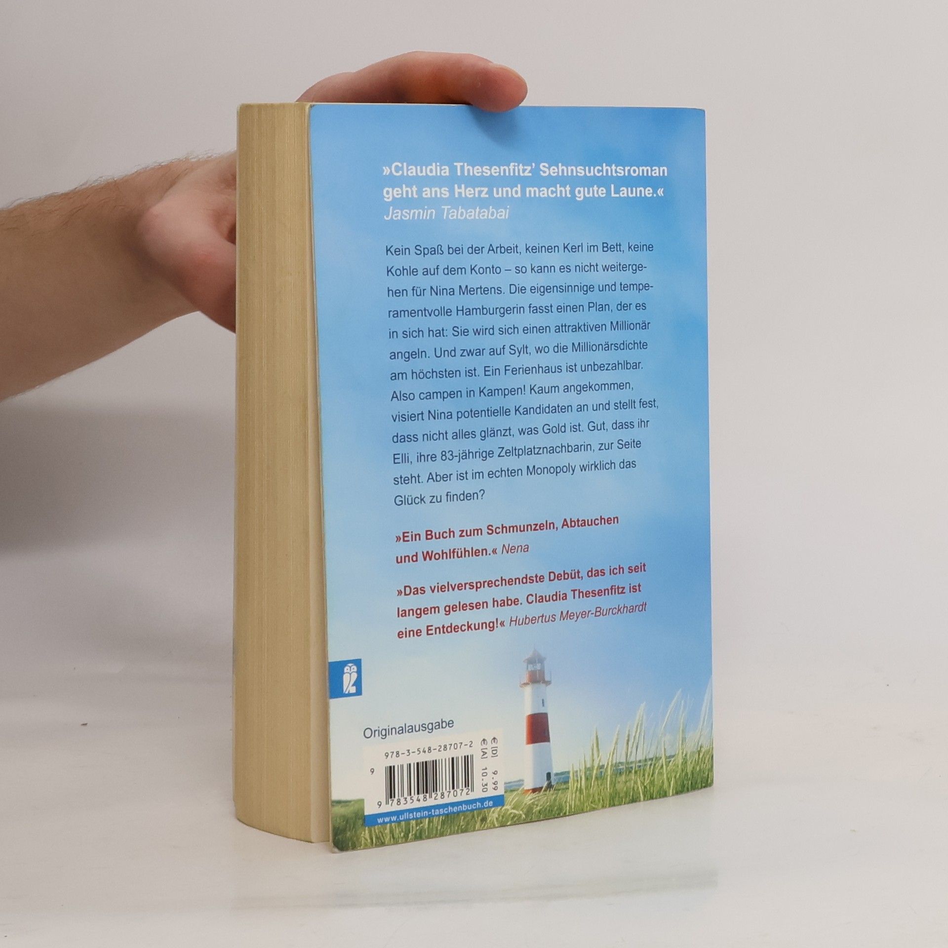 „Ein Buch zum Schmunzeln, Abtauchen und Wohlfühlen!“ Nena Kein Spaß bei der Arbeit, keinen Kerl im Bett, keine Kohle auf dem Konto - so kann es nicht weitergehen für Nina Mertens. Die eigensinnige und temperamentvolle Hamburgerin fasst einen Plan, der es in sich hat: Sie wird sich einen attraktiven Millionär angeln. Und zwar auf Sylt, wo die Millionärsdichte am höchsten ist. Ein Ferienhaus ist unbezahlbar. Also campen in Kampen! Kaum angekommen visiert Nina potentielle Kandidaten an und stellt fest, dass nicht alles glänzt, was Gold ist. Gut, dass ihr Elli, ihre 83-jährige Zeltplatznachbarin, mit Lebenserfahrung und altersuntypischer Frechheit zur Seite steht. Waghalsig stürzt sich Nina in ein Chaos aus Whiskymeile, SUV-Fahrern und Rolexuhren. Aber ist im echten Monopoly wirklich das Glück zu finden? "Claudia Thesenfitz' Sehnsuchtsroman geht ans Herz und macht gute Laune.“ Jasmin Tabatabai „Claudia Thesenfitz ist eine Entdeckung! Für mich das vielversprechendste Debüt seit langem.“ Hubertus Meyer-Burckhardt „Dieser unglaubliche Roman ist nicht gut - er ist sensationell! Ich habe viel gelacht, hatte Tränen in den Augen und zum Schluss war mir ganz warm ums Herz.“ Regina Först, People Först