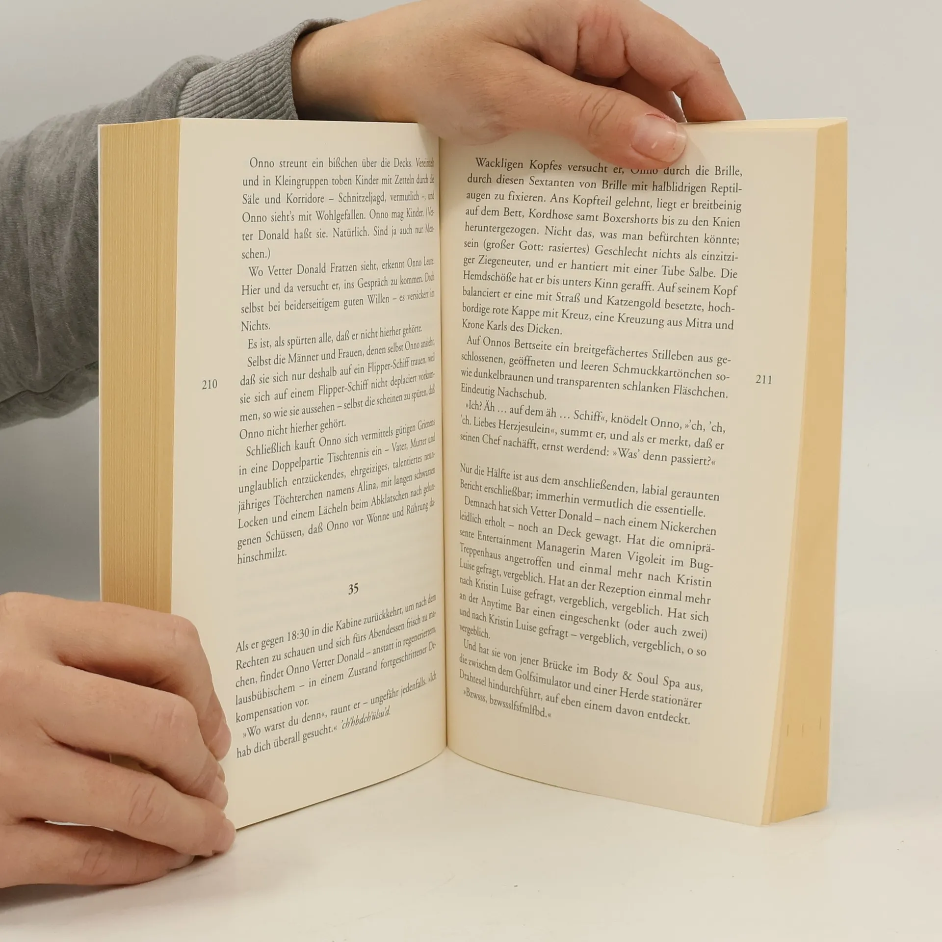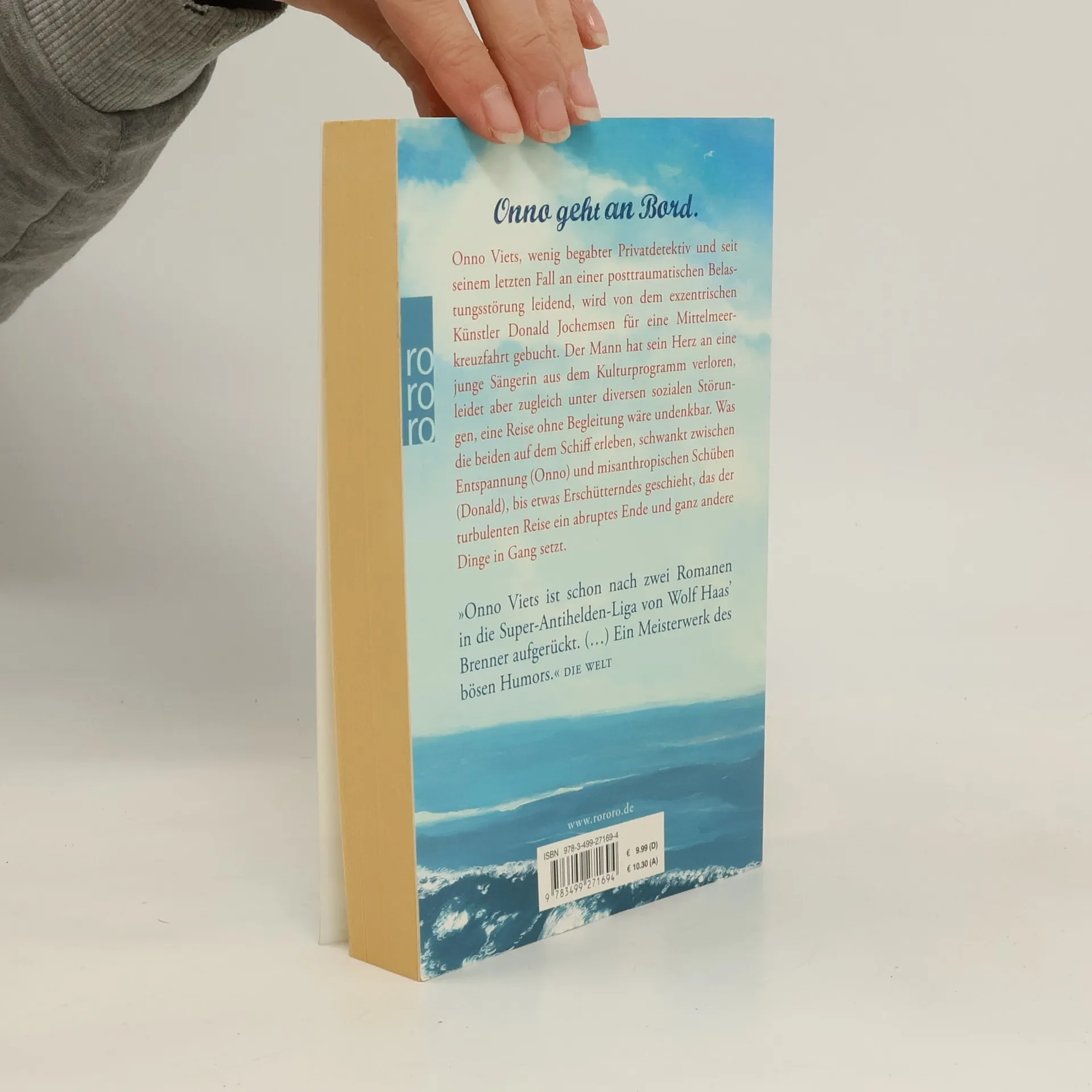 Onno geht an Bord Onno Viets, wenig begabter Privatdetektiv und seit seinem letzten Fall an einer posttraumatischen Belastungsstörung leidend, wird von dem exzentrischen Künstler Donald Jochemsen für eine Mittelmeerkreuzfahrt gebucht. Der Mann hat sein Herz an eine junge Sängerin aus dem Kulturprogramm verloren, leidet aber zugleich unter diversen sozialen Störungen, eine Reise ohne Begleitung wäre undenkbar. Was die beiden auf dem Schiff erleben, schwankt zwischen Entspannung (Onno) und misanthropischen Schüben (Donald), bis etwas Erschütterndes geschieht, das der turbulenten Reise ein abruptes Ende und ganz andere Dinge in Gang setzt.
