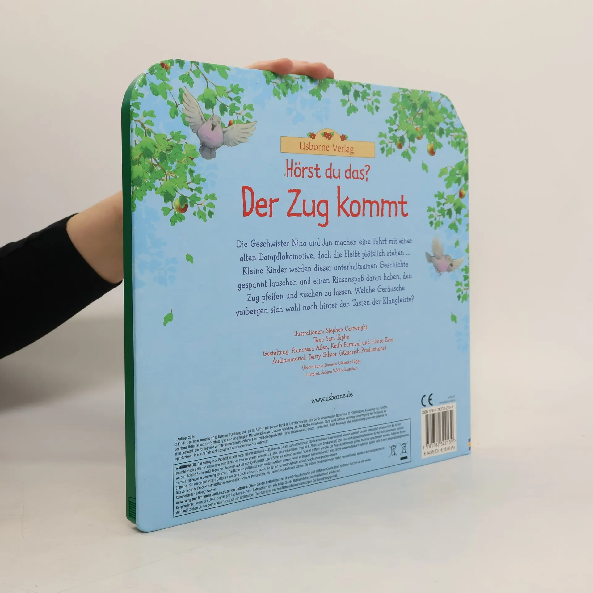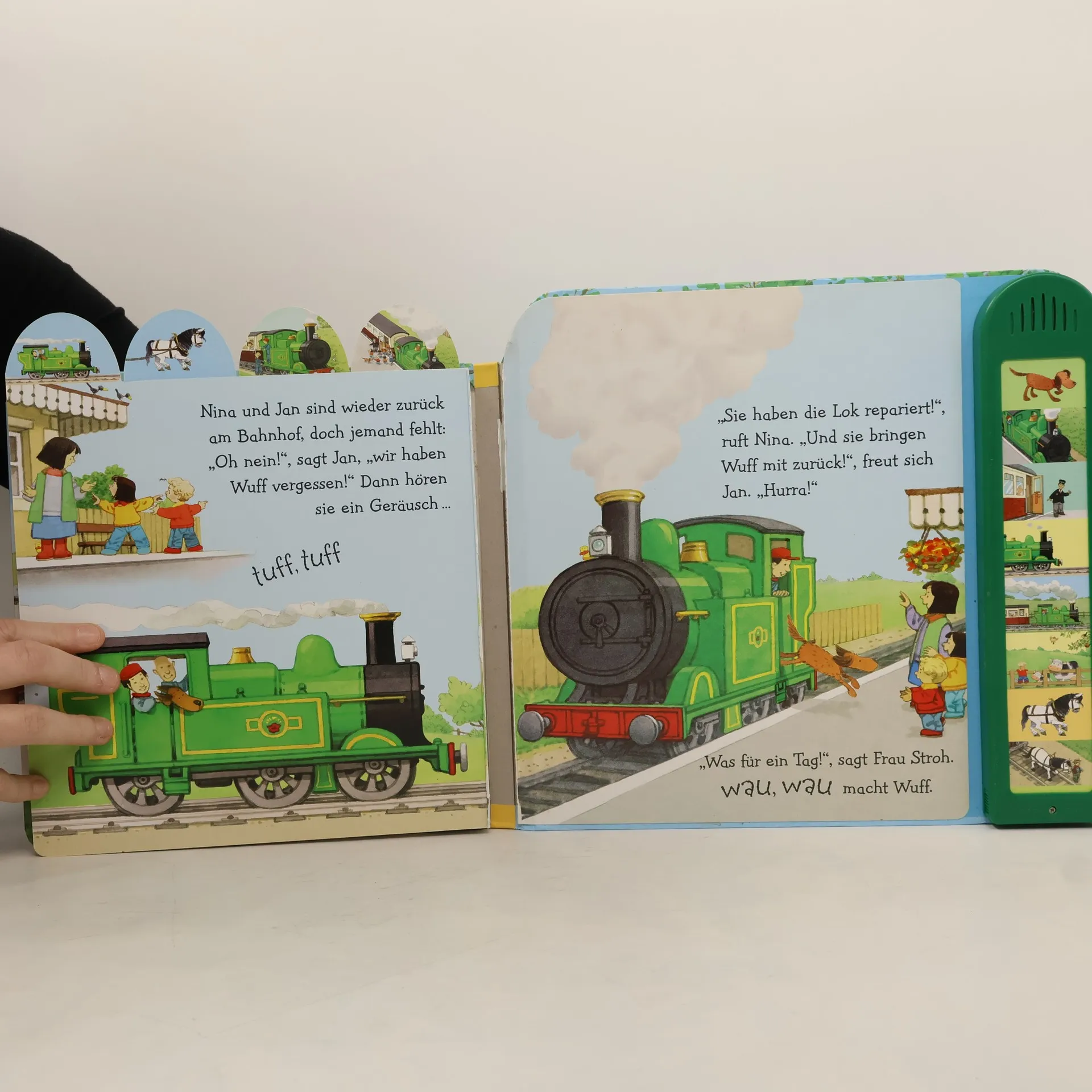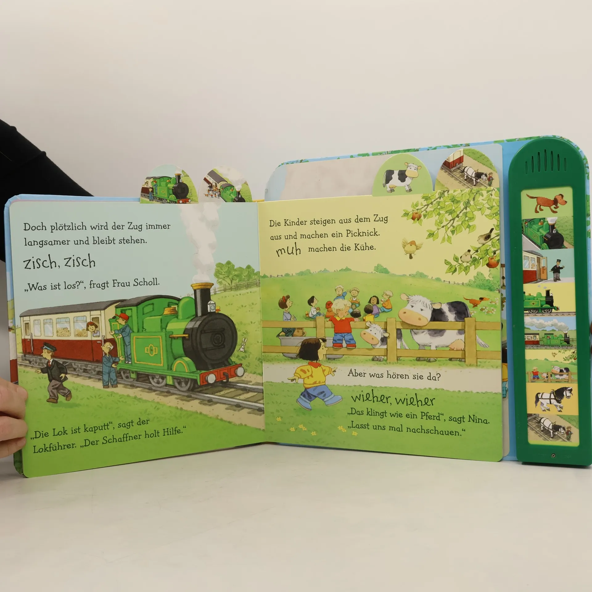 Einnehmende Geschichte mit liebevolle Illustrationen und 8 lebensechten Geräuschen Einnehmende Geschichte mit liebevolle Illustrationen und 8 lebensechten Geräuschen Nina und Jan erleben einen aufregenden Tag: Sie machen eine Fahrt mit einer alten Dampflokomotive, als diese plötzlich stehen bleibt. Zum Glück weiß Bauer Kübel Rat. Kleine Kinder lauschen dieser unterhaltsamen Geschichte gespannt und haben riesigen Spaß daran, die Knöpfe auf der Klangleiste zu drücken und den Zug tuten, die Kuh muhen oder das Pferd wiehern zu lassen. WARNHINWEIS: Das vorliegende Produkt enthält Knopfzellenbatterien (LR44), die eine Gefahr darstellen können.