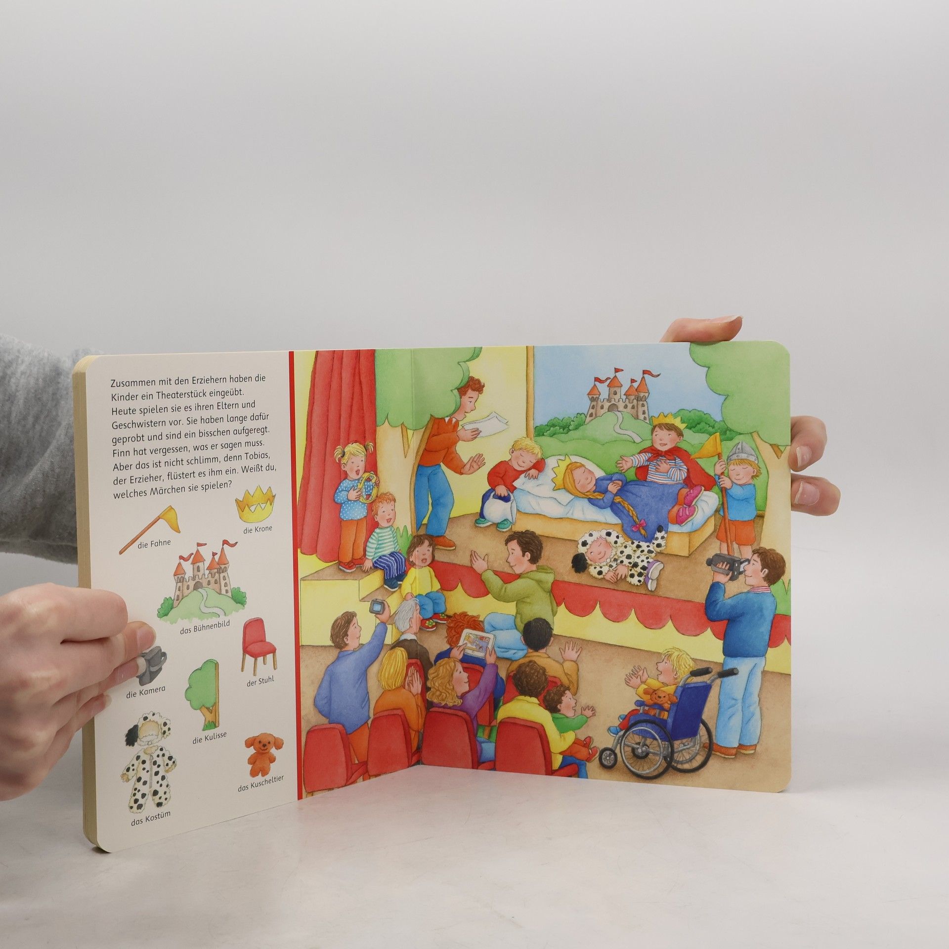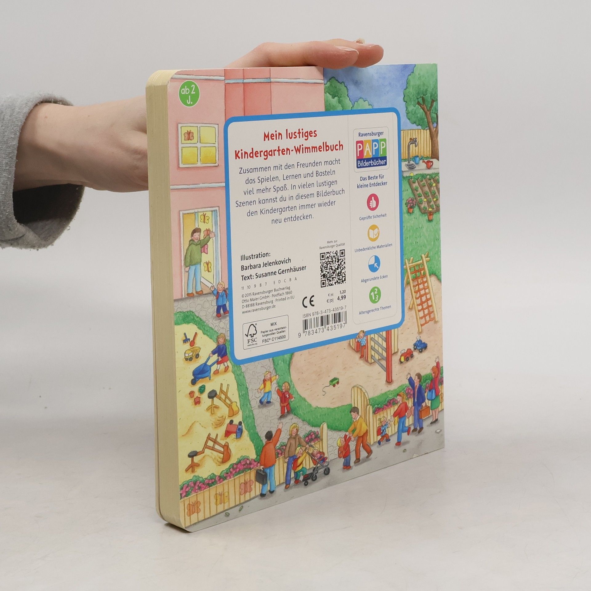 Willkommen im Kindergarten! Auf elf farbenfrohen, realitätsnahen Illustrationen werden alle Fragen zum Thema Kindergarten beantwortet. Ob drinnen oder draußen: hier macht das Spielen mit den kleinen Freunden Spaß. Es gibt eine Kinderküche, einen Waschraum, einen Turnraum und natürlich Spiel- und Kuschelecken. Die kurzen Texte beinhalten auf jeder Seite einen leichten Suchauftrag, der dazu motiviert die kleinen Bilder in den großen Schauseiten zu suchen und zu benennen. Das schult die Konzentrationsfähigkeit und fördert den Spracherwerb. Schon in der Garderobe wird klar: In diesem Kindergarten kommen alle Kinder gerne an. Die kleinen Freunde werden begrüßt und helfen sich gegenseitig. Es geht weiter in die Gemeinschaftsräume zum Spielen, Basteln, Singen und Turnen. Natürlich gibt es auch eine Kuschel- und Vorleseecke. Und der Waschraum hat extra kleine Waschbecken und niedrige Kindertoiletten. Da macht das Händewaschen Spaß! Auf einer weiteren Seite wird Geburtstag gefeiert, zusammen musiziert und auch geturnt. Natürlich gehen die Kinder zusammen nach draußen: Im Garten kann getobt, gebuddelt und geklettert werden. Ein umfangreiches Themenbuch, ideal als Einstiegshilfe in den Kindergartenalltag. Einfache Texte mit kleinen Suchaufträgen regen dazu an, die Bildervignetten auf der rechten Seite im großen Bild zu suchen und wiederzuentdecken.