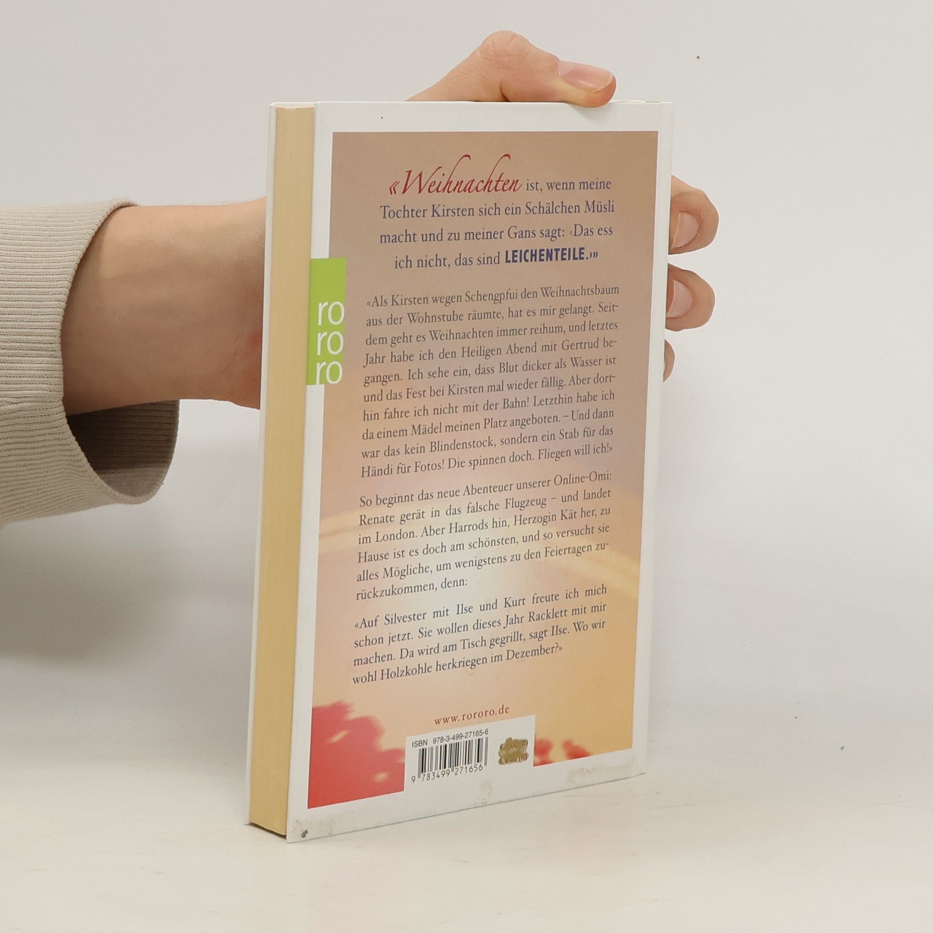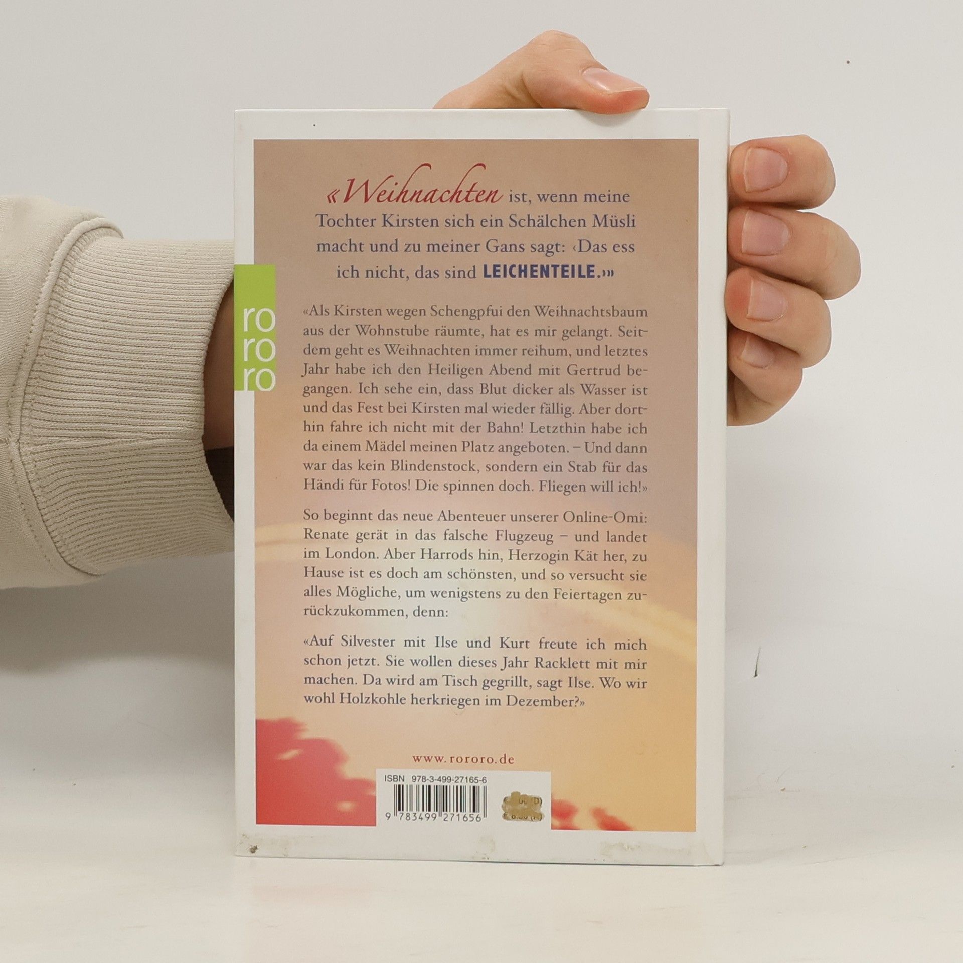 «Weihnachten ist, wenn meine Tochter Kirsten sich ein Schälchen Müsli macht und zu meiner Gans sagt: ‹Das sind LEICHENTEILE.›»«Als Kisten wegen Schengpfui den Weihnachtsbaum aus der Wohnstube räumte, hat es mir gelangt. Seitdem geht es Weihnachten immer reihum, und letztes Jahr habe ich den Heiligen Abend mit Gertrud begangen. Ich sehe ein, dass Blut dicker als Wasser ist und das Fest bei Kirsten mal wieder fällig. Aber dorthin fahre ich nicht mit der Bahn! Letzthin habe ich da einem Mädel meinen Platz angeboten. - Und dann was das kein Blindenstock, sondern ein Stab für das Händi für Fotos! Die spinnen doch. Fliegen will ich!»So beginnt das neue Abenteuer unserer Online-Omi: Renate gerät in das falsche Flugzeug - und landet im London. Aber Harrods hin, Herzogin Kät her, zu Hause ist es doch am schönsten, und so versucht sie alles Mögliche, um wenigstens zu den Feiertagen zurückzukommen, denn:«Auf Silvester mit Ilse und Kurt freute ich mich schon jetzt. Sie wollen dieses Jahr Racklett mit mir machen. Da wird am Tisch gegrillt, sagt Ilse. Wo wir wohl die Holzkohle herkriegen im Dezember?»
