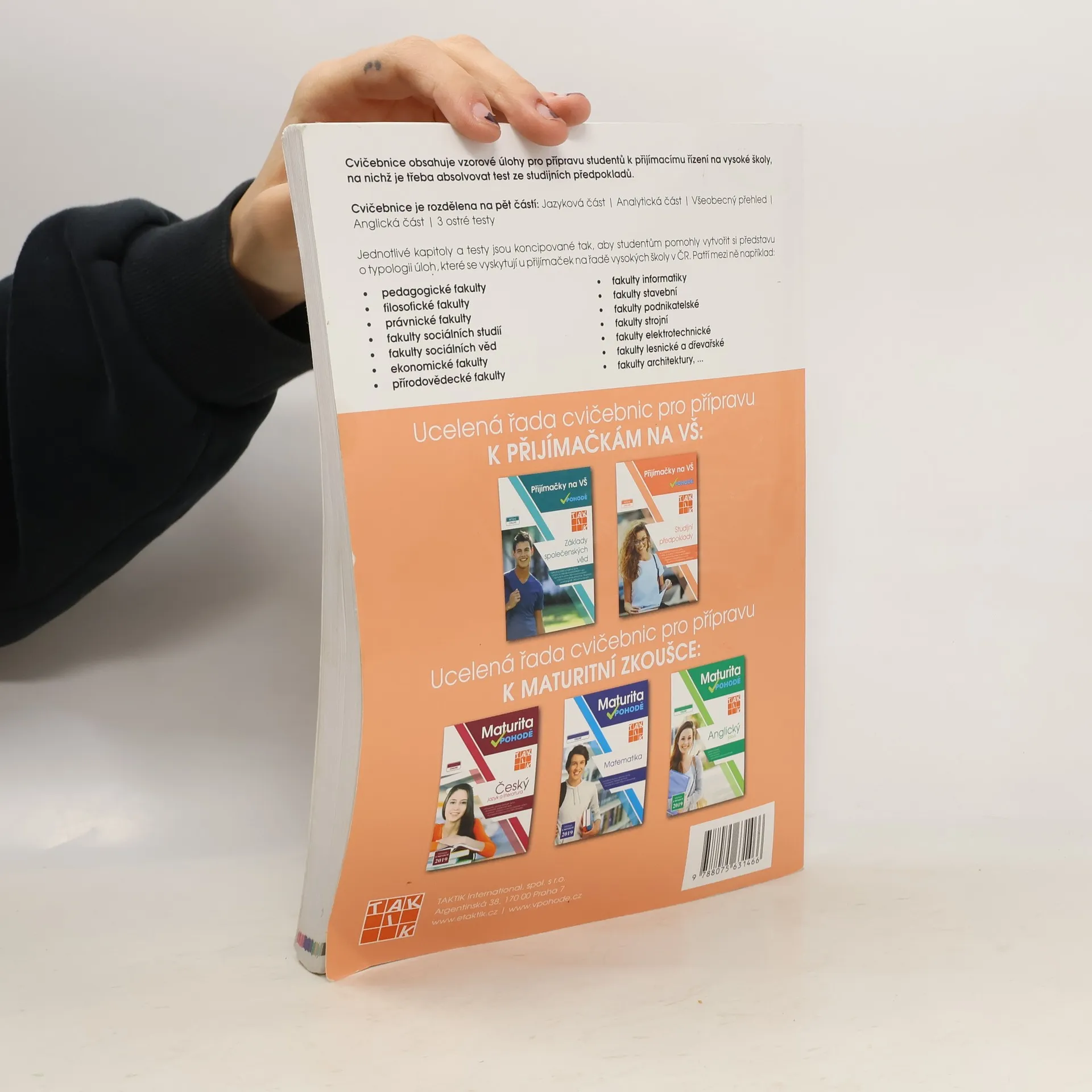 Cílem cvičebnice je poskytnout komplexní přípravu k přijímacímu řízení na vysoké školy, na nichž je třeba absolvovat test ze studijních předpokladů. Zpracováním různorodých typologií testových otázek a nejfrekventovanějších témat a oblastí z přijímacích řízení v ČR se podařilo žákům poskytnout kompletní podklady pro přípravu na testy ze studijních předpokladů na libovolnou vysokou školu v České republice. Cvičebnice obsahuje vzorové úlohy pro přípravu studentů k přijímacímu řízení na vysoké školy, na nichž je třeba absolvovat test ze studijních předpokladů.