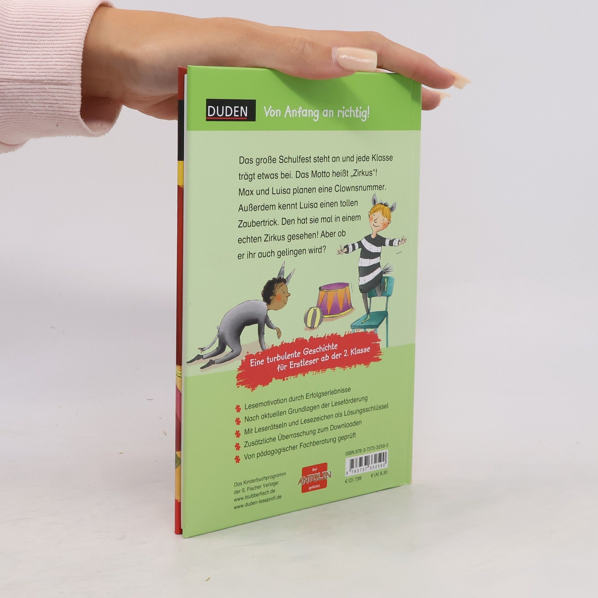 Lesen lernen leicht gemacht: Erstlesebuch zum Thema „Schulfest“ für Kinder ab der 2. Klasse Das große Schulfest steht an. Jede Klasse soll etwas beitragen. Zirkus lautet das Motto! Max und Luisa planen eine Clownsnummer – und außerdem einen grandiosen Zaubertrick. Den hat Luisa mal in einem echten Zirkus gesehen! Aber ob er ihnen auch gelingen wird? So geht zeitgemäße Leseförderung: Diese lustige und bezaubernd illustrierte Geschichte aus der Erstlesereihe „Leseprofi“ von FISCHER Duden Kinderbuch sorgt garantiert für Lesespaß. Der Text ist genau auf die Bedürfnisse der Jungen und Mädchen zugeschnitten. So erleben sie schnell motivierende Erfolge. Kleine, abwechslungsreiche Übungen zum Textverständnis begleiten beim Lesen. Ein interaktives Lesezeichen dient als Lösungsschlüssel. Zudem wartet auf jeden Leser eine kostenlose Online-Überraschung zum Download. Alle Titel der Reihe werden bei Antolin gelistet. Duden – von Anfang an richtig!