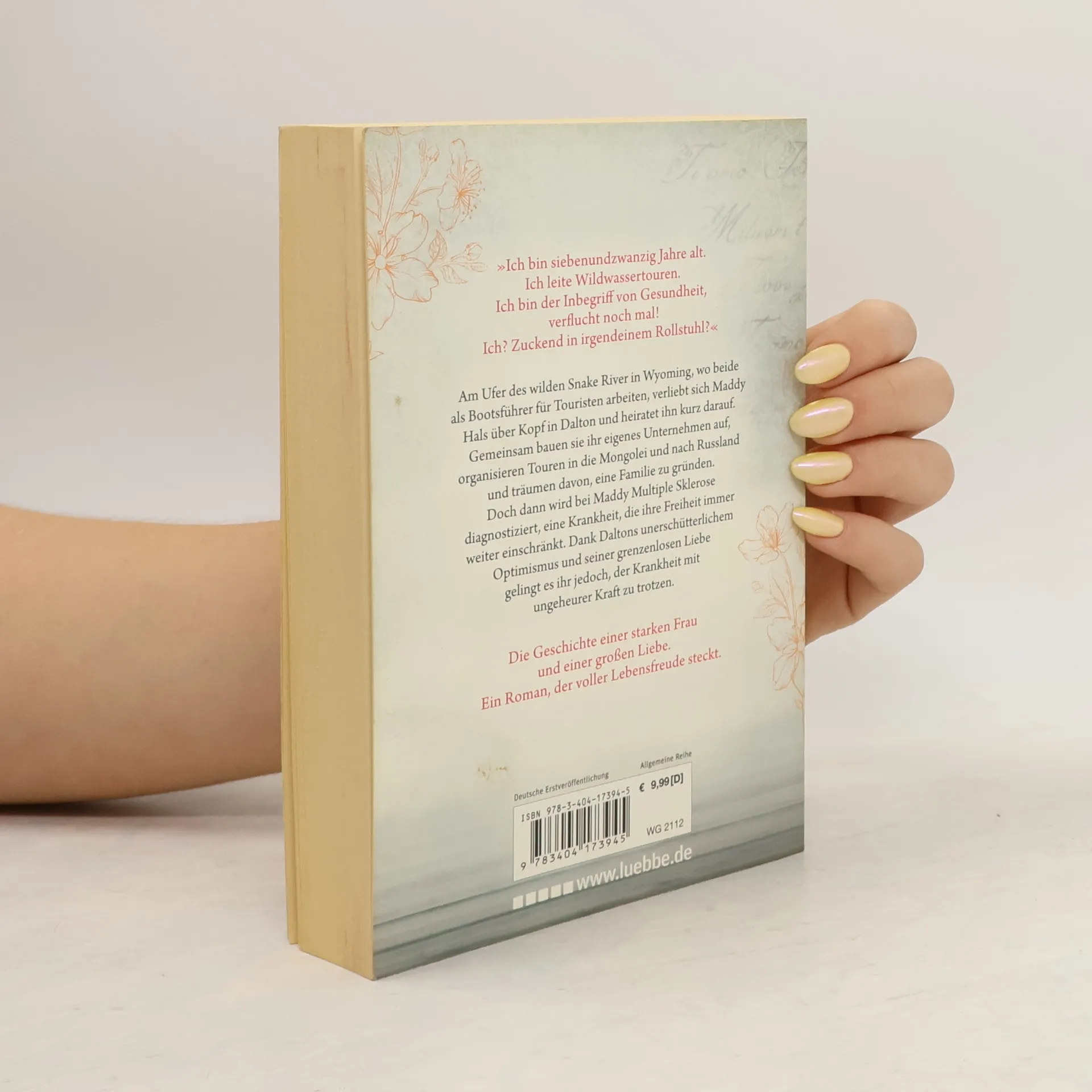 „Ich bin siebenundzwanzig Jahre alt. Ich leite Wildwassertouren. Ich bin der Inbegriff von Gesundheit, verflucht noch mal! Ich? Zuckend in irgendeinem Rollstuhl?“ Am Ufer des wilden Snake River in Wyoming, wo beide als Bootsführer für Touristen arbeiten, verliebt sich Maddy Hals über Kopf in Dalton und heiratet ihn kurz darauf. Gemeinsam bauen sie ihr eigenes Unternehmen auf, organisieren Touren in die Mongolei und nach Russland und träumen davon, eine Familie zu gründen. Doch dann wird bei Maddy Multiple Sklerose diagnostiziert, eine Krankheit, die ihre Freiheit immer weiter einschränkt. Dank Daltons unerschütterlichem Optimismus und seiner grenzenlosen Liebe, gelingt es ihr jedoch, der Krankheit mit ungeheurer Kraft zu trotzen. Die Geschichte einer starken Frau und einer großen Liebe. Ein Roman, der voller Lebensfreude steckt.