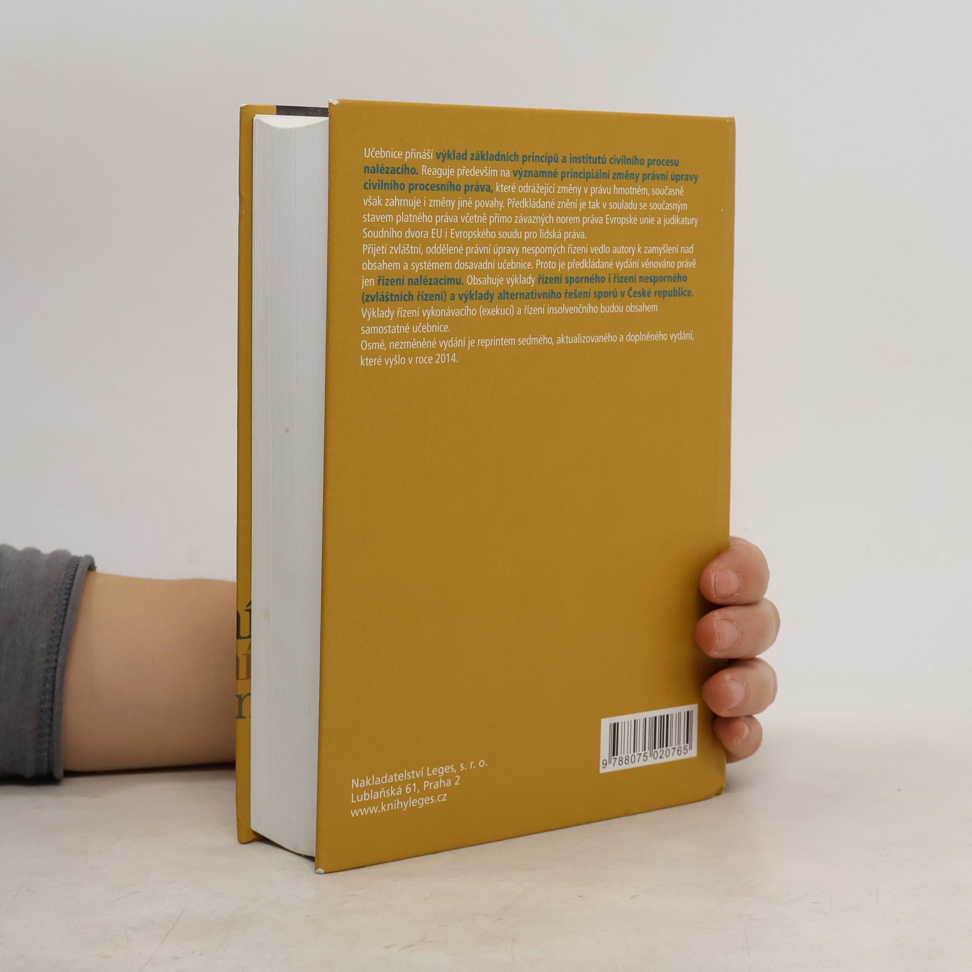 Učebnice přináší výklad základních principů a institutů civilního procesu nalézacího. Reaguje především na významné principiální změny právní úpravy civilního procesního práva, odrážející změny v právu hmotném, současně však zahrnuje i změny jiné povahy. Předkládané znění je tak v souladu se současným stavem platného práva včetně přímo závazných norem práva Evropské unie a judikatury Soudního dvora EU i Evropského soudu pro lidská práva. Přijetí zvláštní, oddělené právní úpravy nesporných řízení vedlo autory k zamyšlení nad obsahem a systémem dosavadní učebnice. Proto je předkládané vydání věnováno právě jen řízení nalézacímu. Obsahuje výklady řízení sporného i řízení nesporného (zvláštních řízení) a výklady alternativního řešení sporů v České republice. Výklady řízení vykonávacího (exekucí) a řízení insolvenčního budou obsahem samostatné učebnice. Osmé, nezměněné vydání je reprintem sedmého, aktualizovaného a doplněného vydání, které vyšlo v roce 2014.