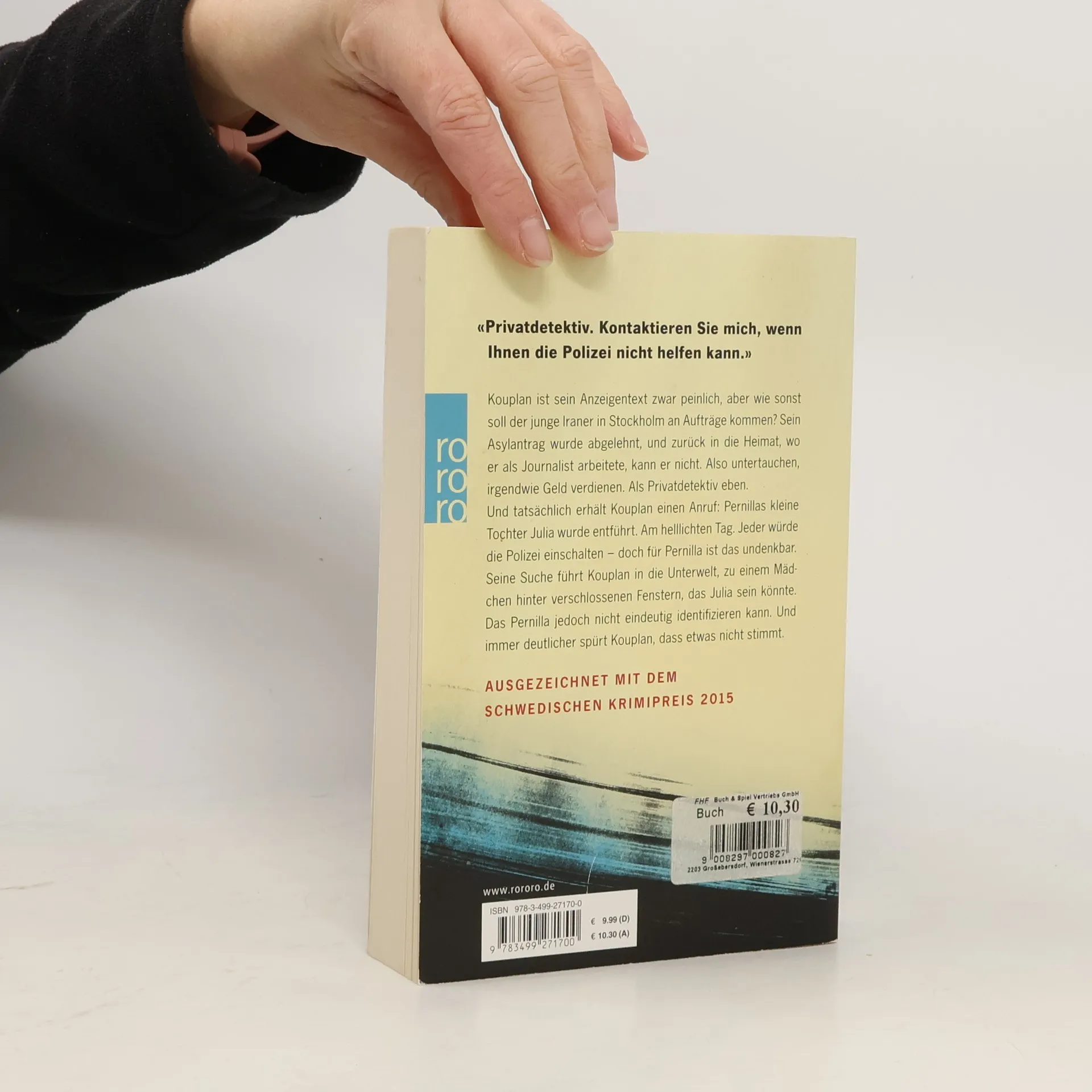 «Ausgezeichnet mit dem Schwedischen Krimipreis 2015 «Privatdetektiv. Kontaktieren Sie mich, wenn Ihnen die Polizei nicht helfen kann.» Kouplan ist sein Anzeigentext zwar peinlich, aber wie sonst soll der junge Iraner in Stockholm an Aufträge kommen? Sein Asylantrag wurde abgelehnt und zurück in die Heimat, wo er als Journalist arbeitete, kann er nicht. Also untertauchen, irgendwie Geld verdienen. Als Privatdetektiv eben. Und tatsächlich erhält Kouplan einen Anruf: Pernillas kleine Tochter Julia wurde entführt. Am helllichten Tag. Jeder würde die Polizei einschalten – doch für Pernilla ist das undenkbar. Seine Suche führt Kouplan in die Unterwelt, zu einem Mädchen hinter verschlossenen Fenstern, das Julia sein könnte. Das Pernilla jedoch nicht eindeutig identifizieren kann. Und immer deutlicher spürt Kouplan, dass etwas nicht stimmt.