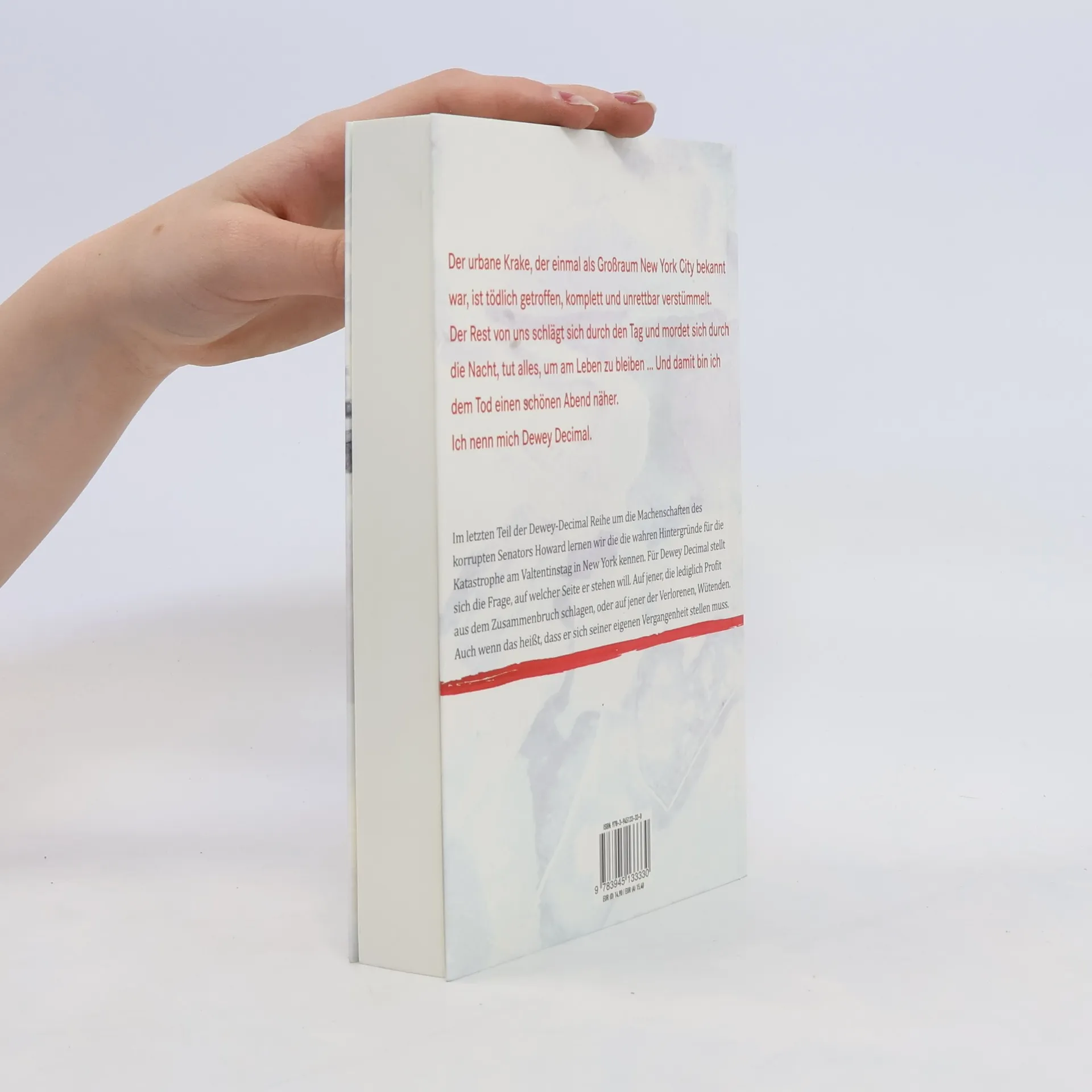 New York nach 2/14, den Börsencrashs, den Bombenanschlägen, der Super-Flu-Epidemie, dem fast völligen Zusammenbruch. Dewey Decimal bewegt sich zwischen Ruinen. Menschlichen und solchen aus Stein. Ein Mann ohne Zukunft und Vergangenheit. Er ist aus der Zeit gefallen und hat überlebt. Einfach so weitermachen wie bisher oder sich der Erinnerung stellen? Die Frage treibt Decimal im letzten Teil der Trilogie um einen in sich Wütenden, einen Verlorenen an, der zynisch einem korrupten evangelikalen Senator bei dessen Machenschaften hilft. Larson zeichnet ein zukunftspessimistisches Szenario von New York nach der Katastrophe am Valentinstag. Dewey wird beauftragt, die Aktivitäten einer wachsenden Gruppe von Anarchisten und Hausbesetzern zu stören und gleichzeitig die Mitglieder des saudischen Königshauses zu beschützen. In einer Stadt, in der marodierende Gangs die Straßen kontrollieren.