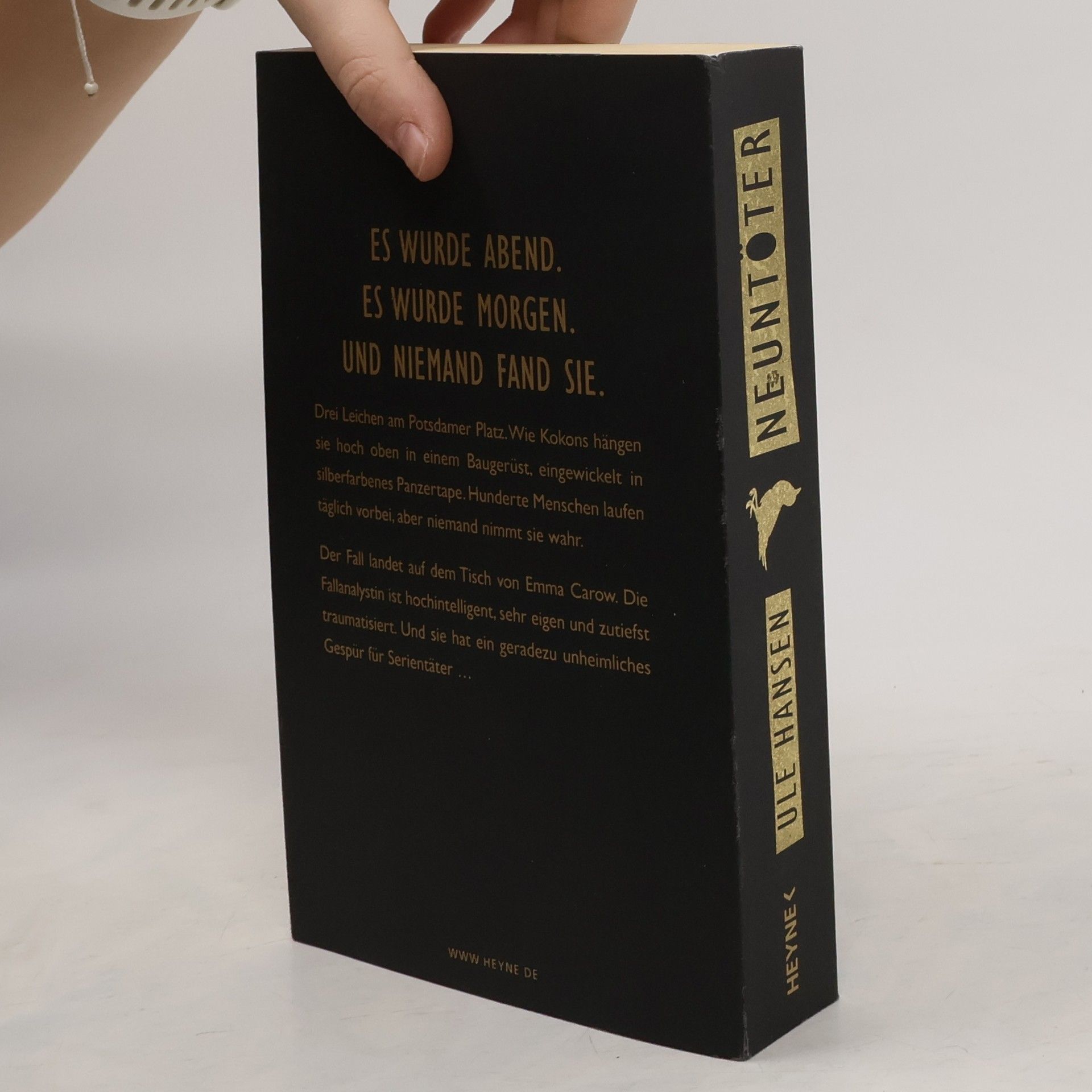 Vor Menschen hat sie Angst. Serienmörder versteht sie. Berlin, Potsdamer Platz. Beim Klettern auf einem Baugerüst macht ein Junge eine grausame Entdeckung: Drei Leichen, einbandagiert in Panzertape, hängen in schwindelerregender Höhe an den Gerüststangen. Sie sehen aus wie Mumien und scheinen in dieselbe Richtung zu blicken, als würden sie auf etwas warten. Als die menschenscheue Fallanalystin Emma Carow auf den Fall angesetzt wird, ist ihr schnell klar, dass er für ihre Karriere entscheidend ist. Doch je fester sie sich verbeißt, desto mehr droht ein altes Trauma sie in den Abgrund zu ziehen.