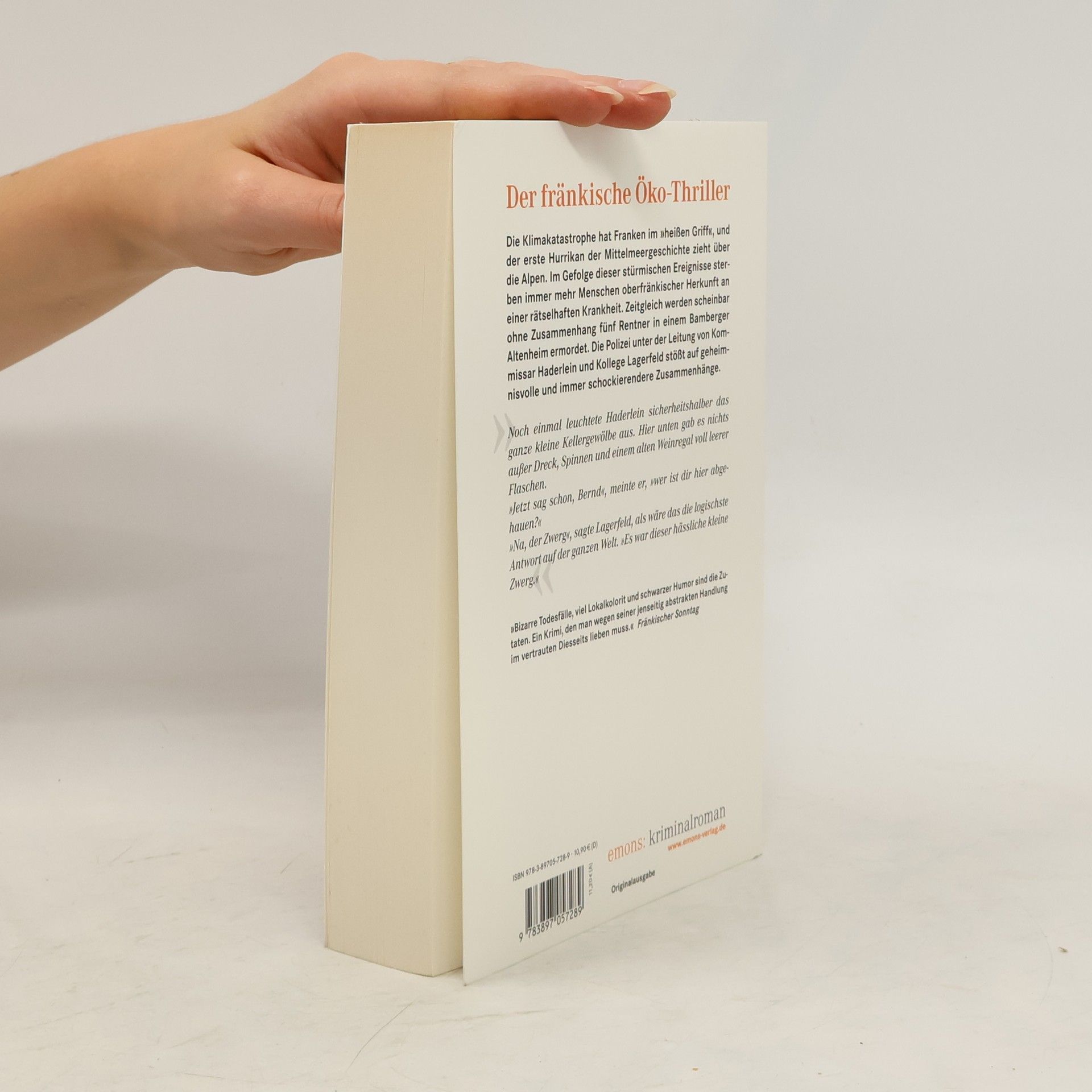 Die Klimakatastrophe hat Franken im "heissen Griff", und der erste Hurrikan der Mittelmeergeschichte zieht über die Alpen. Im Gefolge dieser stürmischen Ereignisse sterben immer mehr Menschen oberfränkischer Herkunft an einer rätselhaften Krankheit. Zeitgleich werden scheinbar ohne Zusammenhang fünf Rentner in einem Bamberger Altenheim ermordet. Die Bamberger Polizei unter Kommissar Haderlein und Kollege Lagerfeld stösst auf geheimnisvolle und immer schockierendere Zusammenhänge. Helmut Vorndran, geboren 1961 in Bad Neustadt/Saale, lebt mehrere Leben: als Kabarettist, Unternehmer und Buchautor. Als überzeugter Franke hat er seinen Lebensmittelpunkt ins oberfränkische Bamberger Land verlegt und arbeitet als freier Autor unter anderem für Antenne Bayern und das Bayrische Fernsehen. Im Emons Verlag erschien sein Kriminalroman "Das Alabastergrab"