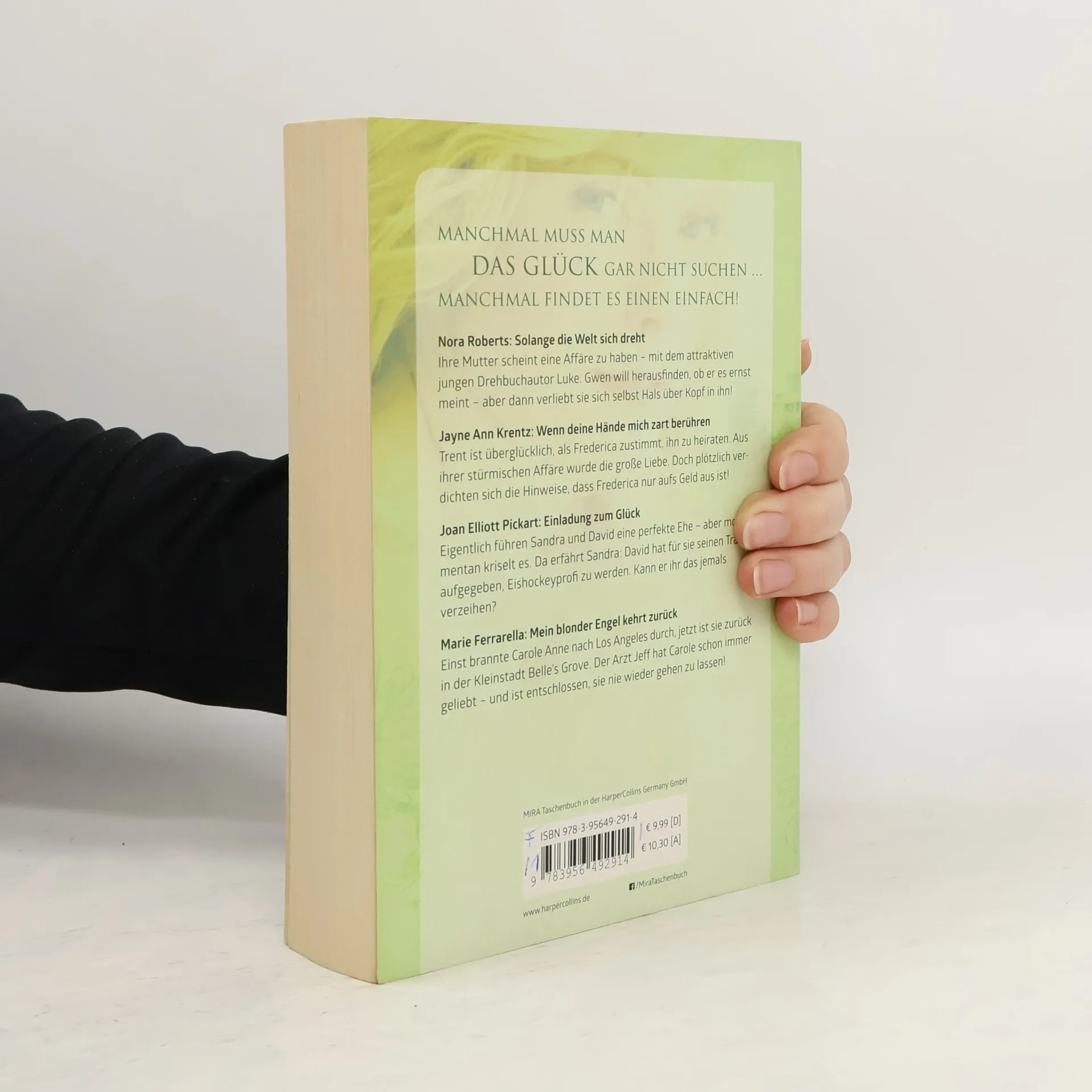 Nora Roberts - Solange die Welt sich dreht: Ihre Mutter scheint eine Affäre zu haben, mit dem attraktiven jungen Drehbuchautor Luke. Gwen will herausfinden, ob er es ernst meint - aber dann verliebt sie sich selber Hals über Kopf in ihn! Jayne Ann Krentz - Wenn deine Hände mich zart berühren Trent ist überglücklich als Frederica zustimmt, ihn zu heiraten. Aus ihrer stürmischen Affäre wurde die große Liebe. Doch plötzlich verdichten sich die Hinweise, dass Frederica nur sein Geld will! Joan Elliot Pickart - Einladung zum Glück: Eigentlich führen Sandra und David eine perfekte Ehe - aber momentan kriselt es. Da erfährt Sandra: David hat für sie seinen Traum aufgegeben, Eishockeyprofi zu werden. Kann er ihr das jemals verzeihen? Marie Ferrarella - Mein blonder Engel kehrt zurück: Einst brannte Carole Anne nach Los Angeles durch, jetzt ist sie zurück in der Kleinstadt Belle’s Grove. Der Arzt Jeff hat Carole schon immer geliebt - und ist entschlossen, sie nie wieder gehen zu lassen!