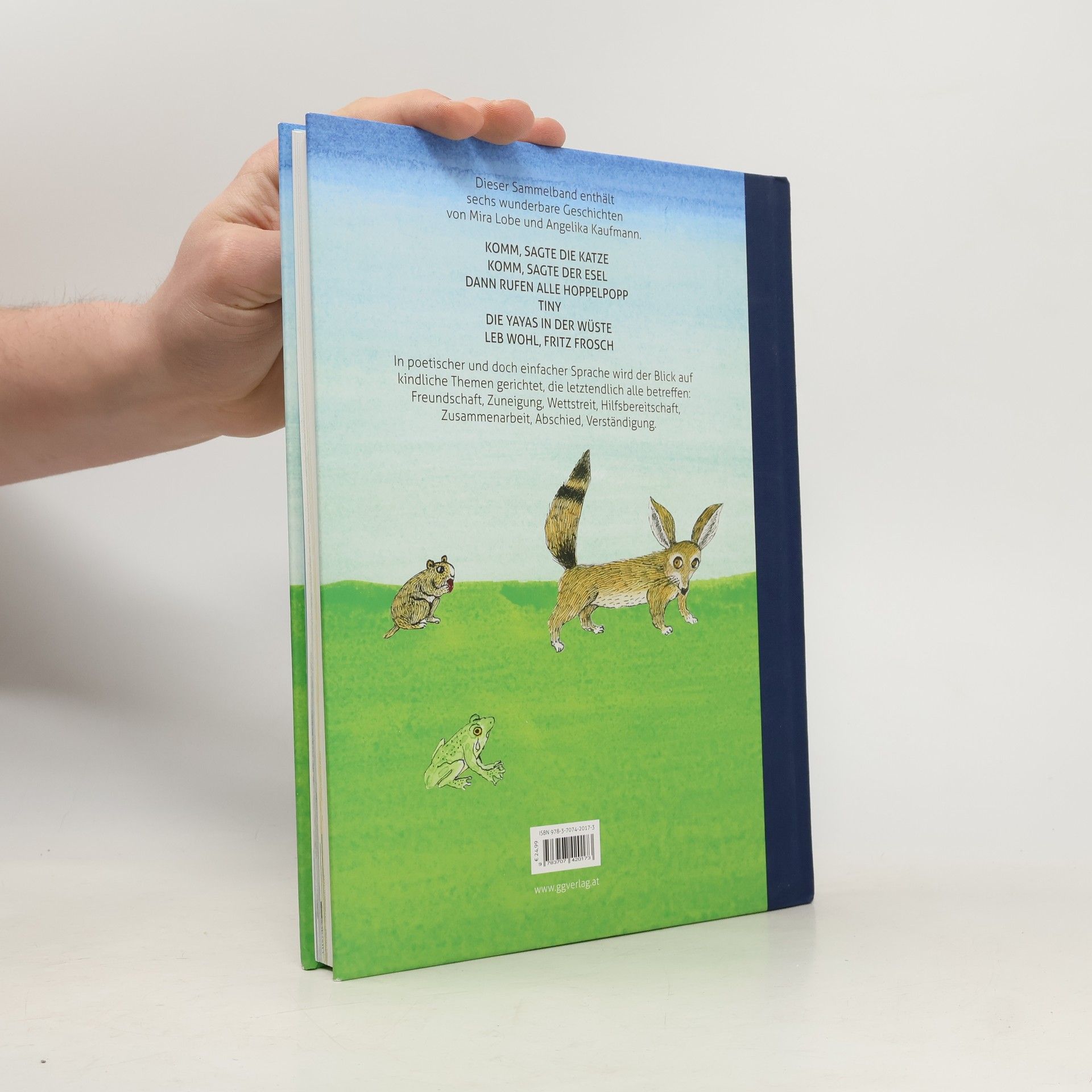 Sechs wunderbare Geschichten aus der Feder von Mira Lobe. Illustriert von Angelika Kaufmann. Geschichten im Buch: Komm, sagte die Katze Komm, sagte der Esel Dann rufen alle Hoppelpopp Tiny Die Yayas in der Wüste Leb wohl, Fritz Frosch