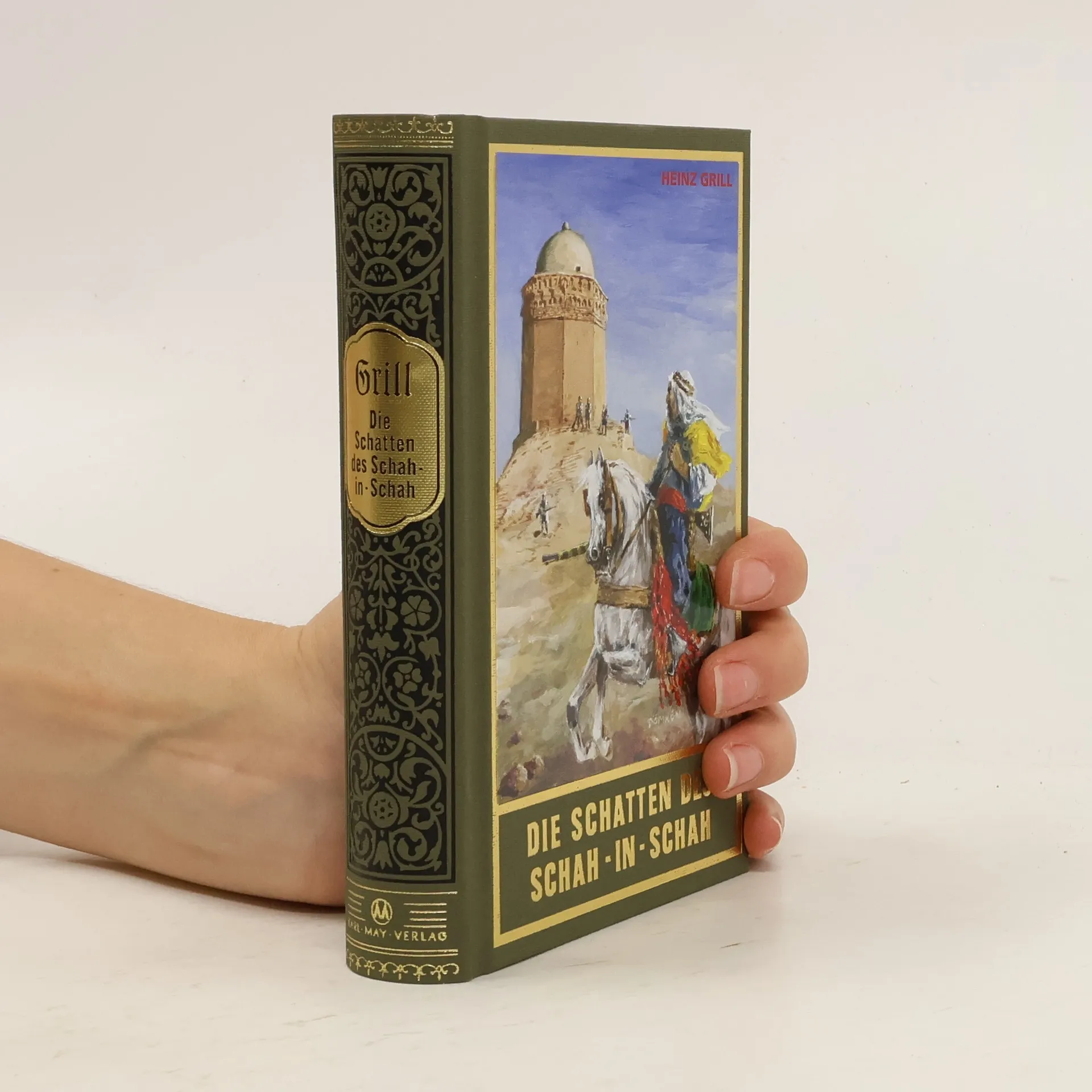 Grills „Die Schatten des Schah-in-Schah“ schließt unmittelbar an die Bände 26 und 27 der Gesammelten Werke Karl Mays an („Der Löwe der Blutrache“ und „Bei den Trümmern von Babylon“) und erzählt die Abenteuergeschichte zu Ende. Mays Fortsetzung in den Bänden 28 und 29 (Im Reiche des silbernen Löwen„ und “Das versteinerte Gebet") sind nach seiner großen Orientreise entstanden, die seine Sicht der Dinge für immer verändert hat und damit großen Einfluss auf seine zukünftigen Werke nahm. Seit dieser Zeit beginnt sein Wandel zu einem mehr symbolistischen Alterswerk. Daher passen nur jeweils die Bände 26 und 27 bzw. 28 und 29 direkt zusammen, auch wenn sich die Geschichte fortzuspinnen scheint. Hier greift Grills Meisterwerk ein, der in bester Karl-May-Abenteuer-Manier eine überzeugende Fortsetzung abgeliefert hat.