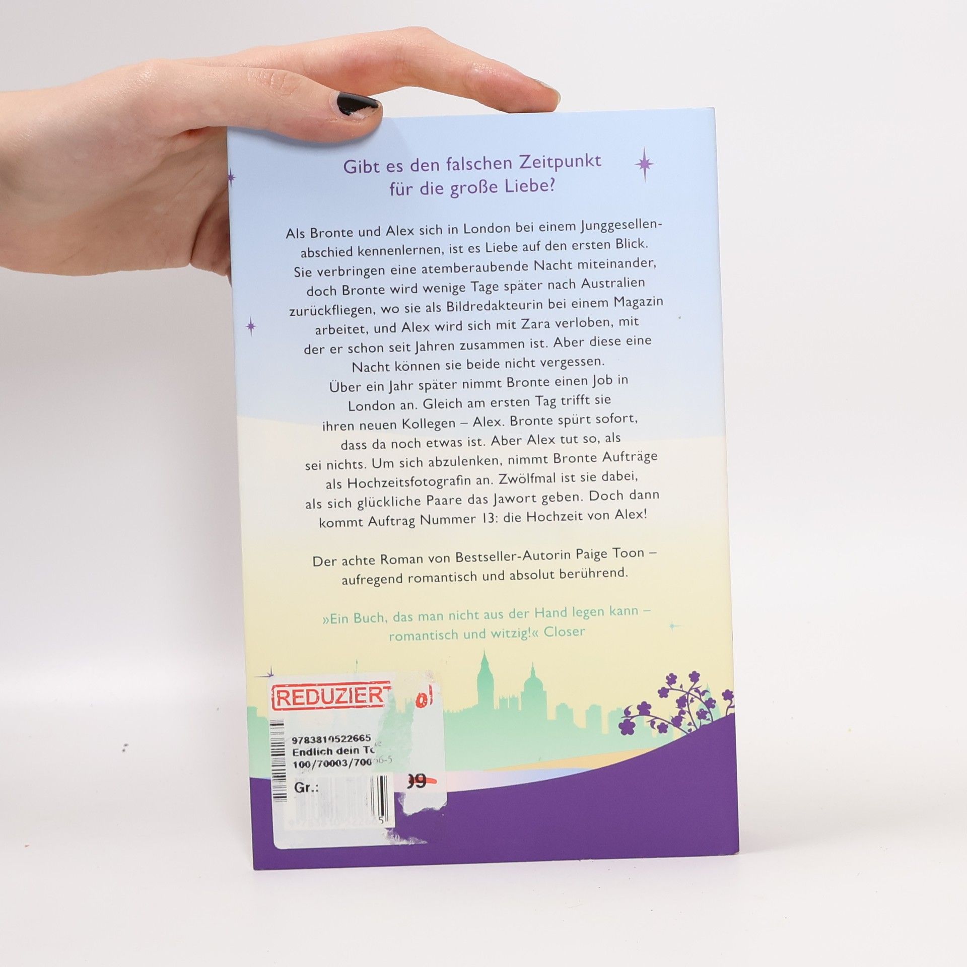 Gibt es den falschen Zeitpunkt für die große Liebe? Der 8. Roman von Bestseller-Autorin Paige Toon – aufregend romantisch und absolut berührend. Als Bronte und Alex sich in London bei einem Junggesellenabschied kennenlernen, ist es Liebe auf den ersten Blick. Sie verbringen eine atemberaubende Nacht miteinander, doch Bronte wird wenige Tage später nach Australien zurückfliegen, wo sie als Bildredakteurin bei einem Magazin arbeitet, und Alex wird sich mit Zara verloben, mit der er schon seit Jahren zusammen ist. Aber diese eine Nacht können sie beide nicht vergessen. Über ein Jahre später nimmt Bronte einen Job in London an. Gleich am ersten Tag trifft sie auf ihren neuen Kollegen – Alex. Bronte spürt sofort, dass da noch etwas ist. Aber Alex tut so, als sei nichts. Um sich abzulenken, nimmt Bronte Aufträge als Hochzeitsfotografin an. Zwölfmal ist sie dabei, als sich glückliche Paare das Jawort geben. Doch dann kommt Auftrag Nummer 13: die Hochzeit von Alex! Paige Toon feierte große Erfolge mit folgenden Romanen und E-Novellas: ›Lucy in the sky‹, ›Sommer für immer‹, ›Du bist mein Stern‹, ›Einmal rund ums Glück‹, ›Diesmal für immer‹, ›Immer wieder du‹, ›Ohne dich fehlt mir was‹, ›Johnnys kleines Geheimnis‹ und ›Ohne dich keine Weihnacht‹.