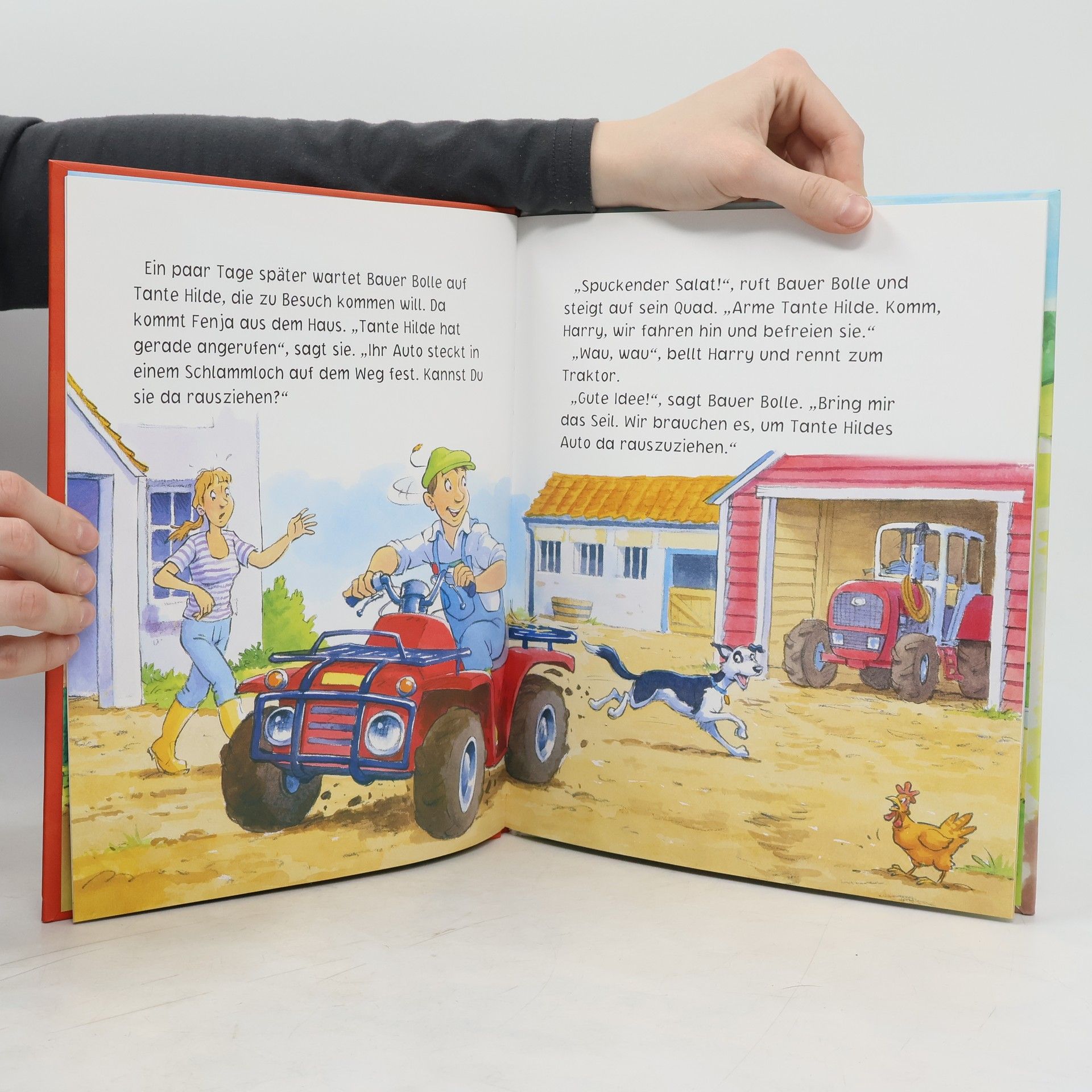 Lustige Bauernhofgeschichte zum Vorlesen und Mitlachen! • Bauer Bolle findet immer eine Lösung: Eine spannende Geschichte mit lustiger Erfindung und überraschender Wendung! • Liebenswerte Bauernhof-Bewohner: ein freundlicher Bauer, ein roter Traktor und jede Menge lustige Tiere! • Umschlag extraknuffig für kleine Kinderhände und mit edlem Glanzeffekt In diesem liebenswert und kunterbunt illustrierten Bilderbuch erwartet Kinder ein weiteres lustiges Abenteuer mit Bauer Bolle und seinen Tieren. Die Aufregung ist groß: Bauer Bolles neues Quad ist endlich da – und es ist besser als jeder Traktor. Aber kann es auch das Auto von Tante Hilde aus dem Matsch ziehen? Keine Bange – Bauer Bolle hat eine Idee! Dem beliebten Zeichner Steve Smallman gelingt es ganz wunderbar, die liebenswerten Charaktere seiner Bauernhofgeschichten mit leichtem Strich und viel Humor kindgerecht und mit starkem Ausdruck aufs Papier zu bringen. Kinder freuen sich auf ein Wiedersehen mit dem treuen Hirtenhund Harry, Fred, dem frechen Ferkel, und Pjotr, Bauer Bolles starkem Pferd. Wer kann die lustige Scherzfrage am Anfang des Buches beantworten? Die letzte Seite verrät die Lösung - aber erst einmal sollte man natürlich selbst überlegen!