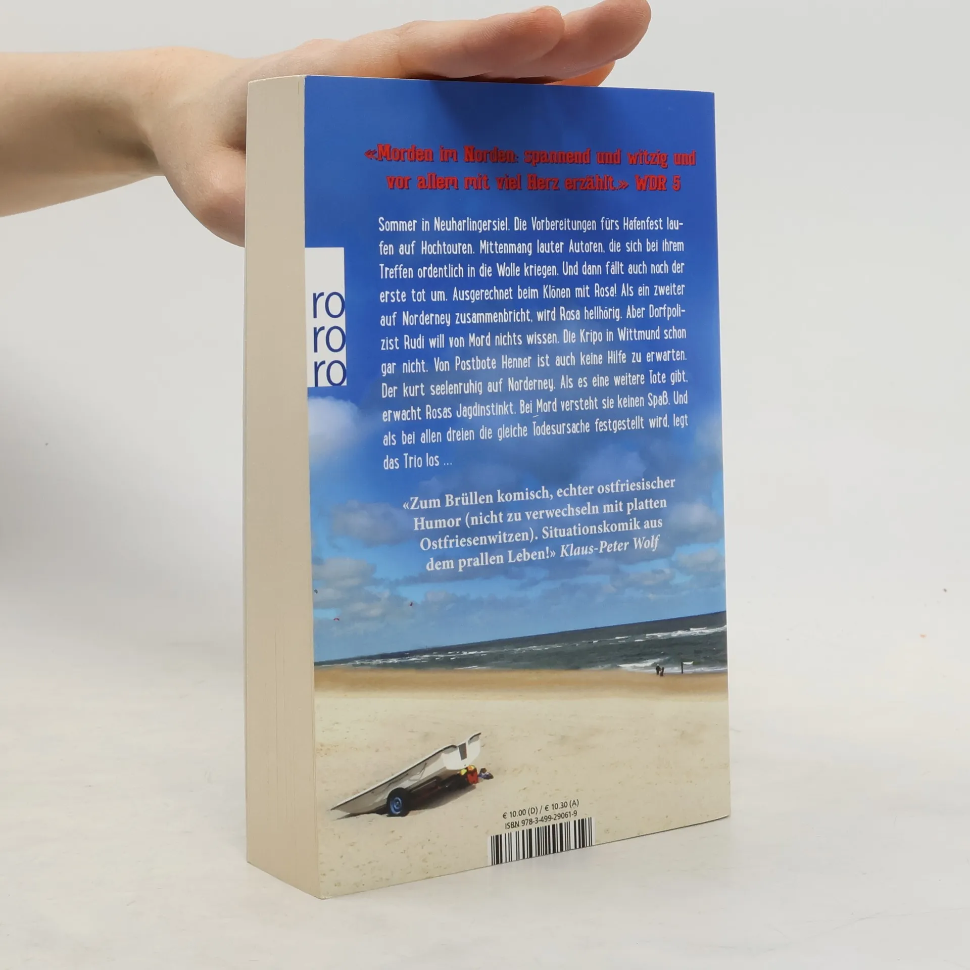 In ihrem vierten Fall ermittelt das ostfriesische Kulttrio auch auf den Inseln Norderney, Wangerooge und Spiekeroog. Sommer in Neuharlingersiel. Die Vorbereitungen zum Hafenfest laufen auf Hochtouren. Mittenmang lauter Autoren, die sich bei ihrem Treffen ordentlich in die Wolle kriegen. Und dann fällt auch noch der erste tot um. Ausgerechnet beim Klönen mit Rosa! Als ein zweiter auf Norderney zusammenbricht, wird Rosa hellhörig. Aber Dorfpolizist Rudi will von Mord nichts wissen. Die Kripo in Wittmund schon gar nicht. Von Postbote Henner ist auch keine Hilfe zu erwarten. Der kurt seelenruhig auf Norderney. Als es eine weitere Tote gibt, erwacht Rosas Jagdinstinkt. Bei Mord versteht sie keinen Spaß. Und als bei allen dreien die gleiche Todesursache festgestellt wird, ist das Trio in Alarm …