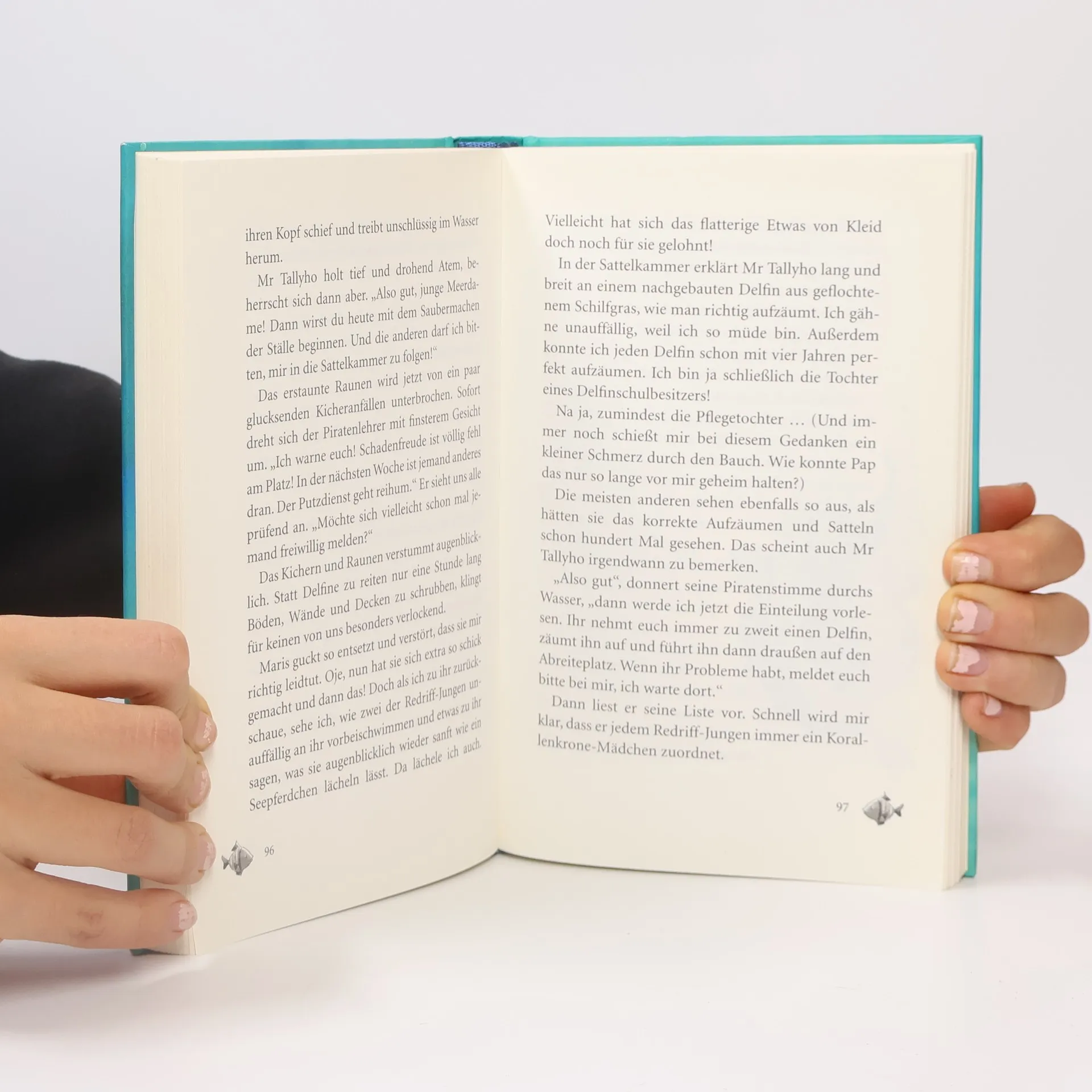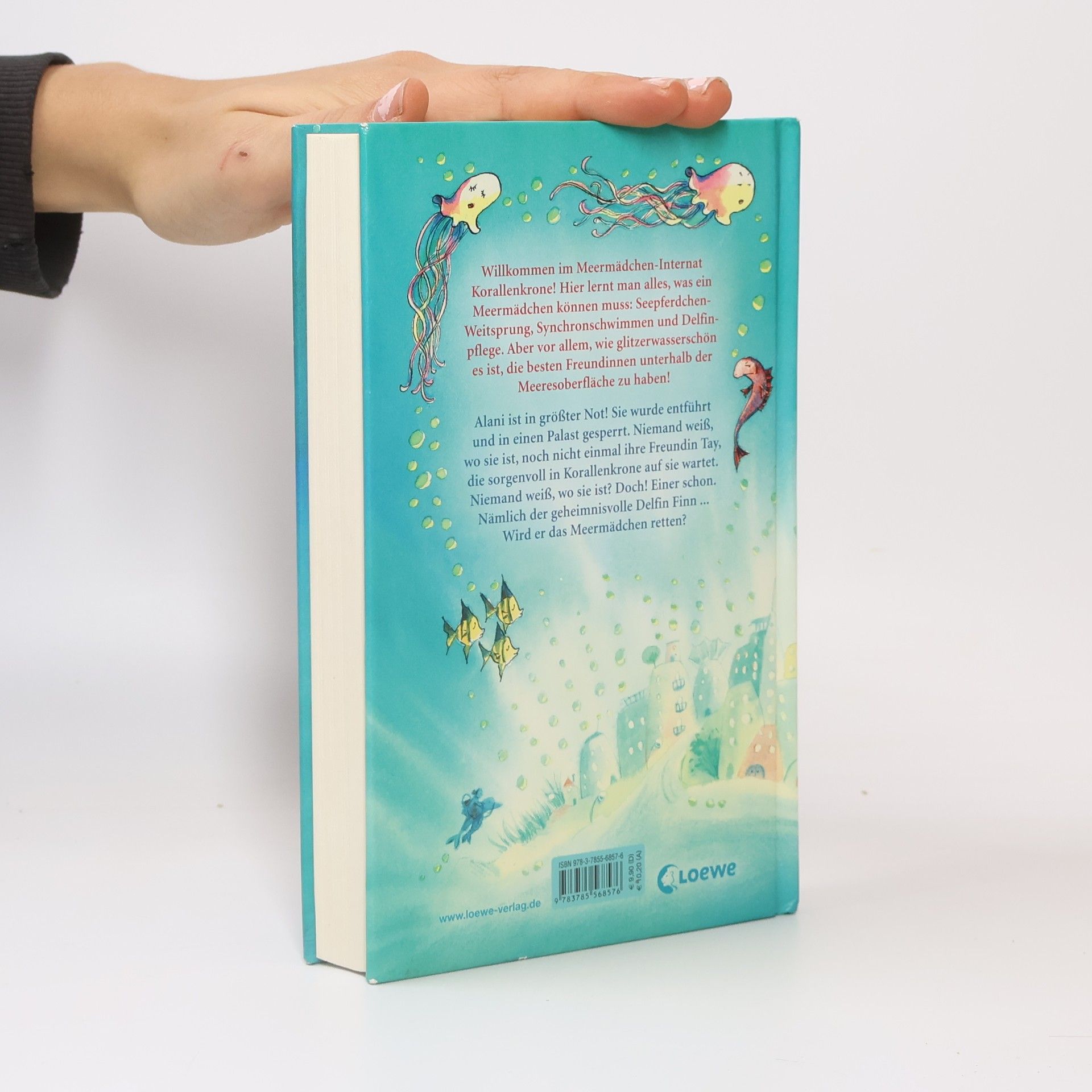 Willkommen im Meermädchen-Internat Korallenkrone! Hier lernt man alles, was ein Meermädchen können muss: Seepferdchen-Weitsprung, Synchronschwimmern und Delfin-pflege. Aber vor allem, wie glitzerwasserschön es ist, die besten Freundinnen unterhalb der Meeresoberfläche zu haben! Alani ist in größter Not! Sie wurde entführt und in einen Palast gesperrt. Niemand weiß, wo sie ist, noch nicht einmal ihre Freundin Tay, die sorgenvoll in Korallenkrone auf sie wartet. Niemand weiß wo sie ist? Doch! Einer weiß es. Nämlich der geheimnisvolle Delfin Finn. Wird er das Meermädchen retten?