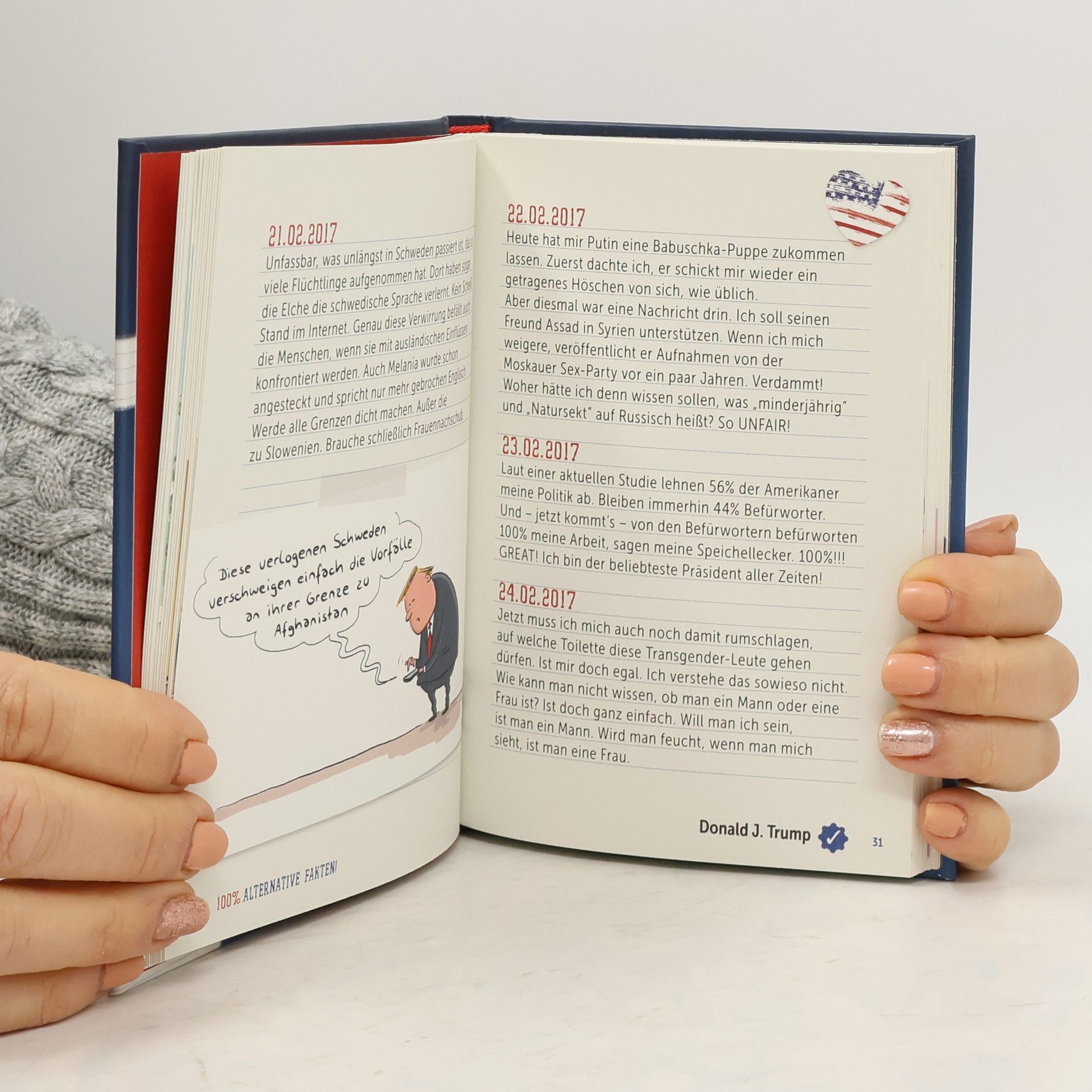 Nach 100 Tagen im Amt: Haben Sie sich immer schon gefragt, was Donald Trump wirklich denkt? Dann sollten Sie unbedingt einen Blick in dieses streng geheime Tagebuch des Donald J. Trump werfen, das Ihnen einen intimen, zu 100% auf alternativen Fakten beruhenden, Einblick in das Leben und die Gedankenwelt des mächtigsten siebzigjährigen Kindes der Welt gewährt. Ausgestattet mit den besten Trump -Cartoons!