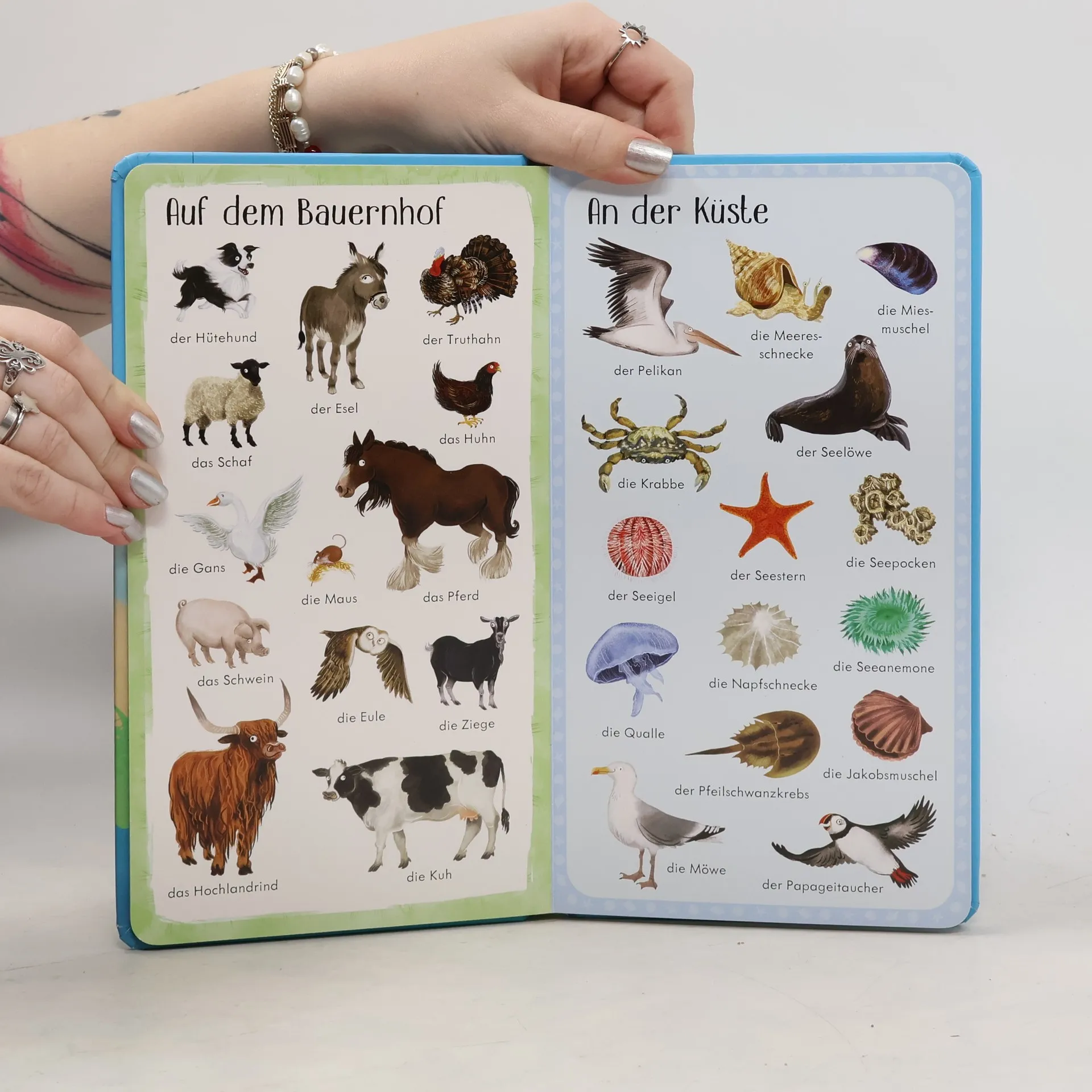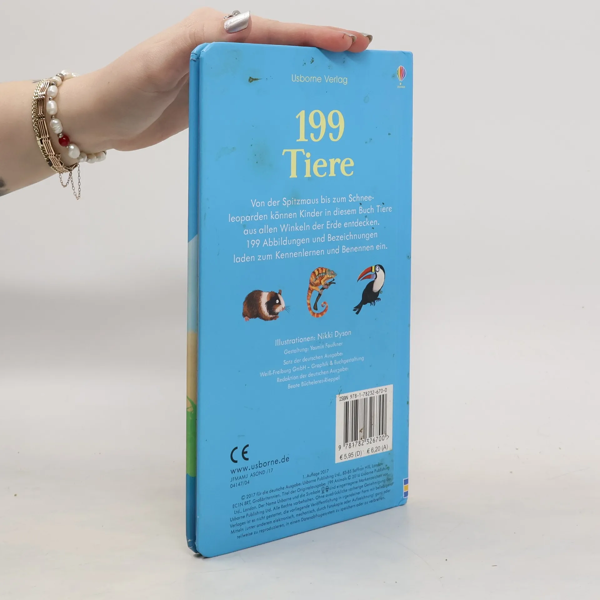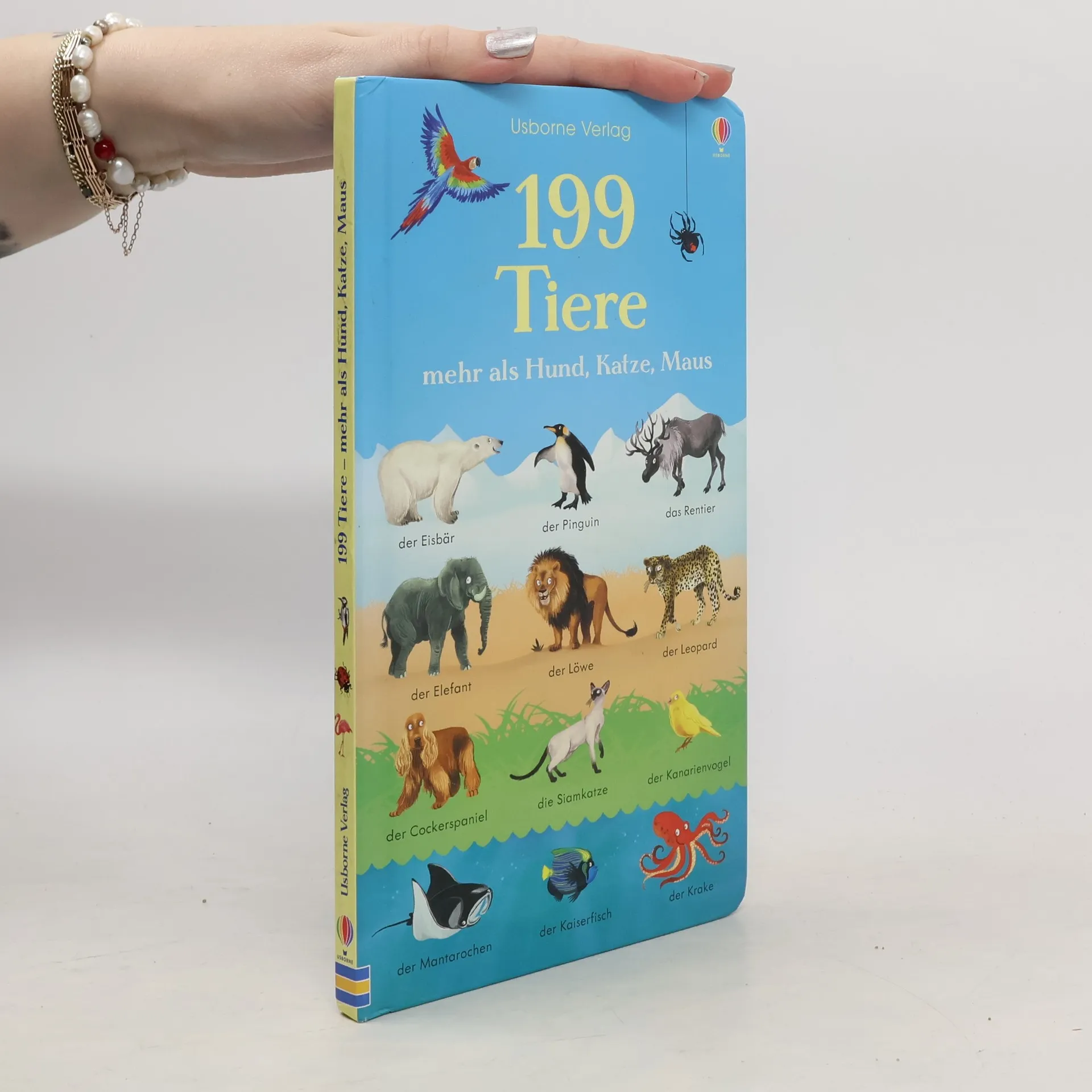 "1.000 Tiere" ist der Titel, der vom selben Illustrator vor 4 Jahren erschien. Der vorliegende kleinere und schmalere Band dürfte eine Auswahl daraus darstellen. Hier finden wir, eingeteilt in 13 Kapitel (keine Kapitelübersicht und kein Register vorhanden) Tiere "aus allen Winkeln der Erde" abgebildet: Angefangen von Haus und Garten, Wald und Feld, Küste und Meer bis zum Regenwald und Australien. Jede Doppelseite zeigt etwa 20 bis 30 Tiere, wobei auch weniger übliche Arten vorkommen, z. B. bei den Haustieren Frettchen, Landschildkröte und Eidechse. Man hat sich an naturnahe Darstellungen gehalten - aber die meisten Tiere schauen den kindlichen Betrachter mit Knopfaugen an, was ihnen leicht etwas Plüschtierhaftes gibt. Der robuste und "griffige" Band, der sich auf Tierabbildungen und Bezeichnungen beschränkt, kann als Lexikon für Vorschul- und Grundschulkinder dienen, das Cover zeigt schon einladend 12 Ausschnitte aus der Sammlung. Als nicht unattraktiver Zusatztitel überall brauchbar. Ab 5 J