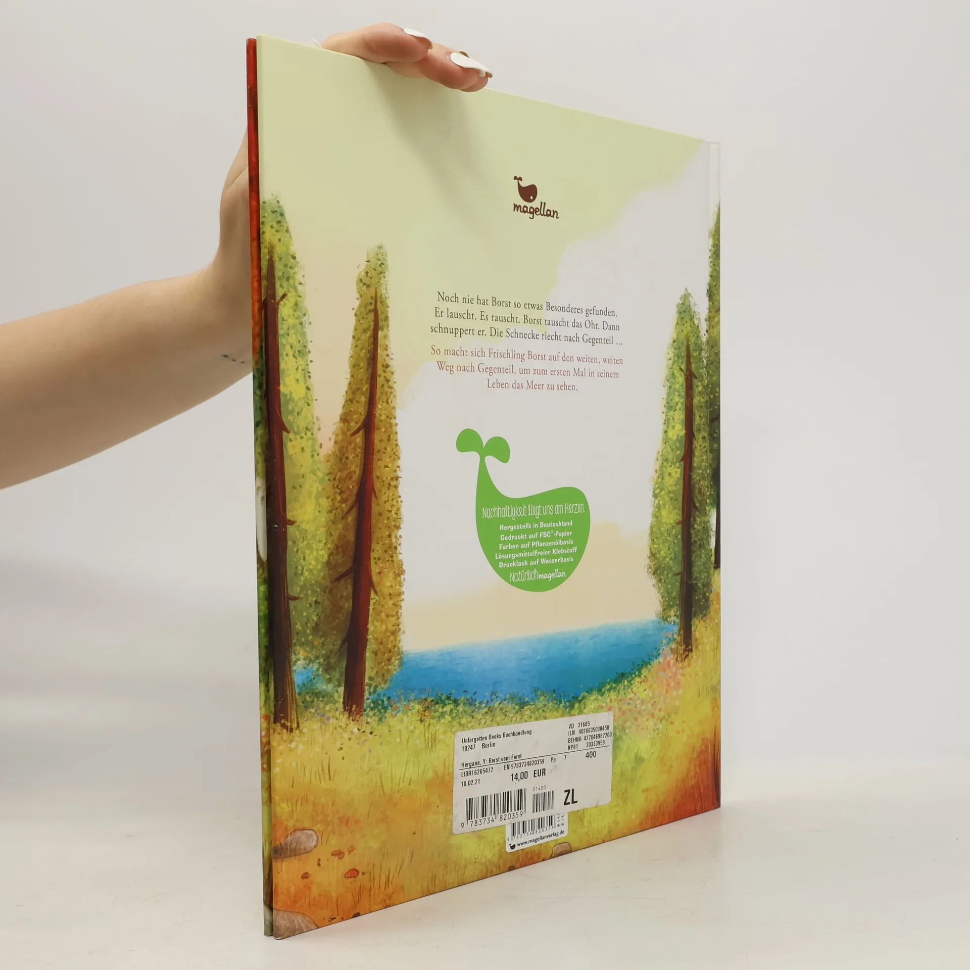 Eines Tages findet Frischling Borst eine Meeresschnecke im Wald. Die duftet so wunderbar nach Gegenteil. Unbedingt will Borst die Schnecke nach Hause bringen. Aber der Weg zum Meer ist weit und gefährlich … Eine poetische Bilderbuchgeschichte, die davon erzählt, dass auch ein kleines Wildschwein das Meer erreichen kann, wenn es nur wirklich will.