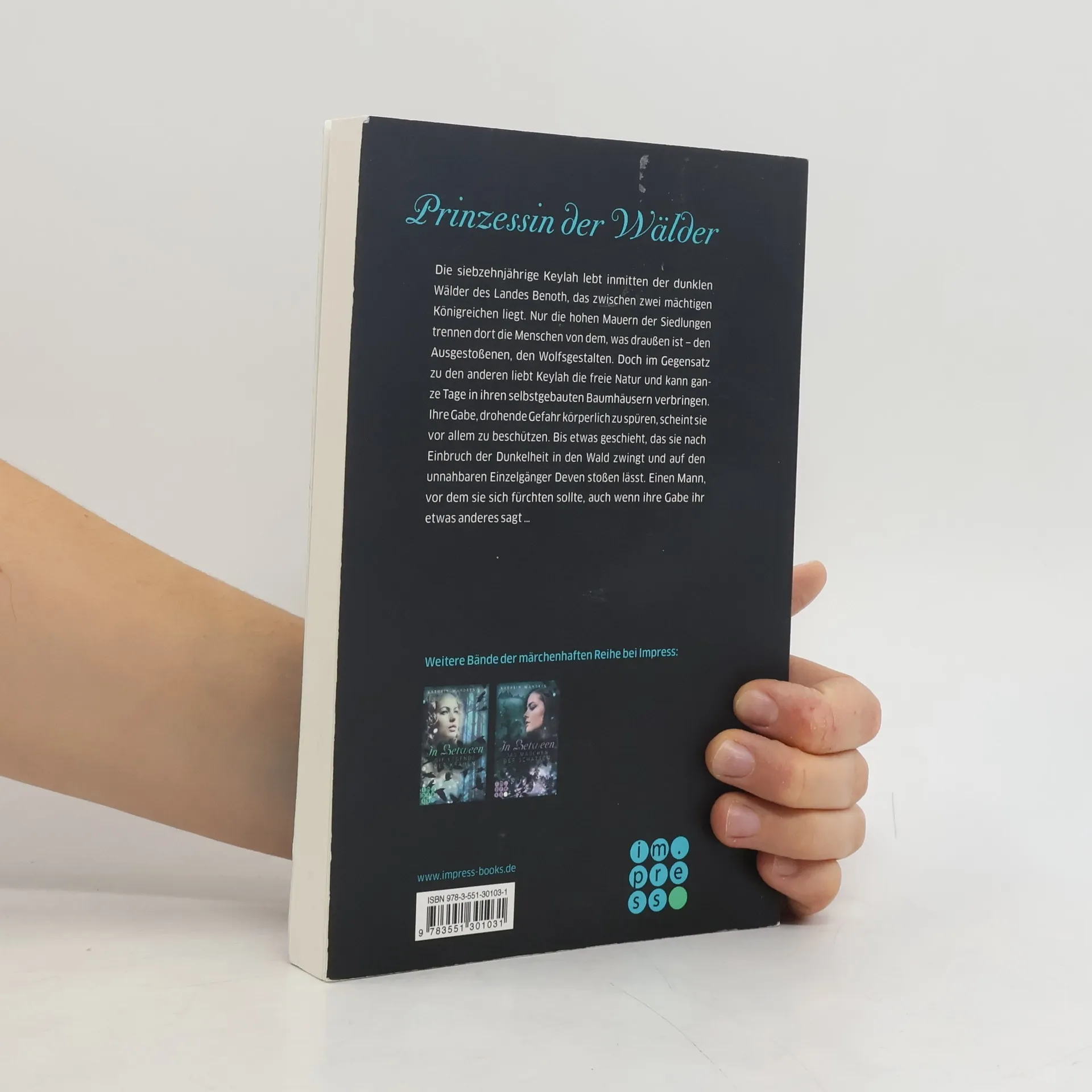**Prinzessin der Wälder** Die 17-jährige Keylah lebt inmitten der dunklen Wälder des Landes Benoth, das zwischen zwei mächtigen Königreichen liegt. Nur die hohen Mauern der Siedlungen trennen dort die Menschen von dem, was draußen ist – den Ausgestoßenen, den Wolfsgestalten. Doch im Gegensatz zu den anderen liebt Keylah die freie Natur und kann ganze Tage in ihren selbstgebauten Baumhäusern verbringen. Ihre Gabe, drohende Gefahr körperlich zu spüren, scheint sie vor allem zu beschützen. Bis etwas geschieht, das sie nach Einbruch der Dunkelheit in den Wald zwingt und auf den unnahbaren Einzelgänger Deven stoßen lässt. Einen Mann, vor dem sie sich fürchten sollte, auch wenn ihre Gabe ihr etwas anderes sagt… //Alle Bände der märchenhaften Trilogie »In Between«: -- Band 1: In Between. Das Geheimnis der Königreiche -- Band 2: In Between. Die Legende der Krähen -- Band 3: In Between. Das Mädchen der Schatten// Alle Bände der Reihe können unabhängig voneinander gelesen werden und haben ein abgeschlossenes Ende.