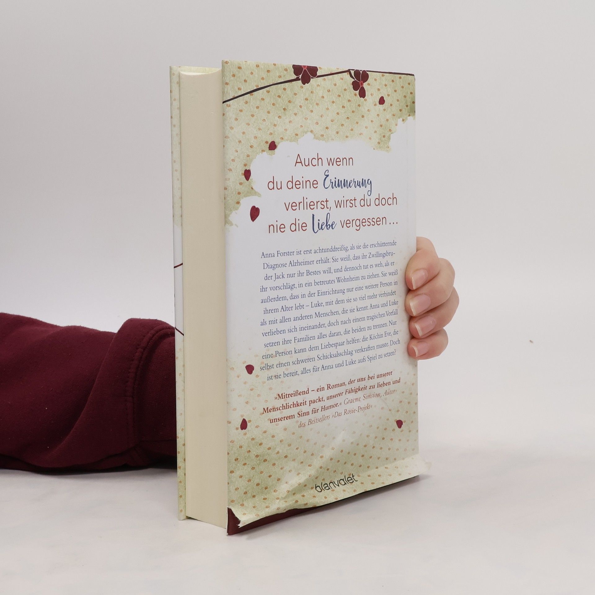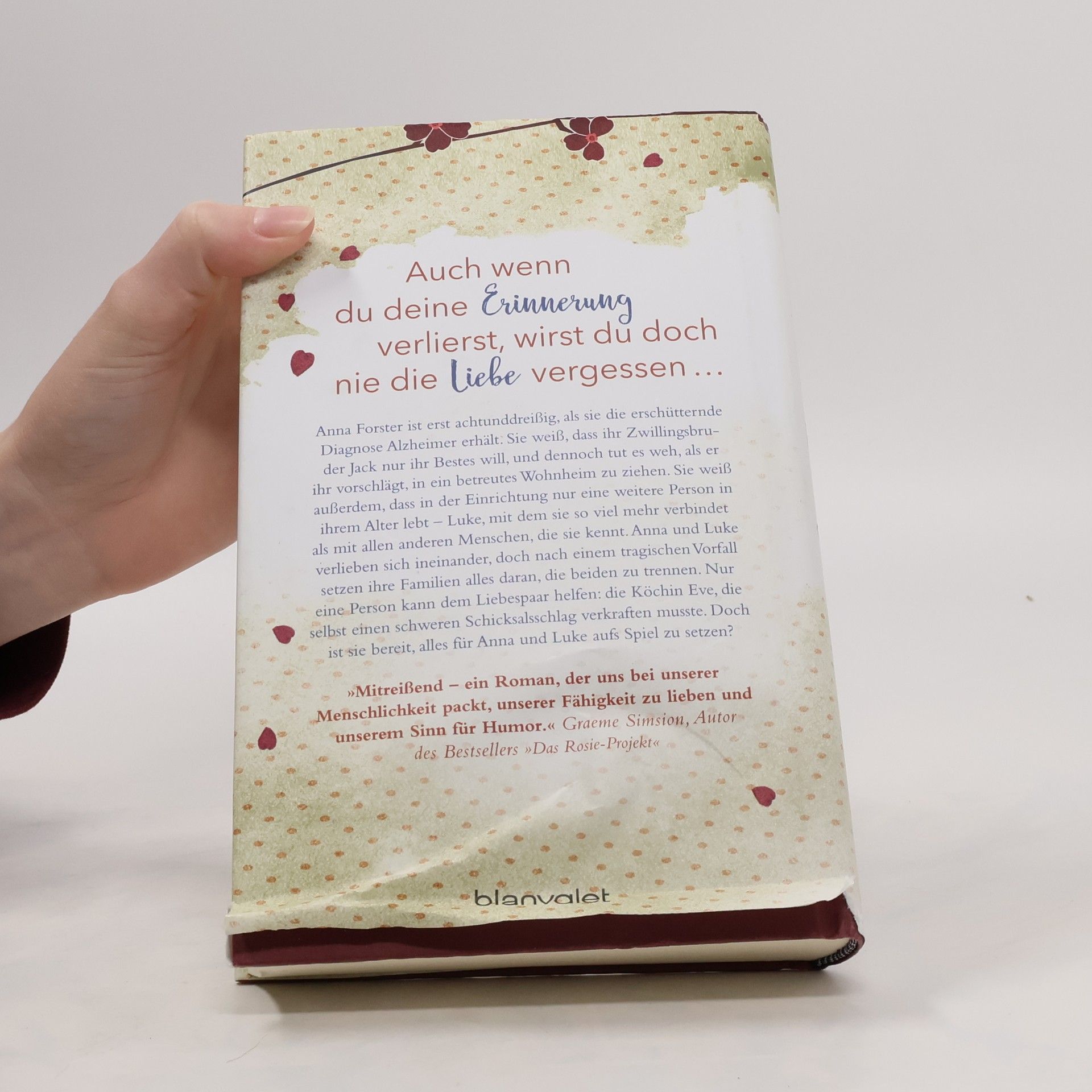 Auch wenn du deine Erinnerung verlierst, wirst du doch nie die Liebe vergessen … Anna Forster ist erst achtunddreißig, als sie die erschütternde Diagnose Alzheimer erhält. Sie weiß, dass ihr Zwillingsbruder Jack nur ihr Bestes will, und dennoch tut es weh, als er ihr vorschlägt, in ein betreutes Wohnheim zu ziehen. Sie weiß außerdem, dass in der Einrichtung nur eine weitere Person in ihrem Alter lebt – Luke, mit dem sie so viel mehr verbindet als mit allen anderen Menschen, die sie kennt. Anna und Luke verlieben sich ineinander, doch nach einem tragischen Vorfall setzen ihre Familien alles daran, die beiden zu trennen. Nur eine Person kann dem Liebespaar helfen: die Köchin Eve, die selbst einen schweren Schicksalsschlag verkraften musste. Doch ist sie bereit, alles für Anna und Luke aufs Spiel zu setzen?