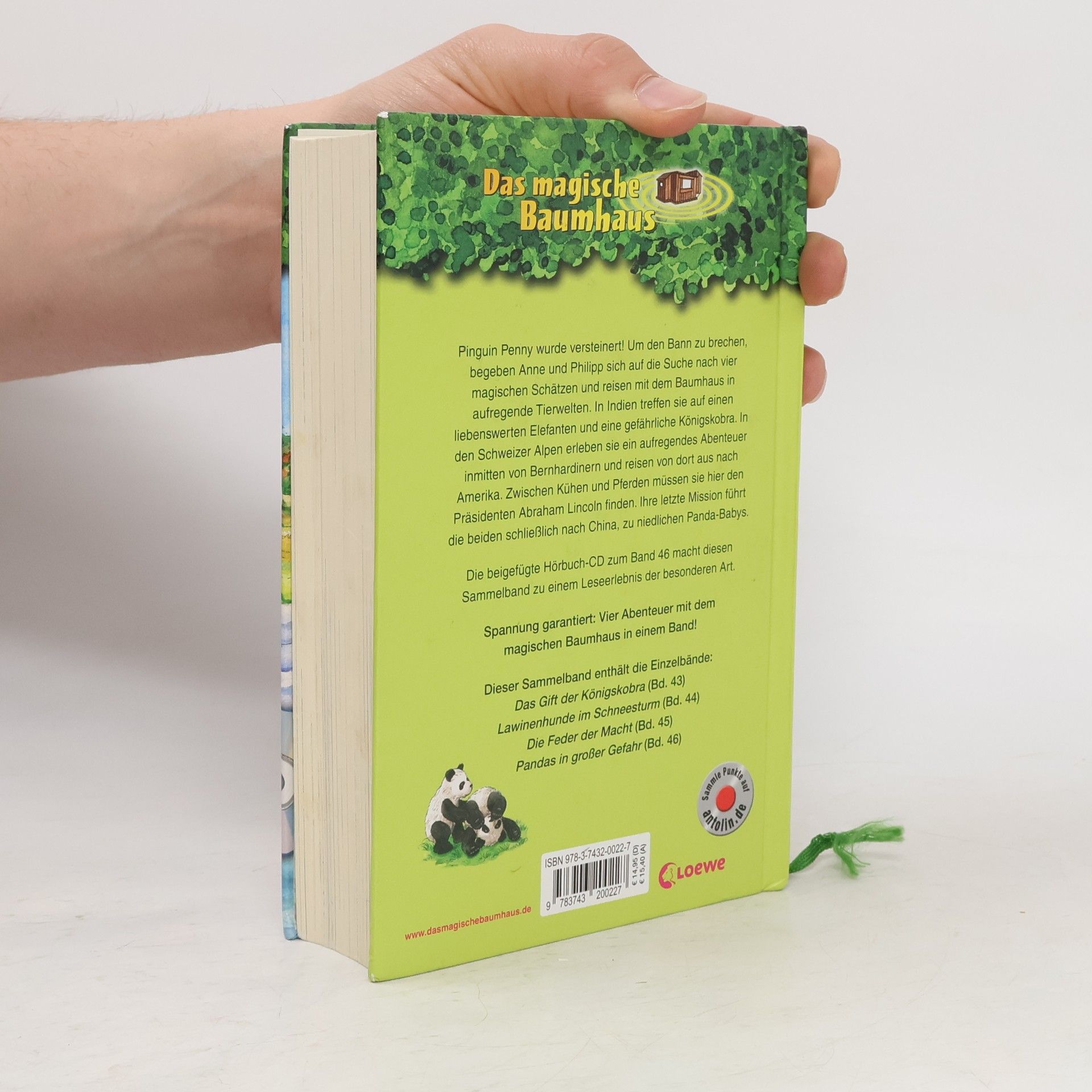 Das Buch ist in Buchhandlungen und Online-Shops erhältlich! Es bietet spannende Themen wie Abenteuer, Tiere und fremde Länder. Mit hochwertigem Hardcover und vielen Illustrationen überzeugt es durch ein ausgewogenes Text-Bild-Verhältnis, große Schrift und kurze Kapitel. In diesem Sammelband sind vier Abenteuer mit dem magischen Baumhaus vereint: Pinguin Penny wurde versteinert, und Anne und Philipp müssen vier magische Schätze finden, um den Bann zu brechen. Ihre erste Reise führt sie nach Indien, wo sie einem liebenswerten Elefanten und einer gefährlichen Königskobra begegnen. In den Schweizer Alpen erleben sie ein aufregendes Abenteuer mit Bernhardinern und reisen anschließend nach Amerika, wo sie den Präsidenten Abraham Lincoln suchen. Ihre letzte Mission führt sie nach China, zu kleinen Panda-Babys. Die beigefügte Hörbuch-CD macht diesen Sammelband zu einem besonderen Leseerlebnis. Er enthält die Einzelbände 43-46: „Das Gift der Königskobra“, „Lawinenhunde im Schneesturm“, „Die Feder der Macht“ und „Pandas in großer Gefahr“. Die beliebte Kinderbuch-Reihe von Bestsellerautorin Mary Pope Osborne lässt die Geschwister Anne und Philipp durch die Zeit reisen, spannende Abenteuer erleben und berühmte Persönlichkeiten kennenlernen. Alle Sammelbände sind bei Antolin gelistet.
