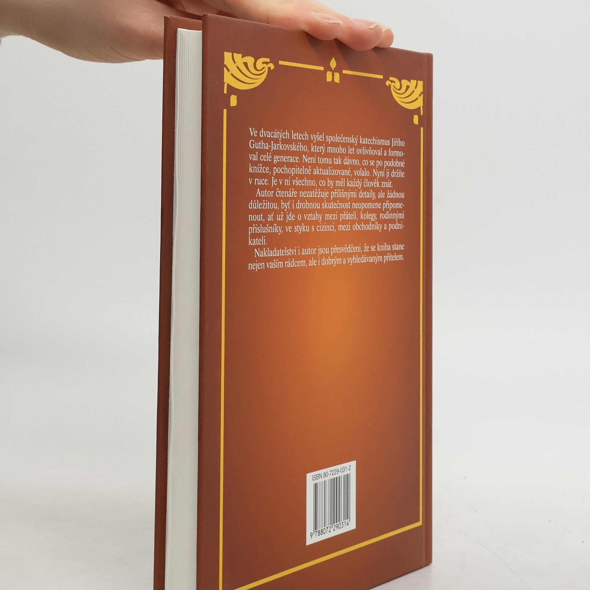 Ve dvacátých letech vyšel společenský katechismus Jiřího Gutha-Jarkovského, který mnoho let ovlivňoval a formoval celé generace. Není tomu tak dávno, co se po podobné knížce, pochopitelně aktualizované, volalo. Nyní ji držíte v ruce. Je v ní všechno, co by měl každý člověk znát. Autor čtenáře nezatěžuje přílišnými detaily, ale žádnou důležitou, byť i drobnou skutečnost neopomene připomenout, ať už jde o vztahy mezi přáteli, kolegy, rodinnými příslušníky, ve styku s cizinci, mezi obchodníky a podnikateli. Nakladatelství i autor jsou přesvědčeni, že se kniha stane nejen vaším rádcem, ale i dobrým a vyhledávaným přítelem.