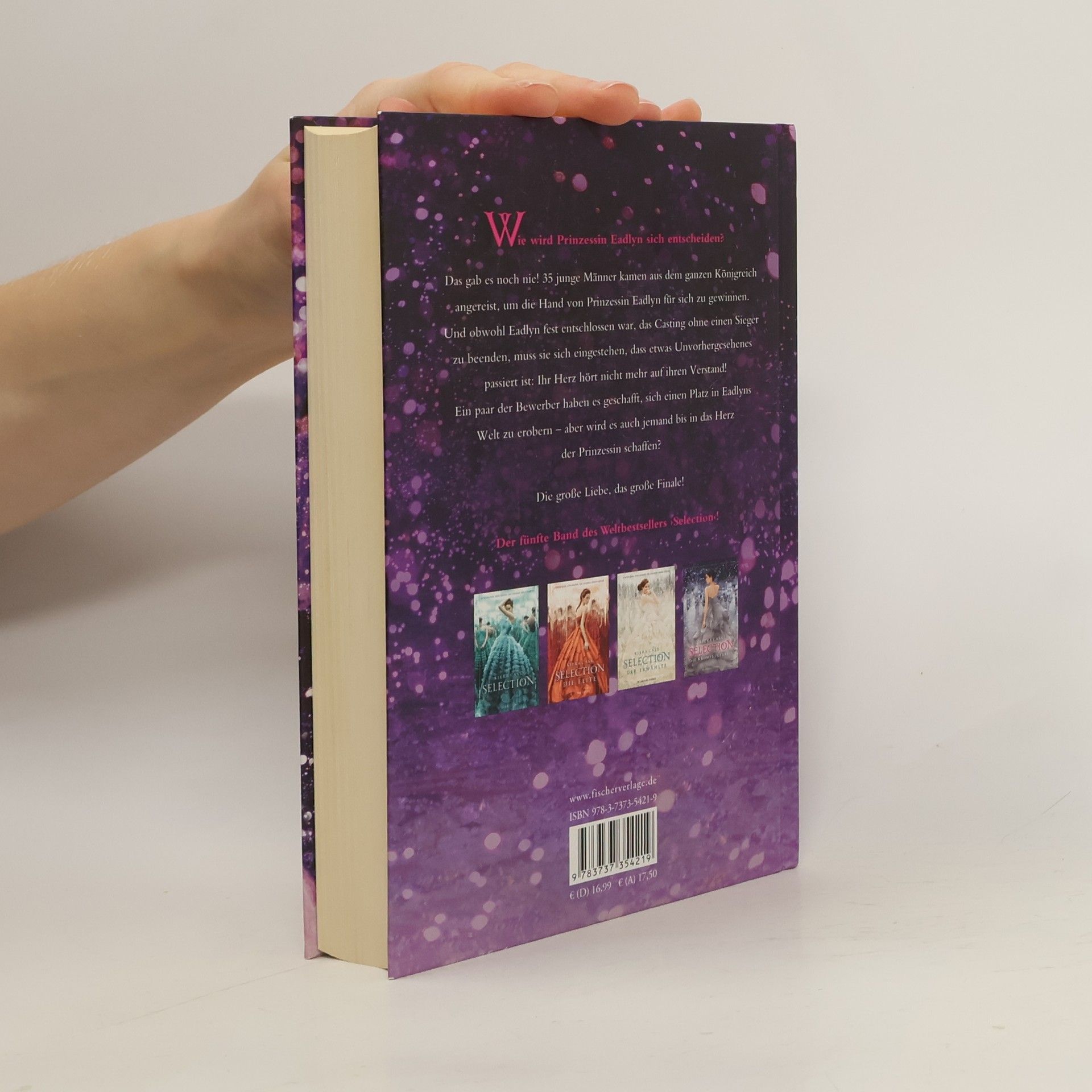 Die große Liebe, das große Finale - darauf haben alle ›Selection‹-Fans gewartet! Als das Casting begann, war Eadlyn wild entschlossen, sich nicht zu verlieben und keinen der Bewerber an sich heranzulassen. Doch nun muss sie sich eingestehen, dass einige von ihnen doch Eindruck bei ihr hinterlassen haben: Henri, der charmante Lockenkopf, und sein bester Freund Erik. Der aufmerksame und rücksichtsvolle Hale. Der selbstsichere und attraktive Ean. Und natürlich Kile, Eadlyns Lieblingsfeind aus Sandkastenzeiten, der sie zu ihrem Ärger immer wieder aus der Reserve lockt. Sie alle haben es geschafft, einen Platz in Eadlyns Welt zu erobern. Aber wird es auch jemand in das Herz der Prinzessin schaffen? Der 5. Band des internationalen Weltbestsellers - wunderbar romantisch und ein krönender Abschluss!