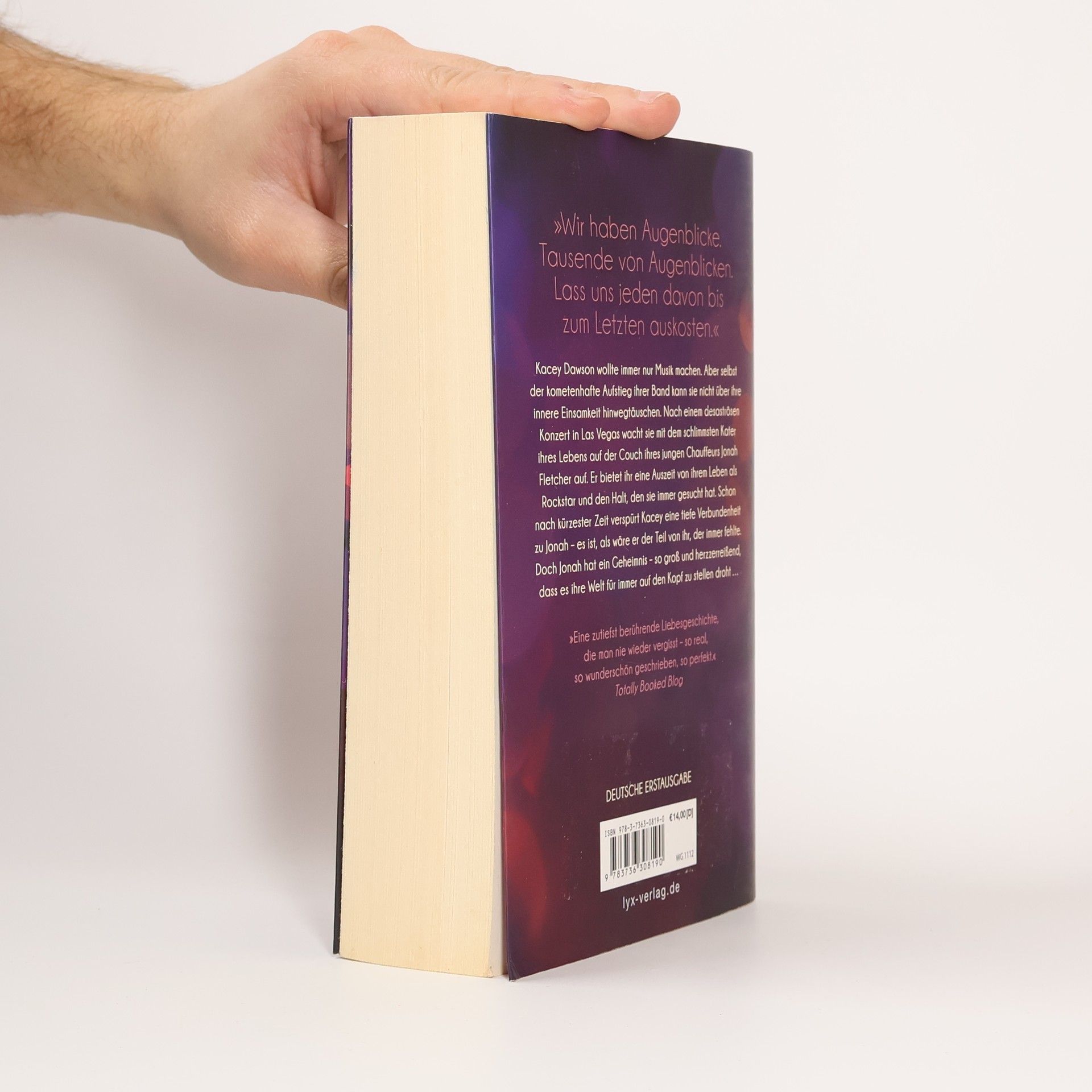 „Wir haben Augenblicke. Tausende von Augenblicken. Lass uns jeden davon bis zum Letzten auskosten.“ Kacey Dawson wollte immer nur Musik machen. Aber selbst der kometenhafte Aufstieg ihrer Band kann sie nicht über ihre innere Einsamkeit hinwegtäuschen. Nach einem desaströsen Konzert in Las Vegas wacht sie mit dem schlimmsten Kater ihres Lebens auf der Couch ihres jungen Chauffeurs Jonah Fletcher auf. Er bietet ihr eine Auszeit von ihrem Leben als Rockstar und den Halt, den sie immer gesucht hat. Schon nach kürzester Zeit verspürt Kacey eine tiefe Verbundenheit zu Jonah - es ist, als wäre er der Teil von ihr, der immer fehlte. Doch Jonah hat ein Geheimnis - so groß und herzzerreißend, dass es ihre Welt für immer auf den Kopf zu stellen droht ... „Eine zutiefst berührende Liebesgeschichte, die man nie wieder vergisst - so real, so wunderschön geschrieben, so perfekt.“ Totally Booked Blog Band 1 des All-In-Duetts