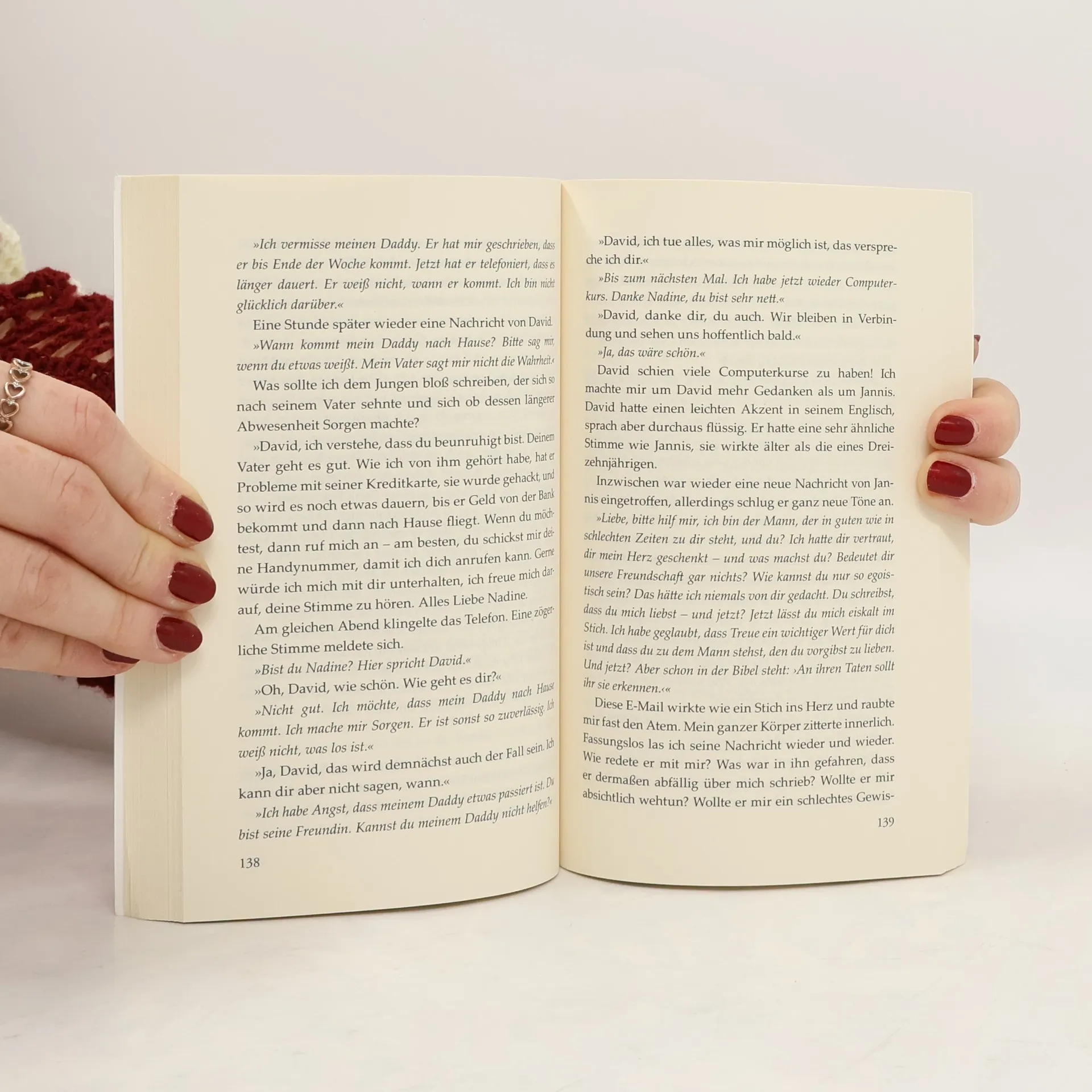 Nadine wird prophezeit, dass sie wunderbare Liebesaspekte in ihrem Horoskop hat. Nach ihrer letzten Beziehung hatte sie sich geschworen, sich nie mehr auf einen Mann einzulassen. Zunächst skeptisch, dann doch neugierig, lernt sie über Facebook den attraktiven, erfolgreichen Jannis aus Kalifornien kennen. Durch dessen Offenheit und kontinuierliche Zuneigung fasst sie langsam wieder Vertrauen. Doch wer ist dieser charmante Mann wirklich, in den sie sich verliebt hat? Nach und nach enthüllen sich dessen wohl gehütete Geheimnisse, dabei übertrifft die Realität all ihre Fantasien und führt immer wieder zu neuer Aufregung und Verwirrung. Nadine wünscht sich so sehr eine gemeinsame Zukunft und hat dennoch ein zunehmend ungutes Gefühl, das immer stärker wird. Was ist wahr und was nicht? Dieser Roman beruht auf wahren Begebenheiten und kann durchaus als Warnung verstanden werden.