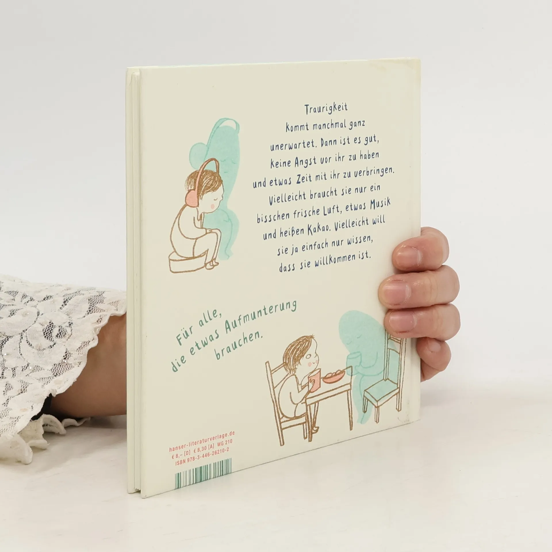 Manchmal kommt Traurigkeit ganz unerwartet und lässt einen nicht mehr los. Dann ist es gut, keine Angst vor ihr zu haben! Am besten gibt man ihr einen Namen, hört ihr zu und verbringt etwas Zeit mit ihr. Vielleicht will sie einfach nur wissen, dass sie willkommen ist. Vielleicht braucht sie nur ein bisschen frische Luft, etwas Musik und heißen Kakao. Vielleicht will sie sich einfach nur neben einen Freund schlafen legen. Und wenn man aufwacht, ist sie weg. – Ein hilfreiches Geschenk- und originelles Bilderbuch für alle, die traurig sind und etwas Aufmunterung brauchen. Überraschend und einfühlsam illustriert von Eva Eland.