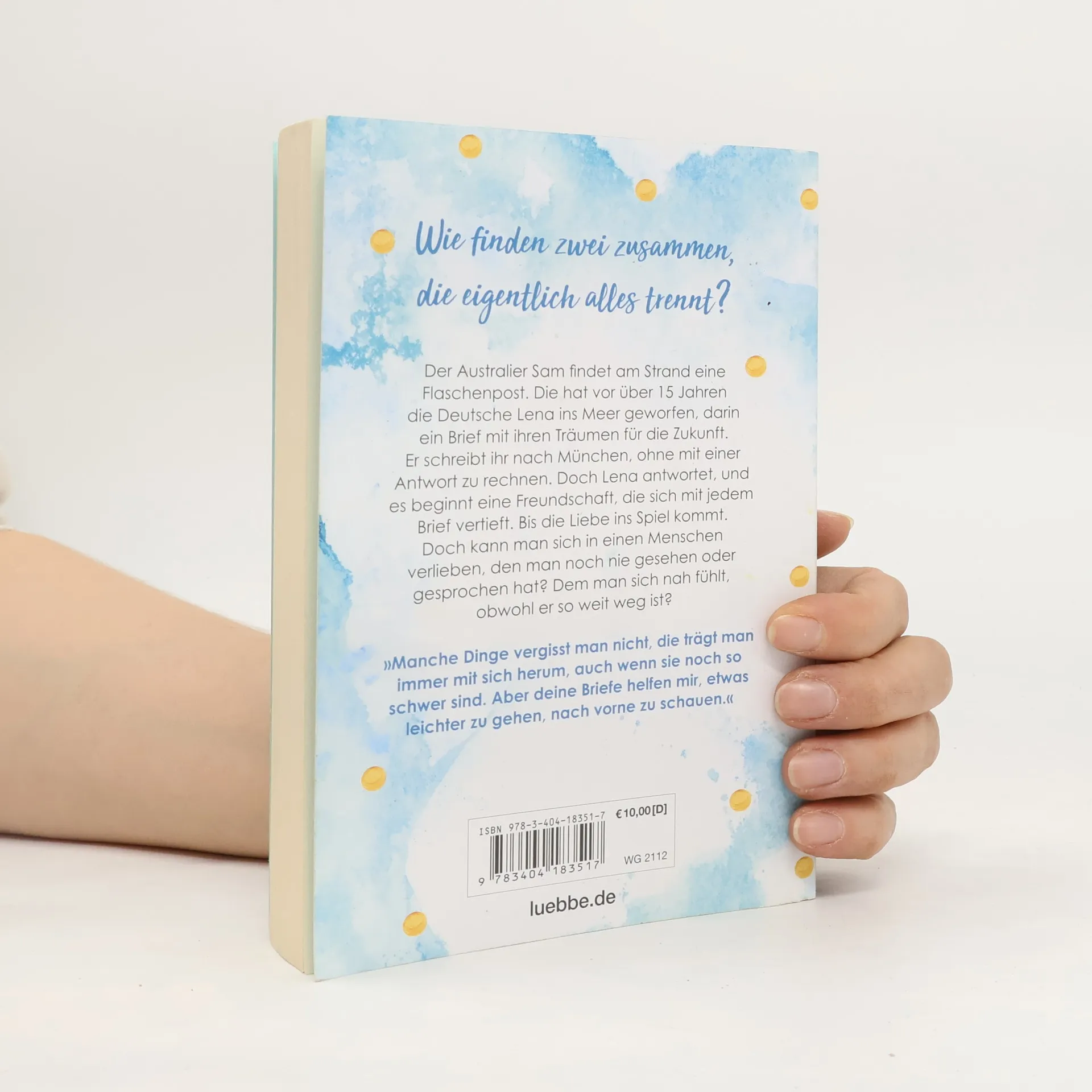 Der Australier Sam findet auf seiner Joggingrunde eine Flaschenpost. Die hat vor über fünfzehn Jahren die junge Deutsche Lena am Ende ihres Work & Travel-Jahres ins Meer geworfen, darin ein Brief mit ihren Wünschen und Träumen für die Zukunft. Er schreibt ihr, ohne mit einer Antwort zu rechnen. Doch Lena bedankt sich beim Finder, und es beginnt eine Freundschaft, die sich mit jedem Brief vertieft. Bis die Liebe ins Spiel kommt. Doch kann man sich in einen Menschen verlieben, den man noch nie gesehen oder gesprochen hat? Dem man sich nah fühlt, obwohl er so weit weg ist?