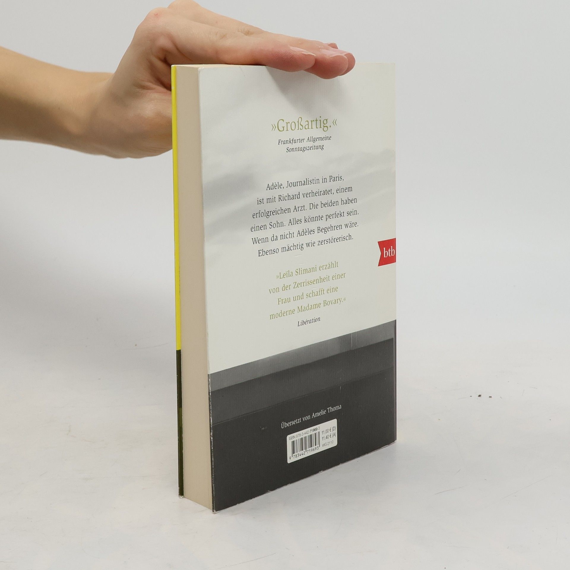 »Die neue Stimme der französischen Literatur.« ZEITmagazin Kann man sich zu seinem Glück zwingen? Prix Goncourt-Preisträgerin Leïla Slimani erzählt von der Zerrissenheit einer Frau. Nach außen hin führt Adèle ein Leben, dem es an nichts fehlt. Sie arbeitet für eine Pariser Tageszeitung, ist unabhängig. Mit ihrem Ehemann, einem Chirurgen, und ihrem kleinen Sohn lebt sie in einem schicken Viertel, ganz in der Nähe von Montmartre. Sie reisen, sie fahren übers Wochenende ans Meer. Dennoch macht Adèle dieses Leben nicht glücklich. Gelangweilt eilt sie durch die grauen Straßen, trifft sich mit Männern, hat Sex mit Fremden. Sie weiß, dass ihr die Kontrolle entgleitet. Sie weiß, dass sie ihre Familie verlieren könnte. Trotzdem setzt sie alles aufs Spiel.