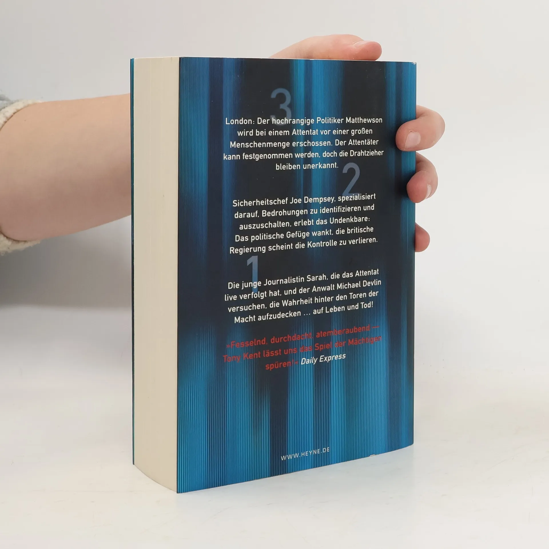 3 London: Der hochrangige Politiker Mathewson wird bei einem Attentat vor einer großen Menschenmenge erschossen. Der Attentäter kann festgenommen werden, doch die Drahtzieher bleiben unerkannt. 2 Sicherheitschef Joe Dempsey, der spezialisiert darauf ist, Bedrohungen zu identifizieren und auszuschalten, erlebt das Undenkbare: Das politische Gefüge wankt, die britische Regierung scheint die Kontrolle zu verlieren. 1 Die junge Journalistin Sarah, die das Attentat live verfolgt hat, und der Anwalt Michael Devlin versuchen, die Wahrheit hinter den Toren der Macht aufzudecken … auf Leben und Tod