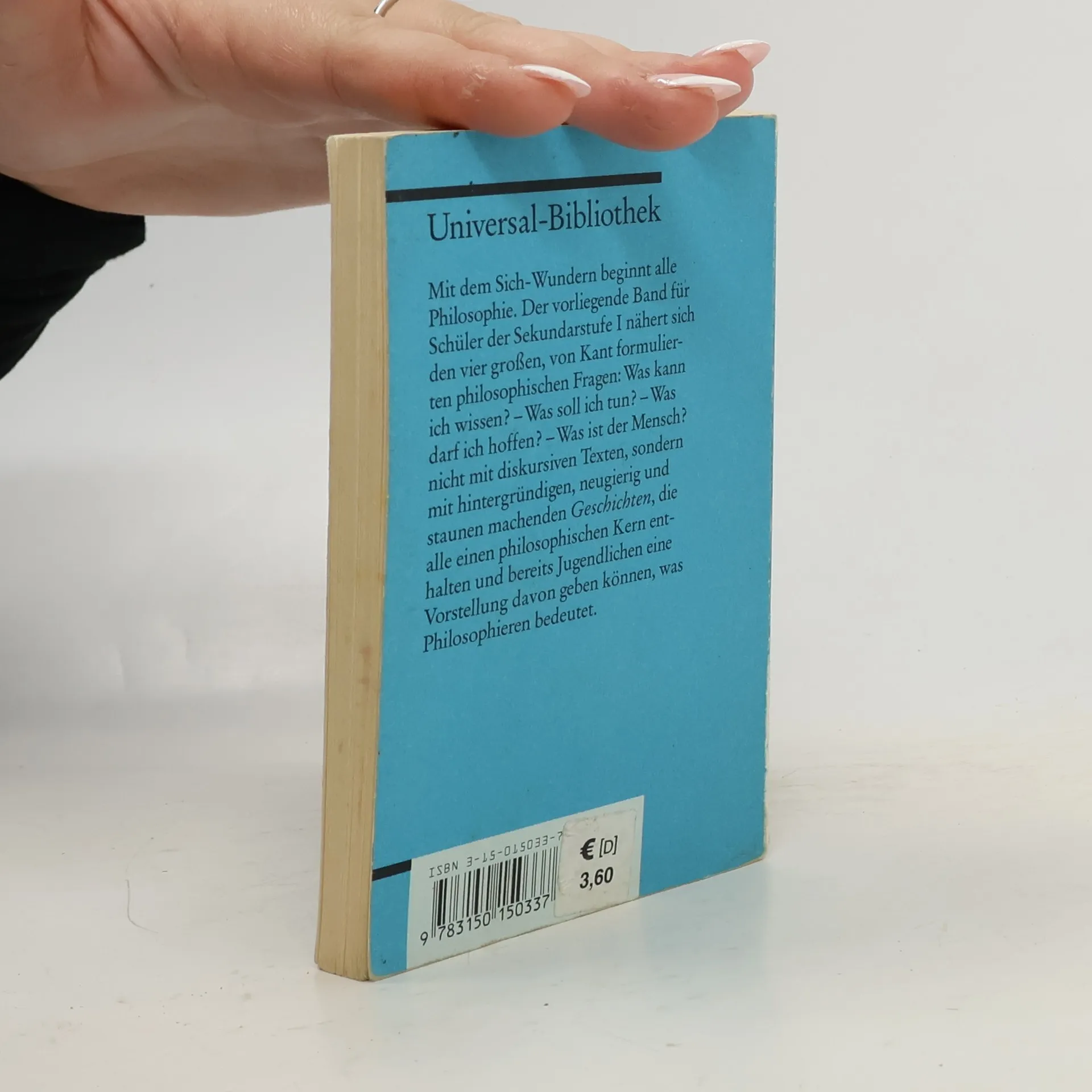 Mit dem Sich-Wundern beginnt alle Philosophie. Der Band für Schüler der Sekundarstufe I nähert sich den vier großen, von Kant formulierten philosophischen Fragen (Was kann ich wissen? – Was soll ich tun? – Was darf ich hoffen? – Was ist der Mensch?) nicht mit diskursiven Texten, sondern mit hintergründigen, neugierig und staunend machenden Geschichten, die alle einen philosophischen Kern enthalten und bereits Jugendlichen eine Vorstellung davon geben können, was Philosophieren bedeutet.
