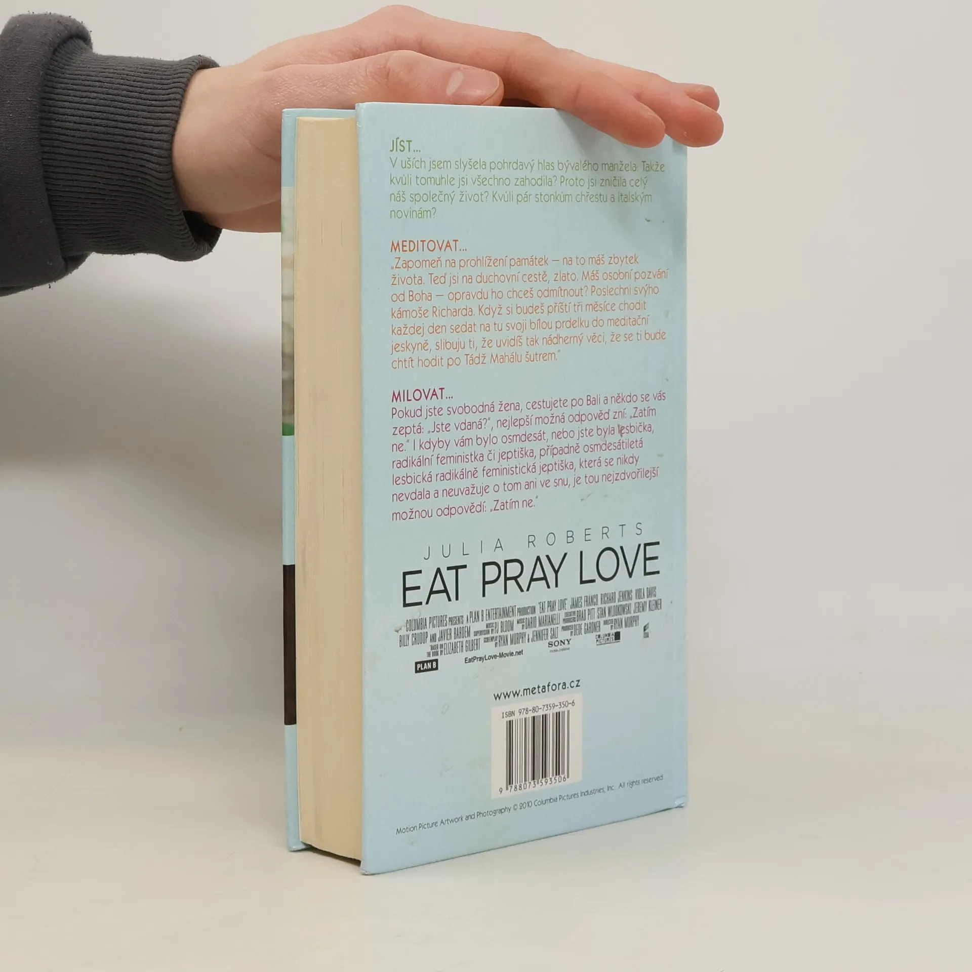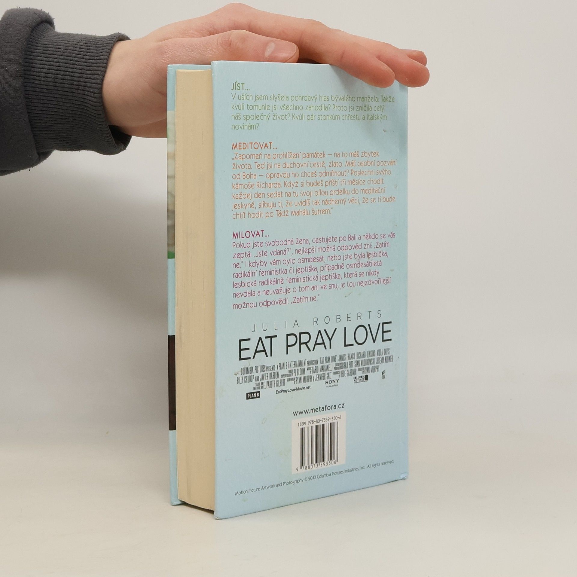 Kdyby šlo dát dvě a půl hvězdy, tak bych dala dvě a půl. Ze všech tří příběhů mě nejvíce bavila Indonésie, protože tam se konečně něco děje. Konečně už totiž Liz nemluvila jen o bohu a o tom jak je nešťastná a osamělá. Konečně si začínala užívat života a to mě bavilo. Chápu, že k tomu nejdřív musela postupně dojít a nebýt její pouti za sebepoznáním a za poznáním boha, tak by k tomu asi nedošla, ale na můj vkus si až moc na všechno stěžovala. A to mě nebavilo. Neustále omílala své problémy dokola. Je tam pár myšlenek, které se mi líbily a nad kterými jsem se pozastavila a zamyslela se. Ale tady musím říct, že film je daleko lepší.