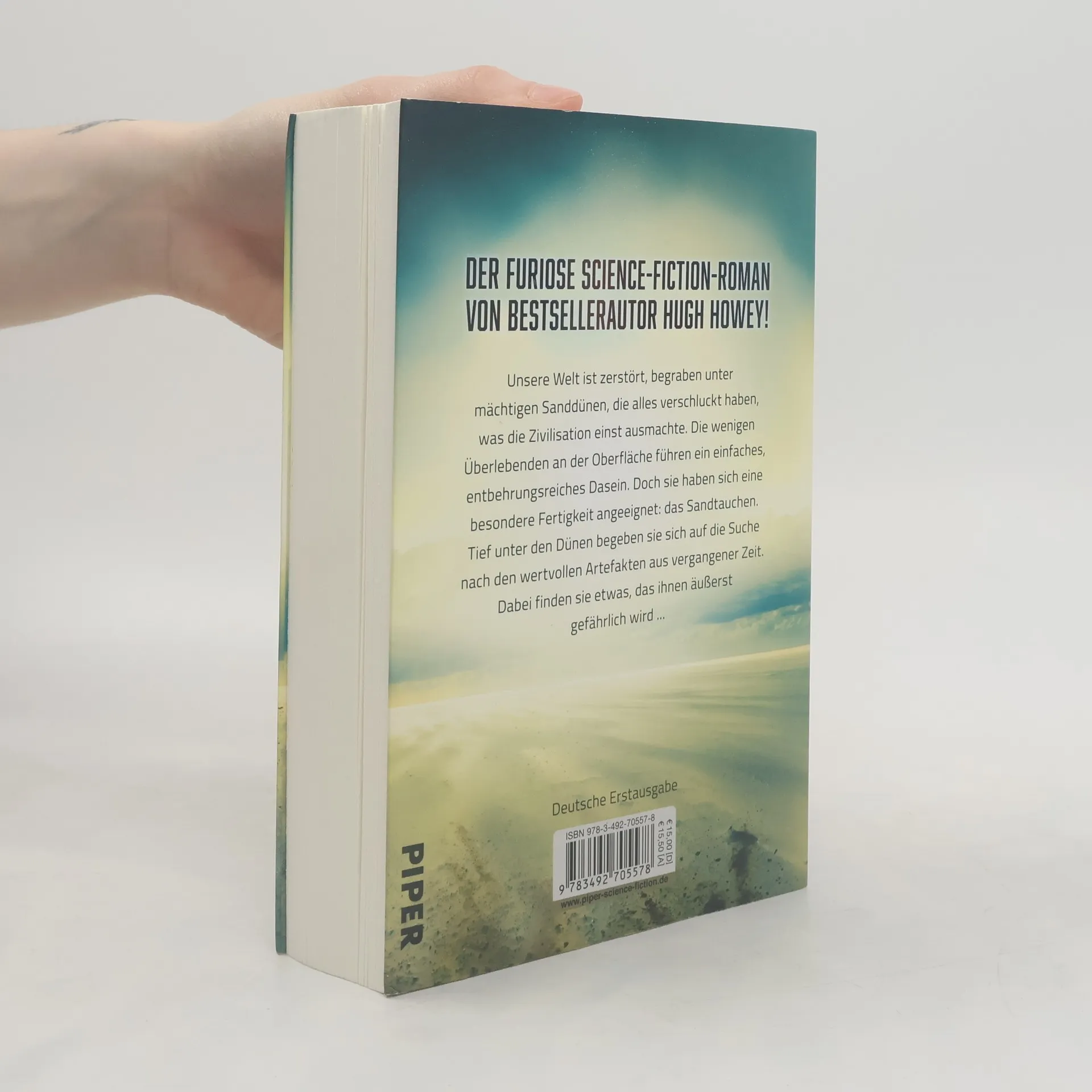 Unsere Welt ist zerstört, begraben unter mächtigen Sanddünen, die alles verschluckt haben, was die Zivilisation einst ausmachte. Die wenigen Überlebenden an der Oberfläche führen ein einfaches, entbehrungsreiches Dasein. Doch sie haben sich eine besondere Fertigkeit angeeignet: das Sandtauchen. Tief unter den Dünen begeben sie sich auf die Suche nach den wertvollen Artefakten aus vergangener Zeit. Dabei finden sie etwas, das ihnen äußerst gefährlich wird ... Der furiose Science-Fiction-Roman von Bestsellerautor Hugh Howey.